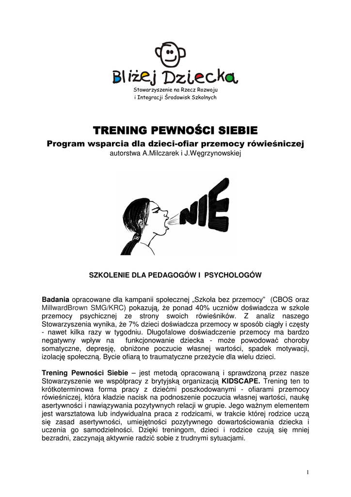 Stowarzyszenie na Rzecz Rozwoju i Integracji Środowisk Szkolnych TRENING PEWNOŚCI SIEBIE Program wsparcia dla dzieci-ofiar przemocy rówieśniczej autorstwa A.Milczarek i J.Węgrzynowskiej SZKOLENIE DLA PEDAGOGÓW I PSYCHOLOGÓW Badania opracowane dla kampanii społecznej „Szkoła bez przemocy” (CBOS oraz MillwardBrown SMG/KRC) pokazują, że ponad 40% uczniów doświadcza w szkole przemocy psychicznej ze strony swoich rówieśników. Z analiz naszego Stowarzyszenia wynika, że 7% dzieci doświadcza przemocy w sposób ciągły i częsty - nawet kilka razy w tygodniu. Długofalowe doświadczenie przemocy ma bardzo negatywny wpływ na funkcjonowanie dziecka - może powodować choroby somatyczne, depresję, obniżone poczucie własnej wartości, spadek motywacji, izolację społeczną. Bycie ofiarą to traumatyczne przeżycie dla wielu dzieci. Trening Pewności Siebie – jest metodą opracowaną i sprawdzoną przez nasze Stowarzyszenie we współpracy z brytyjską organizacją KIDSCAPE. Trening ten to krótkoterminowa forma pracy z dziećmi poszkodowanymi - ofiarami przemocy rówieśniczej, która kładzie nacisk na podnoszenie poczucia własnej wartości, naukę asertywności i nawiązywania pozytywnych relacji w grupie. Jego ważnym elementem jest warsztatowa lub indywidualna praca z rodzicami, w trakcie której rodzice uczą się zasad asertywności, umiejętności pozytywnego dowartościowania dziecka i uczenia go samodzielności. Dzięki treningom, dzieci i rodzice czują się mniej bezradni, zaczynają aktywnie radzić sobie z trudnymi sytuacjami. 1 Szkolenie przeznaczone jest dla pedagogów i psychologów pracujących z dziećmi i młodzieżą w Szkołach Podstawowych, Gimnazjach oraz Poradniach Psychologiczno-Pedagogicznych. Cel szkolenia: Przygotowanie pedagogów i psychologów do samodzielnego realizowania Treningów Pewności Siebie dla dzieci-ofiar przemocy rówieśniczej i ich rodziców. Tematyka szkolenia: 1. Zjawisko agresji i przemocy rówieśniczej. 2. Syndrom dziecka-ofiary przemocy – analiza filmu D.Olweusa, omówienie typów dzieci-ofiar przemocy. 3. Kierunki i metody pomocy dzieciom poszkodowanym. 4. Trening Pewności Siebie – wprowadzenie (historia, założenia, efektywność). 5. Trening Pewności Siebie – zasady i metody naboru dzieci do grup. 6. Trening Pewności Siebie – zajęcia dla dzieci. 7. Trening Pewności Siebie – zajęcia dla rodziców. 8. Trening Pewności Siebie – metody ewaluacji. Forma szkolenia: 2-dniowy warsztat (19h) Uczestnicy szkolenia: Pedagodzy, psycholodzy ze szkół i poradni – maksymalnie 22 osoby. Materiały szkoleniowe: Uczestnicy otrzymują 60-stronicowy przewodnik (skrypt) do prowadzenia treningów oraz zaświadczenie ukończenia szkolenia wystawione przez NPDN „Bliżej Dziecka”. Koszt szkolenia: Koszt warsztatu dla 22 osób wynosi 2600 zł. Koszt obejmuje płace, przejazd, noclegi i wyżywienie trenera, materiały szkoleniowe dla uczestników (22 skrypty), materiały papiernicze oraz obsługę księgową. Kontakt : Joanna Węgrzynowska – koordynator programu Stowarzyszenie „Bliżej Dziecka”, ul. Mokotowska 17/21, 00-640 Warszawa tel. (22) 49 88 000 (wtorki 10.00-15.00), k. 501 308 474 bliż[email protected] www.przemocwszkole.org.pl 2
