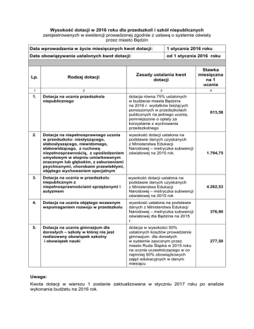 Wysokość dotacji w 2016 roku dla przedszkoli i szkół niepublicznych zarejestrowanych w ewidencji prowadzonej zgodnie z ustawą o systemie oświaty przez miasto Będzin Data wprowadzenia w życie miesięcznych kwot dotacji: 1 stycznia 2016 roku Data obowiązywania ustalonych kwot dotacji: od 1 stycznia 2016 roku Lp. Rodzaj dotacji Zasady ustalania kwot dotacji 1 2 3 1. 2. 3. 4. 5. Dotacja na ucznia przedszkola niepublicznego dotacja równa 75% ustalonych w budżecie miasta Będzina na 2016 r. wydatków bieżących ponoszonych w przedszkolach publicznych na jednego ucznia, pomniejszone o opłaty za korzystanie z wychowania przedszkolnego Stawka miesięczna na 1 ucznia 4 613,58 Dotacja na niepełnosprawnego ucznia w przedszkolu: niesłyszącego, słabosłyszącego, niewidomego, słabowidzącego, z ruchową niepełnosprawnością, z upośledzeniem umysłowym w stopniu umiarkowanym znacznym lub głębokim, z zaburzeniami psychicznymi, chorobami przewlekłymi, objętego wychowaniem specjalnym wysokość dotacji ustalona na podstawie danych uzyskanych z Ministerstwa Edukacji Narodowej – metryczka subwencji oświatowej na 2015 rok. Dotacja na ucznia w przedszkolu niepublicznym z niepełnosprawnościami sprzężonymi i autyzmem wysokość dotacji ustalona na podstawie danych uzyskanych z Ministerstwa Edukacji Narodowej – metryczka subwencji oświatowej na 2015 rok 4.262,53 Dotacja na ucznia objętego wczesnym wspomaganiem rozwoju w przedszkolu wysokość ustalona na podstawie danych z Ministerstwa Edukacji Narodowej – metryczka subwencji oświatowej dla Będzina na 2015 r. 376,90 Dotacja na ucznia gimnazjum dla dorosłych – szkoły w której nie jest realizowany obowiązek szkolny i obowiązek nauki dotacja w wysokości 50% ustalonych kosztów prowadzenia gimnazjum dla dorosłych w systemie zaocznym przez miasto Ruda Śląska w 2015 roku na ucznia uczestniczącego w co najmniej 50% obowiązkowych zajęć edukacyjnych w danym miesiącu 1.794,75 277,50 Uwaga: Kwota dotacji w wierszu 1 zostanie zaktualizowana w styczniu 2017 roku po analizie wykonania budżetu na 2016 rok. Kwoty dotacji w wierszach 2, 3 i 4 zostaną zaktualizowane po otrzymaniu przez miasto Będzin metryczki subwencji oświatowej na 2016 rok. Kwota dotacji w wierszu 5 zostanie zaktualizowana po otrzymaniu informacji o wydatkach bieżących ponoszonych przez najbliższą gminę na gimnazjum zaoczne dla dorosłych.