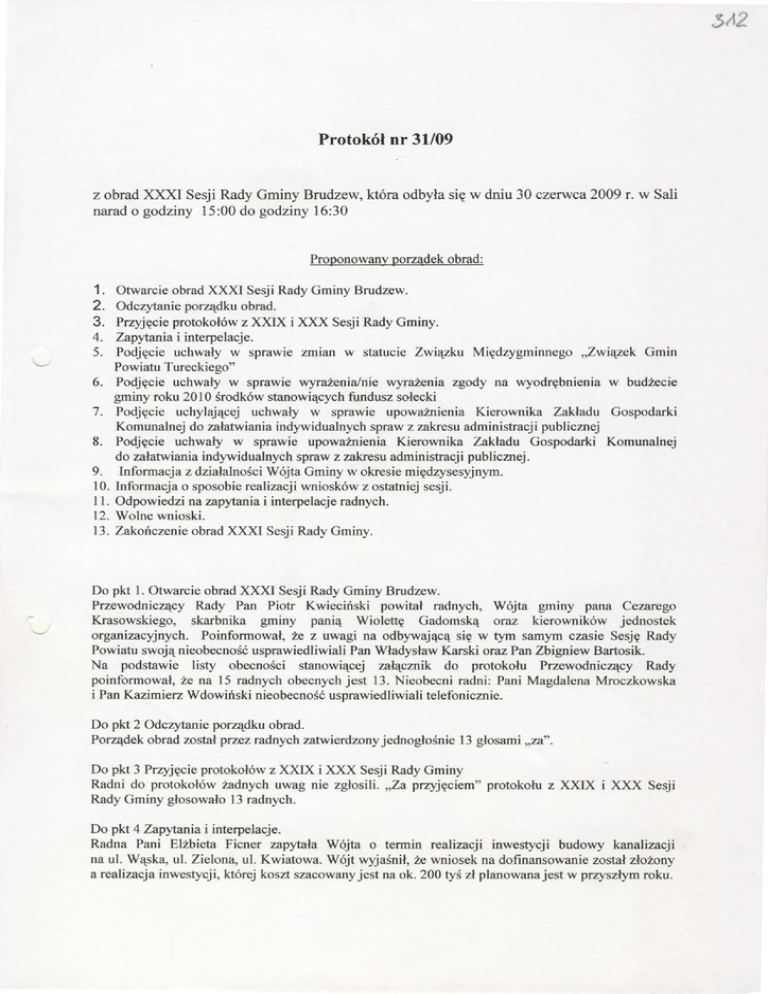3n2 Protokół nr 31/09 z obrad XXXI Sesji Rady Gminy Brudzew' która odbyła się w dniu 30 czerwca2009 r' w Sali narad o godziny 15:00do godziny 1ó:30 Proponowanyporządekobrad: 1. 2. 3. 4. 5. OtwarcieobradXXXI Sesji Rady Gminy Brudzew. odc4ytanieporządkuobrad. Przyjęcieprotokołówz XXIX i XXX SesjiRady Gminy. Zapytnia i interpelacje. Podjęcie uchwaĘ w sprawie zmian w statucie Związku Międzygminnego,,Związek Gmin PowiatuTureckiego" 6. Podjęcie uchwaływ sprawie wyrażenia/niewyrażeniazgody na wyodrębnieniaw budżecie gminyroku 20l0 środkówstanowiących funduszsołecki 7. Podjęcie uchylającej uchwaty w sprawie upowaŹnieniaKierownika Zakładu Gospodarki Komunalnejdo załatwiania indywidualnychsprawz zakresuadministracjipublicmej 8. Podjęcie uchwały w sprawie upoważnieniaKierownika Zakładu Gospodarki Komunalnej do załatwiania indyrłidualnych sprawz zakresuadministracjipublicmej. 9. Informacjaz działalności Wójta Gminy w okesie międzysesyjnym. l0. |nformacjao sposobierealizacjiwnioskówz ostatniejsesji. 1l. Odpowiedzina zapytaniai interpelacje radnych. 12. Wolne wnioski. l3. ZakończenieobradXXXI SesjiRady Gminy. . Do pkt l. OtwarcieobradXXXI Sesji Rady Gminy Brudzew. Przewodniczący Rady Pan Piotr Kwieciński powitał radnych, Wójta gminy pana Cezarego Krasowskiego, skarbnika gminy panią wiolettę Gadomską oraz kierowników jednostek organizacyjnych.Poinformowat,że z uwagi na odbywającąsię w tym samym czasie Sesję Rady Powiatuswojąnieobecność usprawiedliwialiPan WtadysławKarski oraz Pan ZbigniewBartosik. Na podstawie lisĘ obecności stanowiącej zatącznik do protokotu Przewodniczący Rady poinformował, żrcna |5 radnychobecnychjest 13.Nieobecniradni:Pani MagdalenaMroczkowska i Pan Kazimierz Wdowińskinieobecność usprawiedliwialite|efoniczrrie. Do pkt 2 odcz1tanie porządkuobrad. jednogłośnie Porządekobradzostałprzezradnychzatwierdzony l3 głosami,,za''. Do pkt 3 Przyjęcie protokołówz XXIX i XXX Sesji Rady Gminy Radni do protokołów żadnychuwag nie zgłosili. ',Za prryjęciem', protokofu z XX|X i XxX Sesji Rady Gminy głosowało l3 radnych. Do pkl 4 Zapytania i interpelacje. Radna Pani Elżbieta Ficner zapytaławójta o termin rea|izacji inwestycji budowy kanalizacji na u|' Wąską u|.Zię|ona"ul. Kwiatowa.wójt wyjaśni'l' żewniosekna dofinansowaniezostatzłożony a realizacjainvestycji' której kosztszacowanyjest na ok. 200 Ęśzłplanowanajest w przysĄm roku. 2'-J Ą lnne, także złożonewnioski na dofinansowanieplanowanychinwestycji to: park w Kolnicy, przebudowadrogi Kolnica-Galew;szacowanywstępniekosa ok. f m|n ń, budowahali sportowej przy Zespo|eSzkolnoGimnazjalnym-dofinansowanie ok. l'5 mln zł. powodzi, nawiedziĘpołudniową część kaju zapyał Budynek nawiązując do które Radny Pan Józef jak wójta działazarzĄdzenieĘzysowe w naszej gminie, oraz dane dot. ilościubezpieczonych zostaływojewódzkiećwiczenia p|onów.Wójt odpowiedział. żew miesiącuczerwcuprzeprowadzone naszagmina.Co do ubezpieczeńplonów z zarządzaniakryZysowego' w którychrównieżuczestniczyła przez rolników, decyzje podejmowanesą wyłącznieindywidualniea Urząd Gminy nie posiada prawnych moż|iwości wpłyrłuna ubezpieczających. Radny Pan Józef Budynek zwrócił uwagę na widoczneustawienieomakowań:zakazkąrieli'' przy zbiornikuwodnymw Bogdałowie. Do pkt 5' Podjęcieuchwaływ sprawiezmian w statucieZwięku Międrygminnego,,ZwiązekGmin PowiatuTureckiego" Wójt Pan Cezary Krasowski wyjaśnił,żs nrńany w statucie Zułiryku Międzygminnego dotyczą nieprawidłowości wskazanych przez organ prowadzącyrejestr-MinisterstwoSpraw wewnętrznych i Administracji.Radni uwag do projektuuchwałynie zgłosili.Komisje StałeRady Gminy Brudzew projekt uchwĄ zaopiniowały pozytywnie. Przewodniczący Rady poddał projekt uchwĄ pod głosowanie. l 3 głosami''za''. Uchwałazostałaprzyjętajednogłośnie wyrażeniazgodyna wyodrębnieniaw budżecie Do pkt ó. PodjęcieuchwaĘw sprawiewyrazenia'/nie gminyroku 20l0 środkówstanowiących funduszsołecki wójt Pan Cezary Krasowski powiedział,że jest zwolennikiemfirnduszusołeckiego,W związku z wymogami ustawowymi dot. kompletnejdokumentacjiproponujezgodnie z opinią soĘsów wyrażonąna kwartalnejnaradzie sołtysów,która odbyłasię 29 czerwca 2009 r. prrysĘ:ienie soĘs sołectwa do funduszu sołeckiego następnym w roku budżetowym. Radny a 7źLra:zem Wincentów,Pan Józef Budynekdodał,żesoĘsi wyrazili zgodęna zawieszeniew Ęm roku Funduszu ale pod warunkiem'żeWójt zapewniło przysĘ:ieniudo funduszuw 20l0 r. RadnaPani BarbaraKos Zapytałaczy można kumu|owaćśrodkifinansowe na koncie i jednorazowo wykonać większą inwestycję.Wójt wyjaśnit'że takiej możliwości wg ustawynie ma. Innychuwag radni nie zgłosili. pod poddał projekt głosowanie.Uchwałazostałaptzyjęta l l głosami Przewodniczący Rady uchwały się. ,,za''przy f głosachwstrzymujących Do pkt 7. Podjęcieuchylającejuchwaływ sprawieupoważnienia Kierownika ZakładuGospodarki Komuna|nejdo załatwiania indyrłidualnych sprawz zakresuadministracjipublicmej Do pkt 8. PodjęcieuchwaĘw sprawieupoważlieniaKierownikaZakładuGospodarkiKomunalnejdo załatwiania indywidualnychsprawz zakresuadministracjipublicznej. PrzygotowaneprojekĘdoĘcząupoważnienia indywidualnychspraw Kierownika ZCK do załatwiania z zakresu administracjipublicmej. Projekt uchwałyuchylającejzostałprzygotowanyz powodu niepoprawnego zapisuw paragrafie4. Radniuwagdo projektówuchwałnie zgłosi|i. PrzewodniczącyRady Pan Piotr Kwieciński poddałpod głosowanie : PodjęcieuchylającejuchwĄ w sprawieupoważnienia KierownikaZakładuGospodarkiKomunalnej do załatwianiaindyrvidualnychspraw z zakesu administracjipublicmej. Radni uchwałęprryjęli jednogtośnie l3 głosami,,za''. Do pkt 8. Podjęcieuchwatyw sprawieupoważnienia Kierownika ZakładuGospodarkiKomunalnej do załatwiania indywidualnychsprawz zakresuadministracjipublicznej. PrzewodniczącyRad