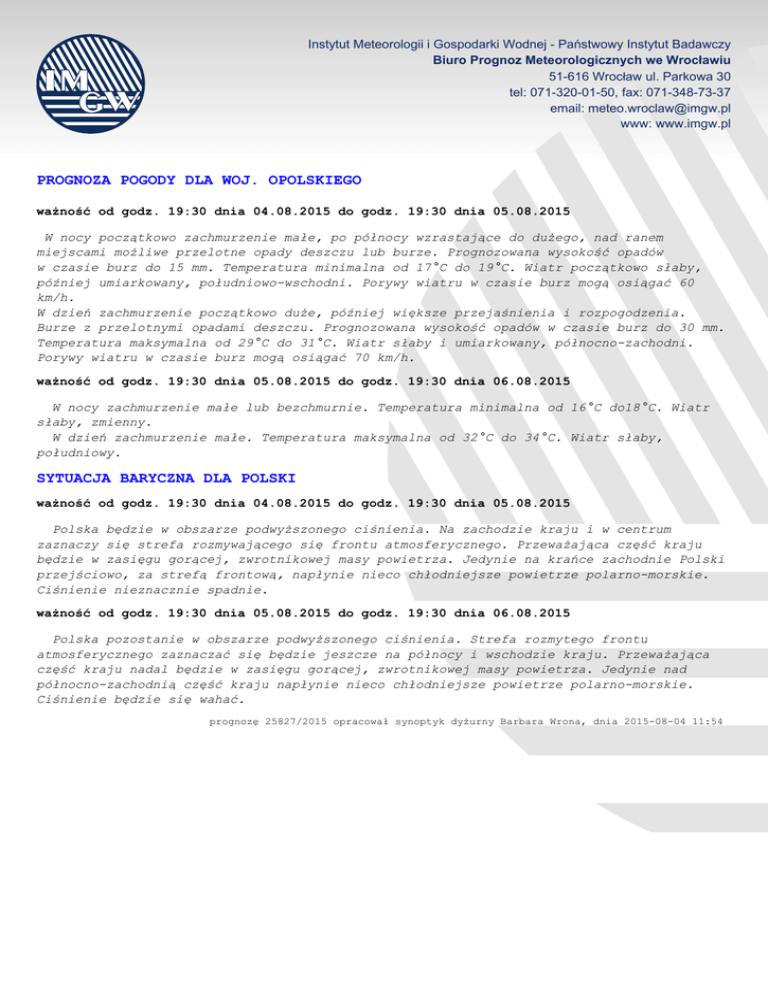 Instytut Meteorologii i Gospodarki Wodnej - Państwowy Instytut Badawczy Biuro Prognoz Meteorologicznych we Wrocławiu 51-616 Wrocław ul. Parkowa 30 tel: 071-320-01-50, fax: 071-348-73-37 email: [email protected] www: www.imgw.pl PROGNOZA POGODY DLA WOJ. OPOLSKIEGO ważność od godz. 19:30 dnia 04.08.2015 do godz. 19:30 dnia 05.08.2015 W nocy początkowo zachmurzenie małe, po północy wzrastające do dużego, nad ranem miejscami możliwe przelotne opady deszczu lub burze. Prognozowana wysokość opadów w czasie burz do 15 mm. Temperatura minimalna od 17°C do 19°C. Wiatr początkowo słaby, później umiarkowany, południowo-wschodni. Porywy wiatru w czasie burz mogą osiągać 60 km/h. W dzień zachmurzenie początkowo duże, później większe przejaśnienia i rozpogodzenia. Burze z przelotnymi opadami deszczu. Prognozowana wysokość opadów w czasie burz do 30 mm. Temperatura maksymalna od 29°C do 31°C. Wiatr słaby i umiarkowany, północno-zachodni. Porywy wiatru w czasie burz mogą osiągać 70 km/h. ważność od godz. 19:30 dnia 05.08.2015 do godz. 19:30 dnia 06.08.2015 W nocy zachmurzenie małe lub bezchmurnie. Temperatura minimalna od 16°C do18°C. Wiatr słaby, zmienny. W dzień zachmurzenie małe. Temperatura maksymalna od 32°C do 34°C. Wiatr słaby, południowy. SYTUACJA BARYCZNA DLA POLSKI ważność od godz. 19:30 dnia 04.08.2015 do godz. 19:30 dnia 05.08.2015 Polska będzie w obszarze podwyższonego ciśnienia. Na zachodzie kraju i w centrum zaznaczy się strefa rozmywającego się frontu atmosferycznego. Przeważająca część kraju będzie w zasięgu gorącej, zwrotnikowej masy powietrza. Jedynie na krańce zachodnie Polski przejściowo, za strefą frontową, napłynie nieco chłodniejsze powietrze polarno-morskie. Ciśnienie nieznacznie spadnie. ważność od godz. 19:30 dnia 05.08.2015 do godz. 19:30 dnia 06.08.2015 Polska pozostanie w obszarze podwyższonego ciśnienia. Strefa rozmytego frontu atmosferycznego zaznaczać się będzie jeszcze na północy i wschodzie kraju. Przeważająca część kraju nadal będzie w zasięgu gorącej, zwrotnikowej masy powietrza. Jedynie nad północno-zachodnią część kraju napłynie nieco chłodniejsze powietrze polarno-morskie. Ciśnienie będzie się wahać. prognozę 25827/2015 opracował synoptyk dyżurny Barbara Wrona, dnia 2015-08-04 11:54
