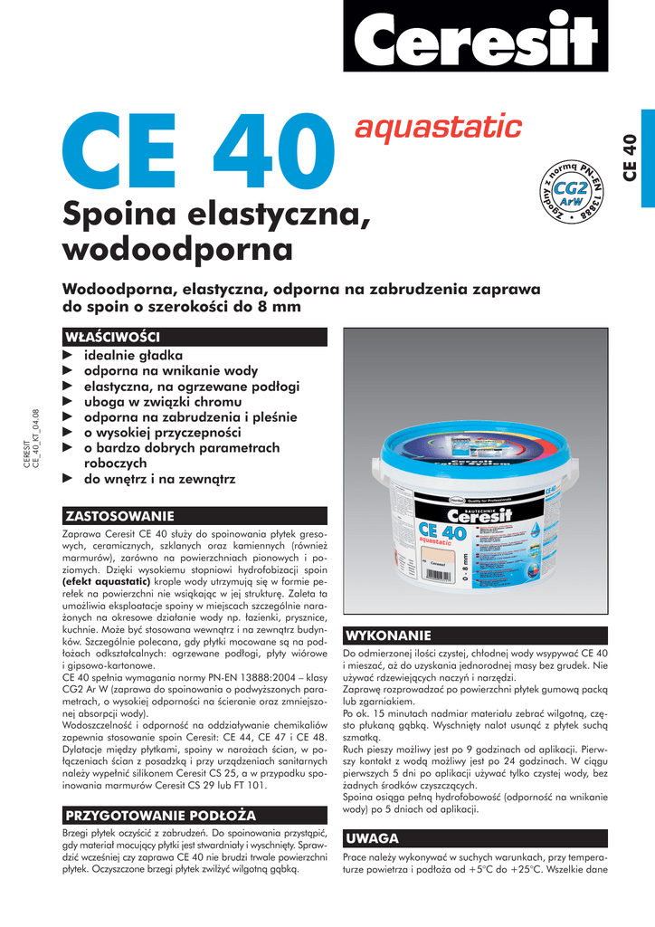 Spoina elastyczna, wodoodporna CERESIT CE_40_KT_04.08 Wodoodporna, elastyczna, odporna na zabrudzenia zaprawa do spoin o szerokości do 8 mm WŁAŚCIWOŚCI idealnie gładka odporna na wnikanie wody elastyczna, na ogrzewane podłogi uboga w związki chromu odporna na zabrudzenia i pleśnie o wysokiej przyczepności o bardzo dobrych parametrach roboczych do wnętrz i na zewnątrz ZASTOSOWANIE Zaprawa Ceresit CE 40 służy do spoinowania płytek gresowych, ceramicznych, szklanych oraz kamiennych (również marmurów), zarówno na powierzchniach pionowych i poziomych. Dzięki wysokiemu stopniowi hydrofobizacji spoin (efekt aquastatic) krople wody utrzymują się w formie perełek na powierzchni nie wsiąkając w jej strukturę. Zaleta ta umożliwia eksploatacje spoiny w miejscach szczególnie narażonych na okresowe działanie wody np. łazienki, prysznice, kuchnie. Może być stosowana wewnątrz i na zewnątrz budynków. Szczególnie polecana, gdy płytki mocowane są na podłożach odkształcalnych: ogrzewane podłogi, płyty wiórowe i gipsowo-kartonowe. CE 40 spełnia wymagania normy PN-EN 13888:2004 – klasy CG2 Ar W (zaprawa do spoinowania o podwyższonych parametrach, o wysokiej odporności na ścieranie oraz zmniejszonej absorpcji wody). Wodoszczelność i odporność na oddziaływanie chemikaliów zapewnia stosowanie spoin Ceresit: CE 44, CE 47 i CE 48. Dylatacje między płytkami, spoiny w narożach ścian, w połączeniach ścian z posadzką i przy urządzeniach sanitarnych należy wypełnić silikonem Ceresit CS 25, a w przypadku spoinowania marmurów Ceresit CS 29 lub FT 101. PRZYGOTOWANIE PODŁOŻA Brzegi płytek oczyścić z zabrudzeń. Do spoinowania przystąpić, gdy materiał mocujący płytki jest stwardniały i wyschnięty. Sprawdzić wcześniej czy zaprawa CE 40 nie brudzi trwale powierzchni płytek. Oczyszczone brzegi płytek zwilżyć wilgotną gąbką. WYKONANIE Do odmierzonej ilości czystej, chłodnej wody wsypywać CE 40 i mieszać, aż do uzyskania jednorodnej masy bez grudek. Nie używać rdzewiejących naczyń i narzędzi. Zaprawę rozprowadzać po powierzchni płytek gumową packą lub zgarniakiem. Po ok. 15 minutach nadmiar materiału zebrać wilgotną, często płukaną gąbką. Wyschnięty nalot usunąć z płytek suchą szmatką. Ruch pieszy możliwy jest po 9 godzinach od aplikacji. Pierwszy kontakt z wodą możliwy jest po 24 godzinach. W ciągu pierwszych 5 dni po aplikacji używać tylko czystej wody, bez żadnych środków czyszczących. Spoina osiąga pełną hydrofobowość (odporność na wnikanie wody) po 5 dniach od aplikacji. UWAGA Prace należy wykonywać w suchych warunkach, przy temperaturze powietrza i podłoża od +5°C do +25°C. Wszelkie dane CE 40 CE 40 aquastatic ZALECENIA Świeże spoiny należy chronić przed deszczem, rosą i spadkiem temperatury poniżej +5°C do czasu, aż spoiny będą całkowicie stwardniałe i wyschnięte. Niniejsza karta techniczna określa zakres stosowania materiału i zalecany sposób prowadzenia robót, ale nie może zastąpić zawodowego przygotowania wykonawcy. Oprócz podanych zaleceń, prace należy wykonywać zgodnie ze sztuką budowlaną i zasadami BHP. Producent gwarantuje jakość wyrobu, natomiast nie ma wpływu na warunki i sposób jego użycia. W przypadku wątpliwości należy wykonać własne próby stosowania. Wraz z ukazaniem się tej karty technicznej tracą ważność karty wcześniejsze. SKŁADOWANIE Wiaderka plastikowe 2 kg i 5 kg. Baza: mieszanka cementów z wypełniaczami mineralnymi i modyfikatorami polimerowymi Gęstość nasypowa: ok. 1,1 kg/dm3 Proporcje mieszania: 0,6 l wody na 2 kg 1,5 l wody na 5 kg Czas wstępnego dojrzewania: ok. 3 min Czas zużycia: do 2 godz. Temperatura stosowania: od +5°C do +25°C Ruch pieszy: po 9 godz. Odporność na ścieranie (wg normy PN-EN 13888): ≤ 1000 mm3 Wytrzymałość na zginanie (wg normy PN-EN 13888): - po warunkach suchych: ≥ 3,5 MPa - po cyklach zamrażania i rozmrażania: ≥ 3,5 MPa Wytrzymałość na ściskanie (wg normy PN-EN 13888): - po warunkach suchych: ≥ 15 MPa - po cyklach zamrażania i rozmrażania: ≥ 15 MPa Skurcz (wg normy PN-EN 13888): ≤ 2 mm/m Absorpcja wody (wg normy PN-EN 13888): - po 30 min: ≤2g - po 240 min: ≤5g Odporność na temperaturę: Do 24 miesięcy od daty produkcji przy składowaniu na paletach, w suchych warunkach i w oryginalnych, nieuszkodzonych opakowaniach. OPAKOWANIA DANE TECHNICZNE od -30°C do +70°C Orientacyjne zużycie przy typowych grubościach płytek: rozmiar płytek [cm] 5x5 szerokość spoin [mm] 2 ilość CE 40 [kg/m2] 0,5 5x5 10 x 10 15 x 15 10 x 20 3 2 3 3 0,7 0,4 0,4 0,4 Wyrób zgodny z normą PN-EN 13888:2004, posiada atest higieniczny Państwowego Zakładu Higieny HK/B-1330/01/2003 oraz atest na kontakt z wodą pitną HK/W/0534/01/2006. Henkel Polska Sp. z o.o. ul. Domaniewska 41, 02-672 Warszawa Centralny Dział Obsługi Klienta: Tel. (+48 41) 371-01-00 • Fax (+48 41) 374-22-22 www.ceresit.pl • infolinia 0-800-120-241 Buduj korzystając z profesjonalnych rozwiązań. CERESIT CE_40_KT_04.08 CE 40 odnoszą się do temperatury +23°C i wilgotności względnej powietrza 50%. W innych warunkach należy uwzględnić szybsze lub wolniejsze twardnienie materiału. Zbyt intensywne przecieranie spoin może spowodować odsłonięcie kruszywa i w konsekwencji szorstką ich powierzchnię. Intensywne przemywanie spoin dużą ilością wody może obniżyć efekt odporności na wnikanie wody. Zawilgocenie podłoża pod płytkami, niejednakowe dozowanie wody i niejednorodne warunki przesychania mogą powodować różnice w kolorystyce spoin. Nie używać środków czyszczących mających intensywny kolor. W celu uniknięcia różnicy w odcieniach, w jednym pomieszczeniu należy stosować CE 40 o tym samym numerze szarży produkcyjnej umieszczonym na każdym opakowaniu. Sypka CE 40 ma właściwości drażniące, a zawartość cementu powoduje, że po zmieszaniu z wodą zaprawa ma odczyn al