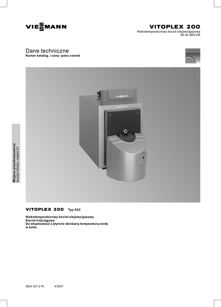VIESMANN VITOPLEX 200 Niskotemperaturowy kocioł olejowy/gazowy 90 do 560 kW Dane techniczne Miejsce przechowywania: teczka Vitotec, rejestr 21 Numer katalog. i ceny: patrz cennik VITOPLEX 200 Typ SX2 Niskotemperaturowy kocioł olejowy/gazowy Kocioł trójciągowy Do eksploatacji z płynnie obniżaną temperaturą wody w kotle. 5824 327-2 PL 4/2007 Zalety w skrócie & & Oszczędny i przyjazny dla środowiska dzięki pracy z płynnie obniżaną temperaturą wody w kotle. Sprawność znormalizowana przy eksploatacji z olejem opałowym: 88% (Hs)/94% (H i). Wzrost sprawności znormalizowanej dzięki wykorzystaniu ciepła kondensacji za pomocą Vitotrans 300. Kocioł trójciągowy pracujący z niskim obciążeniem komory spalania, dzięki czemu spalanie odbywa się z niską emisją zanieczyszczeń i tlenków azotu. & & & & & & Brak wymogu minimalnego przepływu objętościowego, dobra cyrkulacja własna również bez pompy obiegu kotła. Zintegrowany układ rozruchowy Therm‐Control ułatwia podłączenie hydrauliczne – dzięki niemu można zrezygnować zarówno z pompy mieszającej, jak i z podwyższania temperatury wody na powrocie. Przy mocy do 300 kW nie jest wymagane zabezpieczenie przed brakiem wody. Łatwe wstawienie do kotłowni i oszczędność przestrzeni przy instalacji dzięki zwartej konstrukcji – ważne przy modernizacji. Dostępny gazowy palnik wentylatorowy Unit Vitoflame 100 do 200 kW. System montażowy Fastfix do regulacji i izolacji cieplnej. A Obszerny płaszcz wodny oraz duża pojemność wodna zapewniające dobrą cyrkulację własną i proste połączenie hydrauliczne B Trzeci ciąg spalin C Wysoce skuteczna izolacja cieplna o grubości 100 mm D Vitotronic – nowa generacja regulatorów: inteligentne, proste w montażu, obsłudze i serwisie E Palnik Unit Vitoflame 100 firmy Viessmann F Izolacja cieplna G Drugi ciąg spalin 5824 327-2 PL H Komora spalania 2 VIESMANN VITOPLEX 200 Dane techniczne Dane techniczne Znamionowa moc cieplna Znamionowe obciążenie cieplne Nr ident. produktu – według wytycznej współczynnika sprawności – według wytycznej dot. gazu Dop. temperatura na zasilaniu (= temp. progowa) Dop. ciśnienie robocze Opór po stronie spalin Wymiary korpusu kotła Długość (wymiar q) * 1 Szerokość (wymiar d) Wysokość (z króćcami) (wymiar t) Wymiary całkowite Długość całkowita (wymiar r) Długość całkowita z palnikiem i kołpakiem (wymiar s) Szerokość całkowita (wymiar e) Wysokość całkowita (wymiar b) Wysokość konserwacyjna (regulator) (wymiar a) Wysokość – dźwiękochłonne stopy regulacyjne – dźwiękochłonne podkładki pod kocioł (w stanie obciążonym) Fundament Długość Szerokość Średnica komory spalania Długość komory spalania Masa korpusu kotła Masa całkowita Kocioł grzewczy z izolacją cieplną i regulatorem obiegu kotła Masa całkowita Kocioł grzewczy z izolacją cieplną, palnikiem i regulatorem obiegu kotła Pojemność wodna kotła Przyłącza kotła grzewczego Zasilanie i powrót kotła Przyłącze zabezpieczające (zawór bezpieczeństwa) Spust Parametry spalin* 2 Temperatura (przy temp. wody w kotle wynoszącej 60°C) – przy znam. mocy cieplnej – przy obciążeniu częściowym Temperatura (przy temp. wody w kotle wynoszącej 80°C) Masowe natężenie przepływu (przy oleju opałowym lekkim i gazie ziemnym) – przy znam. mocy cieplnej – przy obciążeniu częściowym Wymagane ciśnienie tłoczenia Przyłącze spalin 5824 327-2 PL *1 *2 kW kW 90 98 120 130 150 163 200 217 270 293 350 380 440 478 — CE‐0085 BQ 0020 560 609 — CE‐0085 °C bar Pa mbar 110 4 60 0,6 4 80 0,8 4 100 1,0 4 200 2,0 4 180 1,8 4 310 3,1 4 280 2,8 4 400 4,0 mm mm mm 1195 575 1145 1400 575 1145 1385 650 1180 1580 650 1180 1600 730 1285 1800 730 1285 1825 865 1455 1970 865 1455 mm mm 1310 1720 1510 1920 1495 1905 1690 2120 1730 – 1930 – 1950 – 2095 – mm mm mm 755 1315 1435 755 1315 1435 825 1350 1500 825 1350 1500 905 1460 1645 905 1460 1645 1040 1625 1815 1040 1625 1815 mm 28 28 28 28 28 – – – mm – – – – – 37 37 37 mm mm mm mm kg kg 1000 760 380 800 300 345 1200 760 380 1000 345 390 1200 830 400 1000 405 455 1400 830 400 1200 455 505 1400 900 480 1200 630 680 1650 900 480 1400 700 760 1650 1040 570 1400 925 990 1800 1040 570 1550 1025 1095 kg 385 430 495 545 – – – – litry 180 210 255 300 400 445 600 635 PN 6 DN R 65 1¼ 65 1¼ 65 1¼ 65 1¼ 65 1½ 80 1½ 100 1½ 100 1½ R 1¼ 1¼ 1¼ 1¼ 1¼ 1¼ 1¼ 1¼ °C °C °C 185 125 195 185 125 195 185 125 195 185 125 195 185 125 195 185 125 195 185 125 195 185 125 195 kg/h kg/h Pa/mbar Ø mm 150 90 0 180 200 120 0 180 250 150 0 200 333 200 0 200 450 270 0 200 583 350 0 200 733 440 0 250 934 561 0 250 Drzwi kotła zdemontowane. Wartości obliczeniowe do projektowania instalacji spalinowej wg normy EN 13384 w odniesieniu do 13% CO2 w przypadku oleju opałowego lekkiego i 10% CO2 w przypadku gazu ziemnego. Temperatury spalin jako zmierzone wartości brutto przy temperaturze powietrza do spalania wynoszącej 20°C. Dane obciążenia częściowego odnoszą się do mocy wynoszącej 80% znamionowej mocy cieplnej. Przy obciążeniu częściowym odbiegającym od podanych wartości (zależnie od sposobu eksploatacji) należy odpowiednio obliczyć przepływ masowy spalin. VITOPLEX 200 VIESMANN 3 Dane techniczne (ciąg dalszy) kW % % 90 120 150 0,40 0,35 0,30 AGA DB E KR Wylot spalin Mufa R ½ do ogranicznika ciśnienia maksymalnego Spust Powrót kotła 4 VIESMANN KTS KTÜ KV R 200 270 88 (H s) / 94 (H i) 0,30 0,25 350 440 560 0,25 0,22 0,20 5824 327-2 PL Znamionowa moc cieplna Sprawność znormalizowana (do eksploatacji na olej opałowy) przy temp. systemu grzewczego 75/60°C Strata dyżurna q B,70 Czujnik temperatury wody w kotle Drzwi kotła Zasilanie kotła Otwór wyczystkowy VITOPLEX 200 Dane techniczne (ciąg dalszy) RG Mufa R ½ dla dodatkowego urządzenia regulacyjnego SA Przyłącze zabezpieczające (zawór bezpieczeństwa) SCH Wziernik Tab
