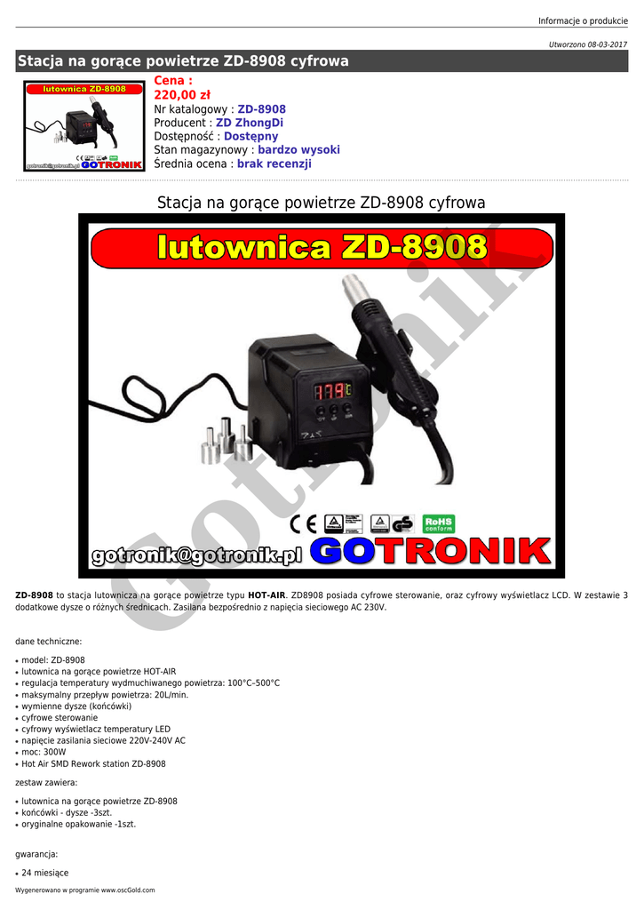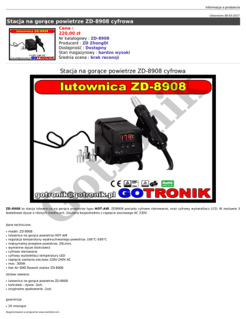 Informacje o produkcie Utworzono 08-03-2017 Stacja na gorące powietrze ZD-8908 cyfrowa Cena : 220,00 zł Nr katalogowy : ZD-8908 Producent : ZD ZhongDi Dostępność : Dostępny Stan magazynowy : bardzo wysoki Średnia ocena : brak recenzji G ot r on ik Stacja na gorące powietrze ZD-8908 cyfrowa ZD-8908 to stacja lutownicza na gorące powietrze typu HOT-AIR. ZD8908 posiada cyfrowe sterowanie, oraz cyfrowy wyświetlacz LCD. W zestawie 3 dodatkowe dysze o różnych średnicach. Zasilana bezpośrednio z napięcia sieciowego AC 230V. dane techniczne: ● ● ● ● ● ● ● ● ● ● model: ZD-8908 lutownica na gorące powietrze HOT-AIR regulacja temperatury wydmuchiwanego powietrza: 100°C–500°C maksymalny przepływ powietrza: 20L/min. wymienne dysze (końcówki) cyfrowe sterowanie cyfrowy wyświetlacz temperatury LED napięcie zasilania sieciowe 220V-240V AC moc: 300W Hot Air SMD Rework station ZD-8908 zestaw zawiera: ● ● ● lutownica na gorące powietrze ZD-8908 końcówki - dysze -3szt. oryginalne opakowanie -1szt. gwarancja: ● 24 miesiące Wygenerowano w programie www.oscGold.com ● ● uwaga: elementy grzewcze (grzałki) i groty nie podlegają gwarancji ani rękojmi i ich wymiana jest odpłatna. gwarancji nie podlegają elementy naturalnie zużywające się, takie jak elementy grzejne, elementy ruchome, żarówki, filtry itp. G ot r on ik zdjęcia: G ot r on ik Informacje o produkcie Wygenerowano w programie www.oscGold.com on ik ot r G