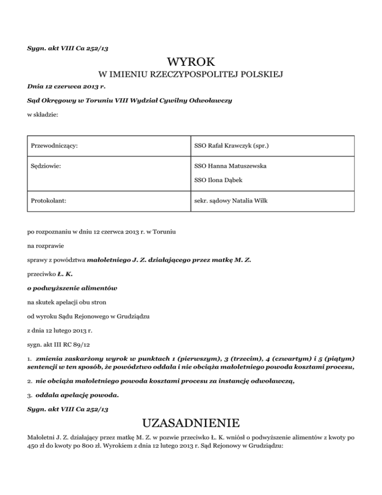 Sygn. akt VIII Ca 252/13 WYROK W IMIENIU RZECZYPOSPOLITEJ POLSKIEJ Dnia 12 czerwca 2013 r. Sąd Okręgowy w Toruniu VIII Wydział Cywilny Odwoławczy w składzie: Przewodniczący: SSO Rafał Krawczyk (spr.) Sędziowie: SSO Hanna Matuszewska SSO Ilona Dąbek Protokolant: sekr. sądowy Natalia Wilk po rozpoznaniu w dniu 12 czerwca 2013 r. w Toruniu na rozprawie sprawy z powództwa małoletniego J. Z. działającego przez matkę M. Z. przeciwko Ł. K. o podwyższenie alimentów na skutek apelacji obu stron od wyroku Sądu Rejonowego w Grudziądzu z dnia 12 lutego 2013 r. sygn. akt III RC 89/12 1. zmienia zaskarżony wyrok w punktach 1 (pierwszym), 3 (trzecim), 4 (czwartym) i 5 (piątym) sentencji w ten sposób, że powództwo oddala i nie obciąża małoletniego powoda kosztami procesu, 2. nie obciąża małoletniego powoda kosztami procesu za instancję odwoławczą, 3. oddala apelację powoda. Sygn. akt VIII Ca 252/13 UZASADNIENIE Małoletni J. Z. działający przez matkę M. Z. w pozwie przeciwko Ł. K. wniósł o podwyższenie alimentów z kwoty po 450 zł do kwoty po 800 zł. Wyrokiem z dnia 12 lutego 2013 r. Sąd Rejonowy w Grudziądzu: 1. podwyższył od pozwanego Ł. K. na rzecz małoletniego J. Z. rentę alimentacyjną z kwoty po 450 zł miesięcznie ustalonej ugodowo przed Sądem Rejonowym w Grudziądzu w dniu 1.06.2011 r. w sprawie III RC 343/11 do kwoty po 500 zł miesięcznie za okres od 8.02.2012 r. do 31.10.2012 r. , zaś od 1.11.2012 do kwoty po 550 zł miesięcznie – płatne do rąk ustawowego przedstawiciela małoletniego powoda matki M. Z. do dnia 15-tego każdego miesiąca z góry, z ustawowymi odsetkami w razie opóźnienia w płatności poszczególnych rat, 2. w pozostałym zakresie powództwo oddalił, 3. zasądził od pozwanego Ł. K. na rzecz M. Z. kwotę 150 zł tytułem zwrotu kosztów zastępstwa procesowego, 4. odstąpił od obciążania Ł. K. opłata stosunkową i opłatą kancelaryjną za odpis wyroku z klauzulą wykonalności dla strony powodowej. 5. wyrokowi w punkcie 1 nadał rygor natychmiastowej wykonalności. Sąd Rejonowy ustalił, że poprzednio alimenty w kwocie po 450 zł zostały ustalone na rzecz małoletniego na mocy ugody przed Sądem Rejonowym w Grudziądzu w dniu 1.06.2011 r. w sprawie III RC 343/11. Od czasu ustalenia obowiązku alimentacyjnego powoda na kwotę 450 zł tj. od 1 czerwca 2011 r. (alimenty podwyższone od 12.05.2011 r.) do dnia wytoczenia przedmiotowego powództwa upłynął okres 9 miesięcy. W tym czasie szkolne potrzeby małoletniego J. wzrosły w niewielkim zakresie, a bardziej istotny wzrost nastąpił z nowym rokiem szkolnym tj. od września 2012r. Od czasu poprzedniej sprawy alimentacyjnej warunki mieszkaniowe i rodzinne obu stron procesu nie uległy zmianie. W ocenie Sądu Rejonowego w sytuacji materialnej swojej i pozwanego matka powoda nie może liczyć na zaspokojenie wszystkich potrzeb syna. Sąd ocenił, że nową potrzebą małoletniego jest zakupu sprzętu i odzieży narciarskiej, która jednak nie należy od potrzeb usprawiedliwionych. Kolejna nowa potrzeba wiąże się z zakupem aparatu ortodontycznego. Matka małoletniego nie skorzystała w tym zakresie z refundowanych świadczeń NFZ, jednak takie działanie, w ocenie Sądu Rejonowego było usprawiedliwione. Natomiast wydatkowanie przez nią, bez porozumienia z ojcem dziecka, kwoty 1800 zł na nowatorską metodę poprawy koncentracji uwagi u syna nie może być uznane za usprawiedliwioną potrzebę małoletniego powoda, adekwatną do możliwości zarobkowych pozwanego. Za nieusprawiedliwiony Sąd Rejonowy uznał kurs językowy w Wlk. Brytanii. W konsekwencji Sąd Rejonowy uznał, że na przestrzeni roku nastąpił pewien wzrost do kwoty nie większej niż 1200 zł miesięcznie tj. o 200 zł więcej niż w 2011r. kosztów utrzymania małoletniego, w szczególności związany z jego rozwojem fizycznym i nauką w wyższej klasie oraz zaistnienie nowych potrzeb dziecka a przy tym od 1.11. 2012r pozwany ma zwiększone zarobki. Zasadne zatem było podwyższenie alimentów za okres od wytoczenia powództwa do 31.10.2012 r. o 50 zł a od 1.11.2012 r. o 100 zł . Pozwany wniósł apelację od powyższego wyroku, zaskarżając go w pkt. 1,3 i 5 i zarzucając: 1. obrazę przepisów prawa cywilnego, która mogła mieć wpływ na treść wyroku mianowicie art. 328 § 2 k.p.c. poprzez niewskazanie w uzasadnieniu wyroku jakie fakty sąd uznał za udowodnione i na jakich dowodach się oparł, stwierdzając, że nastąpiła istotna zmiana stosunków w trybie art. 138 k.r.o. 2. błąd w ustaleniach faktycznych przyjętych za podstawę orzeczenia, mogący mieć wpływ na jego treść poprzez mylne przyjęcie, iż w przedmiotowej sprawie nastąpiła zmiana stosunków z art. 138 k.r.o. w zakresie usprawiedliwionych potrzeb uprawnionego do alimentacji oraz w kwestii możliwości zarobkowych i majątkowych zobowiązanego do alimentacji Wniósł o zmianę zaskarżonego wyroku i oddalenie powództwa w całości, ewentualnie o jego uchylenie i przekazanie sprawy sądowi I instancji do ponownego rozpoznania a nadto o zasądzenie od małoletniego powoda na jego rzecz kosztów postępowania za I i II instancję. Małoletni powód zaskarżył wyrok w części oddalającej powództwo, zarzucając: 1) błędne przyjęcie, iż możliwości zarobkowe pozwanego nie dają podstaw do łożenia na utrzymanie małoletniego powoda 800 zł miesięcznie 2) naruszenie prawa procesowego, w szczególności art. 233 § 1 k.p.c. poprzez przekroczenie granic swobodnej oceny dowodów polegające na uznaniu, że wydatki czynione przez matkę na małoletniego, w szczególności dotyczące jego terapii i rozwoju fizycznego, są wydatkami nieusprawiedliwionymi i zbędnymi, w których ojciec nie musi partycypować, a ponadto, że pozwany nie jest w stanie płacić na rzecz małoletniego powoda renty alimentacyjnej w wysokości 800 zł miesięcznie. Wniósł o zmianę wyroku i orzeczenie zgodnie z żądaniem poz