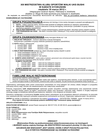 XIII MISTRZOSTWA KLUBU SPORTÓW WALKI UKS BUSHI W KARATE KYOKUSHIN niedziela 18 marca 2012 r. Integracyjne Centrum Sportu i Rekreacji w Józefowie Józefów ul. Długa 44 (hala sportowa przy basenie w Józefowie) Ze względu na rekreacyjny charakter Mistrzostw do udziału NIE są potrzebne badania lekarskie! KONKURENCJE I KATEGORIE: GRUPA POCZĄTKUJĄCA pierwszy rok treningu (i inne osoby trenujące w grupach początkujących) 1. 2. 3. 4. KATA – należy wykonać jedno, dowolne kata (podział na kategorie wiekowe po zapisaniu zawodników) WALKI NA TARCZACH – konkurs uderzania w tarczę treningową, konkurencje z podziałem na grupy wiekowe (podział po zapisaniu zawodników) WALKI REŻYSEROWANE – wraz z grupą zaawansowaną, podział wg stopni, decyduje wyższy stopień w parze. TOR PRZESZKÓD NA CZAS – dla osób z rocznika 2004 i młodszych. Przy ocenie wyników podział na kategorie wiekowe. GRUPA ZAAWANSOWANA osoby trenujące dłużej niż 1 rok 1. WALKI NA TARCZACH – konkurs uderzania w tarczę treningową konkurencje z podziałem na grupy wiekowe (podział po zapisaniu zawodników) 2. KATA chłopcy i dziewczynki 1. roczniki 2005 - 2004 2. roczniki 2003 - 2002 3. roczniki 2001 - 2000 dowolne 1 kata dowolne 1 kata dowolne 2 kata, inne w każdej turze 3. WALKI REŻYSEROWANE podział wg. stopni decyduje wyższy stopień w parze 1. osoby posiadające stopnie 10.1-10.3 2. osoby posiadające stopnie 9.1-9.3 3. osoby posiadające stopień 8.1 lub wyższy 4. KUMITE LEKKI KONTAKT – wolna walka w kaskach, pancerzach oraz ochraniaczach goleń-stopa z użyciem low-kick. Zabronione jest stosowanie pełnej siły kopnięć i uderzeń! - KUMITE CHŁOPCÓW 1. roczniki 2005 - 2004 2. roczniki 2003 - 2002 3. roczniki 2001 - 2000 - dwie lub trzy kategorie wagowe - dwie lub trzy kategorie wagowe - dwie lub trzy kategorie wagowe - KUMITE DZIEWCZĄT rocznik 2000 i młodsze, podział na kategorie nastąpi po zamknięciu listy zawodniczek 5. TOR PRZESZKÓD NA CZAS – dla osób z rocznika 2004 i młodszych. Przy ocenie wyników podział na kategorie wiekowe. FAMILIJNE WALKI REŻYSEROWANE konkurencja rodzinna, jedna kategoria. Warunki uczestnictwa: przynajmniej jeden rodzic (lub opiekun), przynajmniej jedno dziecko, w tym przynajmniej jedna osoba trenująca karate w UKS BUSHI, dowolna ilość osób w zespole, nie jest konieczne posiadanie stroju karate-gi. Organizatorzy zastrzegają sobie prawo przesunięcia zawodników do innej kategorii lub zmiany układu kategorii w przypadku znaczącej różnicy wagi, wzrostu lub zaawansowania oraz małej liczby zawodników. Podczas rozgrywania walk reżyserowanych sędziowie przede wszystkim oceniają zastosowanie oraz poprawność technik karate. Również bardzo ważne są logika i sensowność układu oraz dynamika i płynność walki. Dopiero w drugiej kolejności zwracają uwagę na dodatkowe elementy gimnastyczne, teatralne i inne związane ze sztukami walki. Zawodnicy występujący w konkurencji kumite (wolnej walce) zobowiązani są do posiadania własnych ochraniaczy na piszczele oraz wskazane jest aby mężczyźni posiadali suspensorium (ochraniacze na krocze). Organizator zapewnia kaski i raz pancerze. ZAPISY do udziału w zawodach u instruktorów lub mailem [email protected] . OSTATECZNY TERMIN: środa 14 marca 2012 r. Przy zapisie do kumite obowiązuje podanie dokładnej wagi i wniesienie opłaty startowej!!! OPŁATA STARTOWA: 30 zł. DODATKOWE INFORMACJE: sensei Paweł Juszczyk tel. 602 617 018, 22 245 36 23, [email protected] PLAN TURNIEJU: 10.00 - roczniki 2006 - 2004 12:30 - dekoracja 13:00 - Walki Reżyserowane oraz Familijne Walki Reżyserowane, wszystkie roczniki 13:30 - roczniki 2002 – 2003 15:00 - dekoracja 15:30 - roczniki 2001 – 2000 17:00 - dekoracja UWAGA!!! Mistrzostwa Klubu są podsumowaniem dotychczasowej pracy na treningach i BARDZO ważną częścią treningu dla WSZYSTKICH ćwiczących poniżej 13 roku życia. SZCZEGÓLNIE WSKAZANY JEST UDZIAŁ OSÓB Z GRUP POCZĄTKUJĄCYCH, DLA KTÓRYCH PRZEWIDZIANE SĄ OSOBNE KATEGORIE!