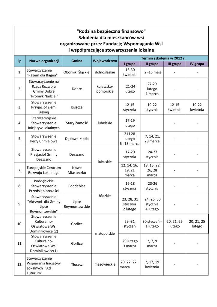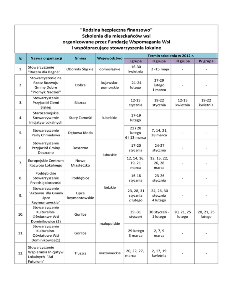 "Rodzina bezpieczna finansowo" Szkolenia dla mieszkańców wsi organizowane przez Fundację Wspomagania Wsi i współpracujące stowarzyszenia lokalne lp 1. 2. 3. 4. Nazwa organizacji Stowarzyszenie "Razem dla Bagna" Stowarzyszenie na Rzecz Rozwoju Gminy Dobre "Promyk Nadziei" Stowarzyszenie Przyjaciół Ziemi Biskiej Starozamojskie Stowarzyszenie Inicjatyw Lokalnych Gmina Województwo Oborniki Śląskie dolnośląskie Dobre kujawsko‐ pomorskie Biszcza Stary Zamość 5. Stowarzyszenie Perły Chmielowa Dębowa Kłoda 6. Stowarzyszenie Przyjaciół Gminy Deszczno Deszczno Europejskie Centrum Rozwoju Lokalnego Nowe Miasteczko 7. 8. 9. 10. 11. Tłuszcz 21‐24 lutego 27‐29 lutego 1 marca ‐ ‐ 12‐15 stycznia 19‐22 stycznia 12‐15 kwietnia 19‐22 kwietnia 17‐19 lutego ‐ ‐ ‐ ‐ 21 i 28 7, 14, 21, lutego 28 marca 6 i 13 marca lubuskie Poddębickie Stowarzyszenie Poddębice Przedsiębiorczości Stowarzyszenie Lipce "Aktywni dla Gminy Lipce Reymontowskie Reymontowskie" Stowarzyszenie Kulturalno‐ Gorlice Oświatowe Wsi Dominikowice (2) Stowarzyszenie Kulturalno‐ Gorlice Oświatowe Wsi Dominikowice(1) Stowarzyszenie 12. Wspierania Inicjatyw Lokalnych "Ad Futurum" lubelskie Termin szkolenia w 2012 r. I grupa II grupa III grupa IV grupa 16‐30 2 ‐15 maja ‐ ‐ kwietnia łódzkie 17‐20 stycznia 24‐27 stycznia ‐ ‐ 12, 14, 16, 19, 21 marca 13, 15, 22, 26, 28 marca ‐ ‐ 16‐18 stycznia 23‐26 stycznia ‐ ‐ 23, 28, 31 stycznia 2 lutego 24, 26, 30 stycznia 4 lutego ‐ ‐ 29 ‐31 styczeń 30 styczeń ‐ 20, 21, 25 1 lutego lutego 20, 21, 25 lutego małopolskie mazowieckie 29 lutego 3 marca 2, 7, 9 marca ‐ ‐ 20, 22, 27, marca 2, 17, 19 kwietnia ‐ ‐ Stowarzyszenie Kobiet Ziemi Kozienickiej 21, 22, 23, 24 lutego ‐ ‐ 6, 9, 11 lutego ‐ ‐ 8, 10, 14, 16 lutego 24, 27, 28, 29 lutego ‐ ‐ Kołaczyce 5‐8 marca 12‐15 marca ‐ ‐ Krypno 13‐16 stycznia 20‐23 stycznia ‐ ‐ Sejny 14, 21, 28 lutego 06 marca 14, 21, 28 lutego 6 marca ‐ ‐ Zawady 5, 8, 10, 14 19, 21, 23, marca 25 marca ‐ ‐ 20. Lokalna Organizacja Turystyczna Brama na Bagna Zawady 5, 8, 10, 14 19, 21, 23, marca 25 marca ‐ ‐ 21. Stowarzyszenie Gazdowie Doliny Cichej w Sobolówce Ujsoły 30 stycznia 3‐7 lutego 2, 6, 8 lutego ‐ ‐ Łazy 6, 7, 8 lutego 6, 7, 8 lutego ‐ ‐ Wręczyca Wielka 5, 9, 13, 19, 26 marca 8, 12, 14, 27, 30 marca ‐ ‐ Kroczyce 29 lutego 7‐10 marca 1, 2 marca ‐ ‐ ‐ ‐ 13. Stowarzyszenie Rozwoju Wsi Bzinica 14. Stara, Bzinica Nowa , Bąki, Kolejka 15. 16. 17. 18. 19. Stowarzyszenie Życzliwej Pomocy "Samarytanin" w Korczewie Stowarzyszenie Edukacyjno‐ Regionalne "Nasza Szkoła‐Wspólne Dobro" Gminny Ośrodek Kultury w Krypnie Stowarzyszenie Na Rzecz Rozwoju Cywilizacyjnego "ściana Wschodnia" w Sejnach Lokalna Organizacja Turystyczna Brama na Bagna Stowarzyszenie Rozwoju Wsi 22. Chruszczobród i Chruszczobród Piaski Stowarzyszenie Koło Gospodyń Wiejskich 23. Gminy Wręczyca Wielka Niezależny Klub 24. Młodzieżowy Stowarzyszenie 25. Wspierania Inicjatyw Gospodarczych Magnuszew Dobrodzień opolskie Korczyna podkarpackie podlaskie Kroczyce śląskie 12‐14 marca 15‐17 i 19 marca 26. 27. 28. 29. 30. 31. Stowarzyszenie "Nowe Horyzonty" Stowarzyszenie Świat Wiedzy i Techniki "Świt" Stowarzyszenie Rozwoju Społecznego "Zalezianka" Stowarzyszenie Gospodyń Wiejskich w Wyszkach Biblioteka Publiczna Gminy Kotlin Stowarzyszenie na Rzecz Rozwoju Mieszkowa " Nasz Mieszków" Stowarzyszenie Aktywności Lokalnej KASZTANOWY SZLAK Stowarzyszenie 33. Kobiet Aktywnych "Malwa" Stowarzyszenie Na Rzecz Rozwoju i Integracji 34. Środowiska Lokalnego " Z Edukacją w Przyszłość" Stowarzyszenie 35. "Solidarni w Partnerstwie" 32. Kroczyce 20‐22 marca 26‐29 marca ‐ ‐ Dwikozy 13‐15 lutego 16, 17, 20 lutego ‐ ‐ 29 lutego 1, 2, 3 marca 26‐28 lutego ‐ ‐ świętokrzyskie 8, 9, 10, 11 15, 16, 17, lutego 18 lutego Łączna 20‐22 lutego Kotlin Kotlin 6‐8 lutego 13‐15 lutego ‐ ‐ Jarocin 12, 16, 24 marca 14, 23, 24 marca ‐ ‐ Rydzyna 28, 29 lutego 1 marca 6, 7, 8, 9 marca ‐ ‐ 27, 28, 29 lutego 1 marca ‐ ‐ Jastrowie wielkopolskie 6‐9 lutego Kłodawa 14, 21, 28 lutego 20, 27 lutego 5 marca ‐ ‐ Stare Miasto 19, 21, 23 marca 19, 21, 23 marca ‐ ‐ 7, 8, 9 maja 10, 11, 14 maja ‐ ‐ 27‐29 marca 11‐13 kwietnia ‐ ‐ 12, 13, 14, 15 marca 19, 20, 21, 22 marca ‐ ‐ Stowarzyszenie 36. Oświatowe Czerniejewo ONUPHRIUS Borneńskie Centrum Inicjatyw 37. Borne Sulinowo Społecznych 38. Krajowe Stowarzyszenie Kobiet Wiejskich‐ Koło Wiejskie w Wyszeborzu zachodnio ‐ pomorskie Manowo