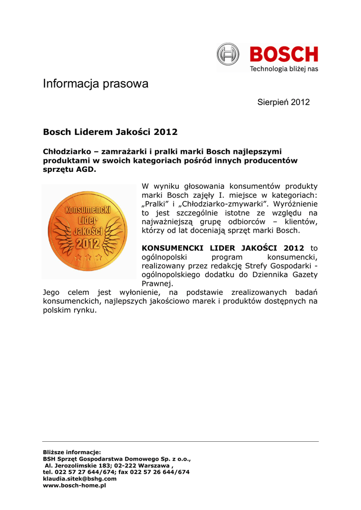 Informacja prasowa Sierpień 2012 Bosch Liderem Jakości 2012 Chłodziarko – zamrażarki i pralki marki Bosch najlepszymi produktami w swoich kategoriach pośród innych producentów sprzętu AGD. W wyniku głosowania konsumentów produkty marki Bosch zajęły I. miejsce w kategoriach: „Pralki” i „Chłodziarko-zmywarki”. Wyróżnienie to jest szczególnie istotne ze względu na najważniejszą grupę odbiorców – klientów, którzy od lat doceniają sprzęt marki Bosch. KONSUMENCKI LIDER JAKOŚCI 2012 to ogólnopolski program konsumencki, realizowany przez redakcję Strefy Gospodarki ogólnopolskiego dodatku do Dziennika Gazety Prawnej. Jego celem jest wyłonienie, na podstawie zrealizowanych badań konsumenckich, najlepszych jakościowo marek i produktów dostępnych na polskim rynku. Bliższe informacje: BSH Sprzęt Gospodarstwa Domowego Sp. z o.o., Al. Jerozolimskie 183; 02-222 Warszawa , tel. 022 57 27 644/674; fax 022 57 26 644/674 [email protected] www.bosch-home.pl