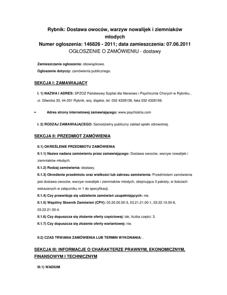 Rybnik: Dostawa owoców, warzyw nowalijek i ziemniaków młodych Numer ogłoszenia: 146826 - 2011; data zamieszczenia: 07.06.2011 OGŁOSZENIE O ZAMÓWIENIU - dostawy Zamieszczanie ogłoszenia: obowiązkowe. Ogłoszenie dotyczy: zamówienia publicznego. SEKCJA I: ZAMAWIAJĄCY I. 1) NAZWA I ADRES: SPZOZ Państwowy Szpital dla Nerwowo i Psychicznie Chorych w Rybniku , ul. Gliwicka 33, 44-201 Rybnik, woj. śląskie, tel. 032 4328138, faks 032 4328169. • Adres strony internetowej zamawiającego: www.psychiatria.com I. 2) RODZAJ ZAMAWIAJĄCEGO: Samodzielny publiczny zakład opieki zdrowotnej. SEKCJA II: PRZEDMIOT ZAMÓWIENIA II.1) OKREŚLENIE PRZEDMIOTU ZAMÓWIENIA II.1.1) Nazwa nadana zamówieniu przez zamawiającego: Dostawa owoców, warzyw nowalijek i ziemniaków młodych. II.1.2) Rodzaj zamówienia: dostawy. II.1.3) Określenie przedmiotu oraz wielkości lub zakresu zamówienia: Przedmiotem zamówienia jest dostawa owoców, warzyw nowalijek i ziemniaków młodych, obejmująca 3 pakiety, w ilościach wskazanych w załączniku nr 1 do specyfikacji. II.1.4) Czy przewiduje się udzielenie zamówień uzupełniających: nie. II.1.5) Wspólny Słownik Zamówień (CPV): 03.20.00.00-3, 03.21.21.00-1, 03.22.10.00-6, 03.22.21.00-4. II.1.6) Czy dopuszcza się złożenie oferty częściowej: tak, liczba części: 3. II.1.7) Czy dopuszcza się złożenie oferty wariantowej: nie. II.2) CZAS TRWANIA ZAMÓWIENIA LUB TERMIN WYKONANIA: . SEKCJA III: INFORMACJE O CHARAKTERZE PRAWNYM, EKONOMICZNYM, FINANSOWYM I TECHNICZNYM III.1) WADIUM Informacja na temat wadium: 1. Wysokość wadium Każda oferta musi być zabezpieczona wadium w wysokości 2 500 PLN (dwa tysiące PLN) na całość zamówienia lub na poszczególne pakiety: pakiet nr 1 - 1 000 PLN, pakiet nr 2 - 900 PLN, pakiet nr 3 - 600 PLN. Wadium musi być wniesione najpóźniej przed terminem składania ofert. 2. Formy wadium Wadium może być wniesione w następujących formach: - pieniądzu, - poręczeniach bankowych lub poręczeniach spółdzielczej kasy oszczędnościowo - kredytowej, z tym że poręczenie kasy jest zawsze poręczeniem pieniężnym, gwarancjach bankowych, - gwarancjach ubezpieczeniowych, - poręczeniach udzielanych przez podmioty, o których mowa w art. 6b ust.5 pkt.2 ustawy z dnia 9 listopada 2000r. o utworzeniu Polskiej Agencji Rozwoju Przedsiębiorczości (Dz. U. Nr 109, poz. 1158 z późn. zm.). 3. Miejsce złożenia Wadium wnoszone w pieniądzu należy wpłacić przelewem na rachunek bankowy Zamawiającego: PKO S.A. o/Rybnik 24 1240 4272 1111 0000 4835 2352 Wadium wnoszone w innej formie aniżeli pieniężna należy złożyć w kasie w siedzibie zamawiającego, ul. Gliwicka 33, pok. nr 9, czynnej w godz. 7.30 do 14.30 (przerwa od 10.00 - 12.00) a potwierdzenie jego wniesienia należy dołączyć do oferty. III.2) ZALICZKI Czy przewiduje się udzielenie zaliczek na poczet wykonania zamówienia: nie • III.4) INFORMACJA O OŚWIADCZENIACH LUB DOKUMENTACH, JAKIE MAJĄ DOSTARCZYĆ WYKONAWCY W CELU POTWIERDZENIA SPEŁNIANIA WARUNKÓW UDZIAŁU W POSTĘPOWANIU ORAZ NIEPODLEGANIA WYKLUCZENIU NA PODSTAWIE ART. 24 UST. 1 USTAWY • III.4.1) W zakresie wykazania spełniania przez wykonawcę warunków, o których mowa w art. 22 ust. 1 ustawy, oprócz oświadczenia o spełnieniu warunków udziału w postępowaniu, należy przedłożyć: • III.4.2) W zakresie potwierdzenia niepodlegania wykluczeniu na podstawie art. 24 ust. 1 ustawy, należy przedłożyć: • oświadczenie o braku podstaw do wykluczenia • aktualny odpis z właściwego rejestru, jeżeli odrębne przepisy wymagają wpisu do rejestru, w celu wykazania braku podstaw do wykluczenia w oparciu o art. 24 ust. 1 pkt 2 ustawy, wystawiony nie wcześniej niż 6 miesięcy przed upływem terminu składania wniosków o dopuszczenie do udziału w postępowaniu o udzielenie zamówienia albo składania ofert, a w stosunku do osób fizycznych oświadczenie w zakresie art. 24 ust. 1 pkt 2 ustawy • III.4.3) Dokumenty podmiotów zagranicznych Jeżeli wykonawca ma siedzibę lub miejsce zamieszkania poza terytorium Rzeczypospolitej Polskiej, przedkłada: III.4.3.1) dokument wystawiony w kraju, w którym ma siedzibę lub miejsce zamieszkania potwierdzający, że: • nie otwarto jego likwidacji ani nie ogłoszono upadłości - wystawiony nie wcześniej niż 6 miesięcy przed upływem terminu składania wniosków o dopuszczenie do udziału w postępowaniu o udzielenie zamówienia albo składania ofert III.6) INNE DOKUMENTY Inne dokumenty niewymienione w pkt III.4) albo w pkt III.5) Oświadczenie o spełnianiu warunków udziału w postępowaniu o udzielenie zamówienia publicznego, o którym mowa w art.22 ust.1 uPzp III.7) Czy ogranicza się możliwość ubiegania się o zamówienie publiczne tylko dla wykonawców, u których ponad 50 % pracowników stanowią osoby niepełnosprawne: nie SEKCJA IV: PROCEDURA IV.1) TRYB UDZIELENIA ZAMÓWIENIA IV.1.1) Tryb udzielenia zamówienia: przetarg nieograniczony. IV.2) KRYTERIA OCENY OFERT IV.2.1) Kryteria oceny ofert: najniższa cena. IV.2.2) Czy przeprowadzona będzie aukcja elektroniczna: nie. IV.3) ZMIANA UMOWY Czy przewiduje się istotne zmiany postanowień zawartej umowy w stosunku do treści oferty, na podstawie której dokonano wyboru wykonawcy: nie IV.4) INFORMACJE ADMINISTRACYJNE IV.4.1) Adres strony internetowej, na której jest dostępna specyfikacja istotnych warunków zamówienia: www.psychiatria.com Specyfikację istotnych warunków zamówienia można uzyskać pod adresem: SP ZOZ Państwowy Szpital dla Nerwowo i Psychicznie Chorych w Rybniku, ul. Gliwicka 33, 44-201 Rybnik, Dział Zamówień Publicznych, budynek Administracji, II piętro, pok. nr 22. IV.4.4) Termin składania wniosków o dopuszczenie do udziału w postępowaniu lub ofert: 15.06.2011 godzina 09:30, miejsce: SP ZOZ Państwowy Szpital dla Nerwowo i Psychicznie Chorych w Rybniku, ul. Gliwicka 33, 44-201 Rybnik, Dział Zamówień Publicznych, budynek Administracji, II piętro, po