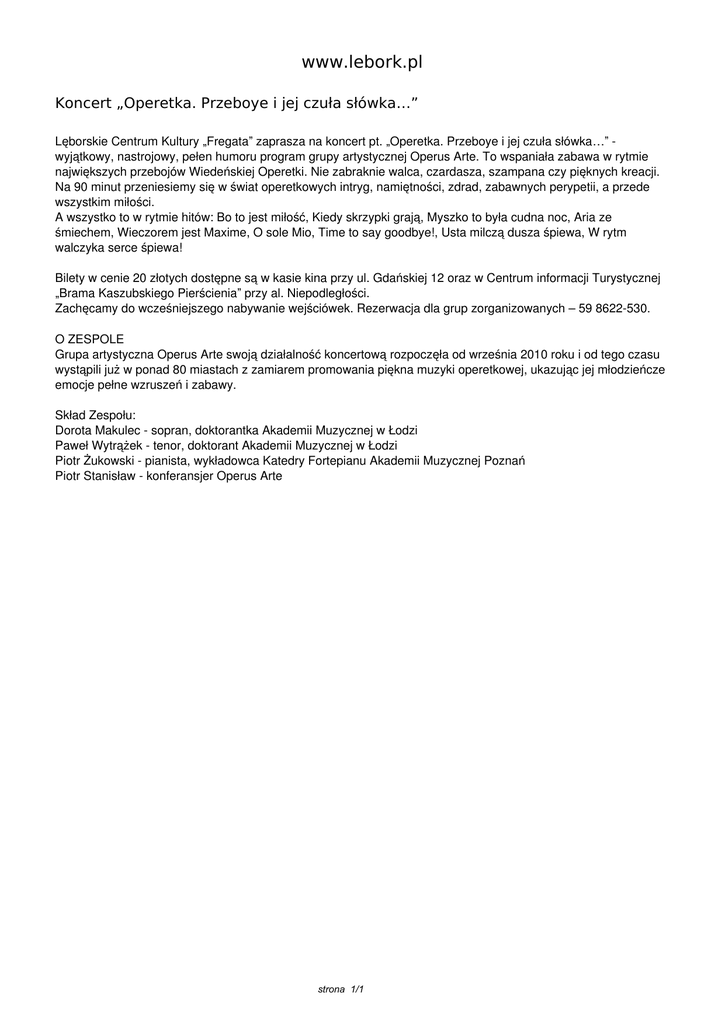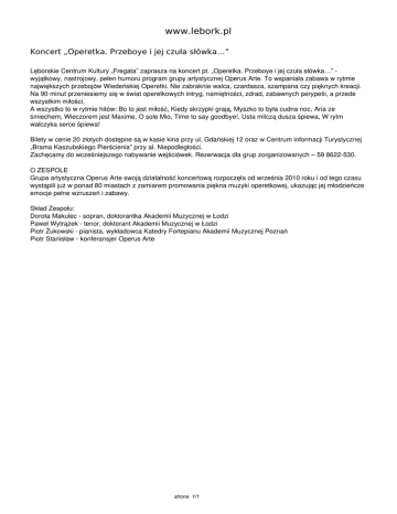 www.lebork.pl Koncert „Operetka. Przeboye i jej czuła słówka…” Lęborskie Centrum Kultury „Fregata” zaprasza na koncert pt. „Operetka. Przeboye i jej czuła słówka…” wyjątkowy, nastrojowy, pełen humoru program grupy artystycznej Operus Arte. To wspaniała zabawa w rytmie największych przebojów Wiedeńskiej Operetki. Nie zabraknie walca, czardasza, szampana czy pięknych kreacji. Na 90 minut przeniesiemy się w świat operetkowych intryg, namiętności, zdrad, zabawnych perypetii, a przede wszystkim miłości. A wszystko to w rytmie hitów: Bo to jest miłość, Kiedy skrzypki grają, Myszko to była cudna noc, Aria ze śmiechem, Wieczorem jest Maxime, O sole Mio, Time to say goodbye!, Usta milczą dusza śpiewa, W rytm walczyka serce śpiewa! Bilety w cenie 20 złotych dostępne są w kasie kina przy ul. Gdańskiej 12 oraz w Centrum informacji Turystycznej „Brama Kaszubskiego Pierścienia” przy al. Niepodległości. Zachęcamy do wcześniejszego nabywanie wejściówek. Rezerwacja dla grup zorganizowanych – 59 8622-530. O ZESPOLE Grupa artystyczna Operus Arte swoją działalność koncertową rozpoczęła od września 2010 roku i od tego czasu wystąpili już w ponad 80 miastach z zamiarem promowania piękna muzyki operetkowej, ukazując jej młodzieńcze emocje pełne wzruszeń i zabawy. Skład Zespołu: Dorota Makulec - sopran, doktorantka Akademii Muzycznej w Łodzi Paweł Wytrążek - tenor, doktorant Akademii Muzycznej w Łodzi Piotr Żukowski - pianista, wykładowca Katedry Fortepianu Akademii Muzycznej Poznań Piotr Stanisław - konferansjer Operus Arte strona 1/1 Powered by TCPDF (www.tcpdf.org)