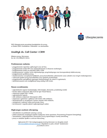 PKO Ubezpieczenia poszukuje kandydatów do pracy w Dziale CRM i Kontaktów z Klientami na stanowisko: Analityk ds. Call Center i CRM Miejsce pracy: Warszawa Nr ref.: CC/CRM/07/2016 Podstawowe zadania: • • • • • • • • • przygotowanie raportów cyklicznych oraz ad-hoc, przygotowanie analiz KPI oraz zapotrzebowania w obszarze osobowym, przygotowanie analiz na potrzeby CRM i CEM prognozowanie i analiza ruchu wychodzącego, przychodzącego oraz korespondencji elektronicznej, przygotowanie grafików pracy, monitorowanie i zarządzanie kolejkami, pracą konsultantów, planowanie czasu szkoleń oraz innych niedostępności, rozliczanie godzin pracy konsultantów oraz systemu premiowego, przygotowanie specyfikacji wymagań funkcjonalnych do zmian w systemach, administrowanie oraz modyfikacja bazy wiedzy Call Center. Nasze oczekiwania: • • • • • • • • • wykształcenie wyższe (matematyka, informatyka, ekonomia, przedmioty ścisłe) bardzo dobra znajomość MS Excel (w tym Visual Basic), znajomość języka SQL i HTML, wykształcenie wyższe, mile widziana znajomość Sharepoint i JIRA, znajomość systemów i aplikacji Call Center mile widziana, doświadczenie w zarządzaniu czasem zespołu mile widziane, umiejętność realizacji celów pod presją czasu, terminowość i wysoka jakość wykonywanych zadań. Wybranym osobom oferujemy: • zatrudnienie na podstawie umowy o pracę, • pakiet świadczeń socjalnych (opieka medyczna, karta sportowa, Pracowniczy Program Emerytalny), • samodzielne i odpowiedzialne stanowisko pracy zapewniające rozwój zawodowy, • pracę w siedzibie Spółki w centrum Warszawy. Zgłoszenia (CV i list motywacyjny) prosimy kierować na skrzynkę email: [email protected] z dopiskiem w polu „Temat” wiadomości „CC/CRM/07/2016”. W nadsyłanych dokumentach prosimy o dopisanie klauzuli: Zgodnie z art. 24 ust. 1 ustawy z dnia 29 sierpnia 1997 r. o ochronie danych osobowych (Dz. U. z 2002 r., Nr 101, poz. 926 z późn. zm.) oświadczam, że zostałem poinformowany iż administratorem danych osobowych dobrowolnie udostępnionych przeze mnie w celu przeprowadzenia rekrutacji jest PKO Życie Towarzystwo Ubezpieczeń S.A. z siedzibą w Warszawie przy ul. Chłodnej 52, PKO Towarzystwo Ubezpieczeń S.A. z siedzibą w Warszawie przy ul. Chłodnej 52 oraz PKO Bank Polski z siedzibą w Warszawie przy ul. Puławskiej 15. Poinformowano mnie o prawie dostępu do treści danych oraz ich poprawiania. Poinformowano mnie, że dane osobowe nie będą przekazywane innym odbiorcom. Uprzejmie informujemy, że skontaktujemy się jedynie z wybranymi osobami. Prowadzący proces rekrutacji zapewniają poufność.