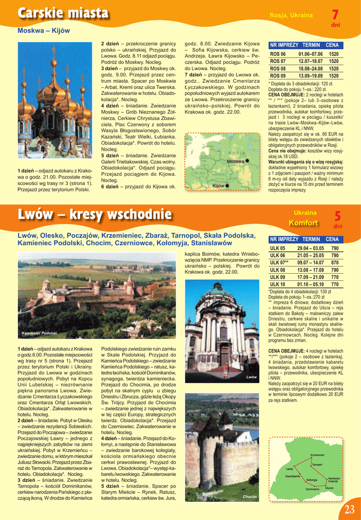 Carskie miasta Rosja, Ukraina Moskwa – Kijów 1 dzień – odjazd autokaru z Krakowa o godz. 21.00. Pozostałe miejscowości wg trasy nr 3 (strona 1). Przejazd przez terytorium Polski. 2 dzień – przekroczenie granicy polsko – ukraińskiej. Przyjazd do Lwowa. Godz. 8.11 odjazd pociągu. Podróż do Moskwy. Nocleg. 3 dzień – przyjazd do Moskwy ok. godz. 9.00. Przejazd przez centrum miasta. Spacer po Moskwie – Arbat, Kreml oraz ulica Twerska. Zakwaterowanie w hotelu. Obiadokolacja*. Nocleg. 4 dzień – śniadanie. Zwiedzanie Moskwy – Grób Nieznanego Żołnierza, Cerkiew Chrystusa Zbawiciela, Plac Czerwony z soborem Wasyla Błogosławionego, Sobór Kazański, Teatr Wielki, Łubianka. Obiadokolacja*. Powrót do hotelu. Nocleg. 5 dzień – śniadanie. Zwiedzanie Galerii Trietiakowskiej. Czas wolny. Obiadokolacja*. Odjazd pociągu. Przejazd pociągiem do Kijowa. Nocleg. 6 dzień – przyjazd do Kijowa ok. godz. 8.00. Zwiedzanie Kijowa – Sofia Kijowska, cerkiew św. Andrzeja, Ławra Kijowsko – Peczerska. Odjazd pociągu. Podróż do Lwowa. Nocleg. 7 dzień – przyjazd do Lwowa ok. godz.. Zwiedzanie Cmentarza Łyczakowskiego. W godzinach popołudniowych wyjazd autokarem ze Lwowa. Przekroczenie granicy ukraińsko–polskiej. Powrót do Krakowa ok. godz. 22.00. Lwów – kresy wschodnie NR IMPREZY TERMIN CENA ROS 06 ROS 07 ROS 08 ROS 09 01.06–07.06 12.07–18.07 18.08–24.08 13.09–19.09 Komfort kaplica Boimów, katedra Wniebowzięcia NMP. Przekroczenie granicy ukraińsko – polskiej. Powrót do Krakowa ok. godz. 22.00. 1520 1520 1520 1520 * Dopłata do 3 obiadokolacji: 120 zł. Dopłata do pokoju 1–os.: 220 zł. Cena obejmuje: 2 noclegi w hotelach ** / *** (pokoje 2– lub 3–osobowe z łazienkami), 2 śniadania, opiekę pilota przewodnika, autokar komfortowy, przejazd i 3 noclegi w pociągu / kuszetki/ na trasie Lwów–Moskwa–Kijów–Lwów, ubezpieczenie KL i NNW. Należy zaopatrzyć się w ok. 80 EUR na bilety wstępu do zwiedzanych obiektów i obligatoryjnych przewodników w Rosji. Cena nie obejmuje: kosztów wizy rosyjskiej ok.18 USD. Warunki ubiegania się o wizę rosyjską: dokładnie wypełniony 1 formularz wizowy z 1 zdjęciem i paszport / ważny minimum 6 m-cy od daty wyjazdu z Rosji / należy złożyć w biurze na 15 dni przed terminem rozpoczęcia imprezy. Ukraina Lwów, Olesko, Poczajów, Krzemieniec, Zbaraż, Tarnopol, Skała Podolska, Kamieniec Podolski, Chocim, Czerniowce, Kołomyja, Stanisławów 5 dni NR IMPREZY TERMIN CENA ULK 05 ULK 06 ULK 07** ULK 08 ULK 09 ULK 10 29.04 – 03.05 21.05 – 25.05 09.07 – 14.07 13.08 – 17.08 17.09 – 21.09 01.10 – 05.10 790 790 870 790 770 770 *Dopłata do 4 obiadokolacji: 130 zł Dopłata do pokoju 1–os.:270 zł ** impreza 6 dniowa; dodatkowy dzień – śniadanie. Przejazd do Uścia – rejs statkiem do Bakoty – malowniczy zalew Dniestru, cerkwie skalne i unikalne w skali światowej ruiny monastyru skalnego. Obiadokolacja*. Przejazd do hotelu w Czerniowcach. Nocleg. Kolejne dni programu bez zmian. Kamieniec Podolski 1 dzień – odjazd autokaru z Krakowa o godz.6.00. Pozostałe miejscowości wg trasy nr 5 (strona 1). Przejazd przez terytorium Polski i Ukrainy. Przyjazd do Lwowa w godzinach popołudniowych. Pobyt na Kopcu Unii Lubelskiej – niezrównanie piękna panorama Lwowa. Zwiedzanie Cmentarza Łyczakowskiego oraz Cmentarza Orląt Lwowskich. Obiadokolacja*. Zakwaterowanie w hotelu. Nocleg. 2 dzień – śniadanie. Pobyt w Olesku – zwiedzanie rezydencji Sobieskich. Przejazd do Poczajowa – zwiedzanie Poczajowskiej Ławry – jednego z najpiękniejszych zabytków na ziemi ukraińskiej. Pobyt w Krzemieńcu – zwiedzanie domu, w którym mieszkał Juliusz Słowacki. Przejazd przez Zbaraż do Tarnopola. Zakwaterowanie w hotelu. Obiadokolacja*. Nocleg. 3 dzień – śniadanie. Zwiedzanie Tarnopola – kościół Dominikanów, cerkiew narodzenia Pańskiego z płaczącą ikoną. W drodze do Kamieńca 7 dni Podolskiego zwiedzanie ruin zamku w Skale Podolskiej. Przyjazd do Kamieńca Podolskiego – zwiedzanie Kamieńca Podolskiego – ratusz, katedra łacińska, kościół Dominikanów, synagoga, twierdza kamieniecka. Przejazd do Chocimia, po drodze pobyt na skalnym cyplu u zbiegu Dniestru i Zbrucza, gdzie leżą Okopy Św. Trójcy. Przyjazd do Chocimia – zwiedzanie jednej z największych w tej części Europy, strategicznych twierdz. Obiadokolacja*. Przejazd do Czerniowiec. Zakwaterowanie w hotelu. Nocleg. 4 dzień – śniadanie. Przejazd do Kołomyi, a następnie do Stanisławowa – zwiedzanie barokowej kolegiaty, kościoła ormiańskiego obecnie cerkwi prawosławnej. Przyjazd do Lwowa. Obiadokolacja*– występ kabaretu lwowskiego. Zakwaterowanie w hotelu. Nocleg. 5 dzień – śniadanie. Spacer po Starym Mieście – Rynek, Ratusz, katedra ormiańska, cerkiew św. Jura, Lwów CENA OBEJMUJE: 4 noclegi w hotelach **/*** (pokoje 2 – osobowe z łazienką), 4 śniadania, przedstawienie kabaretu lwowskiego, autokar komfortowy, opiekę pilota – przewodnika, ubezpieczenie KL i NNW. Należy zaopatrzyć się w 20 EUR na bilety wstępu oraz obligatoryjnego przewodnika w terminie lipcowym dodatkowo 20 EUR za rejs statkiem. Chocim 23