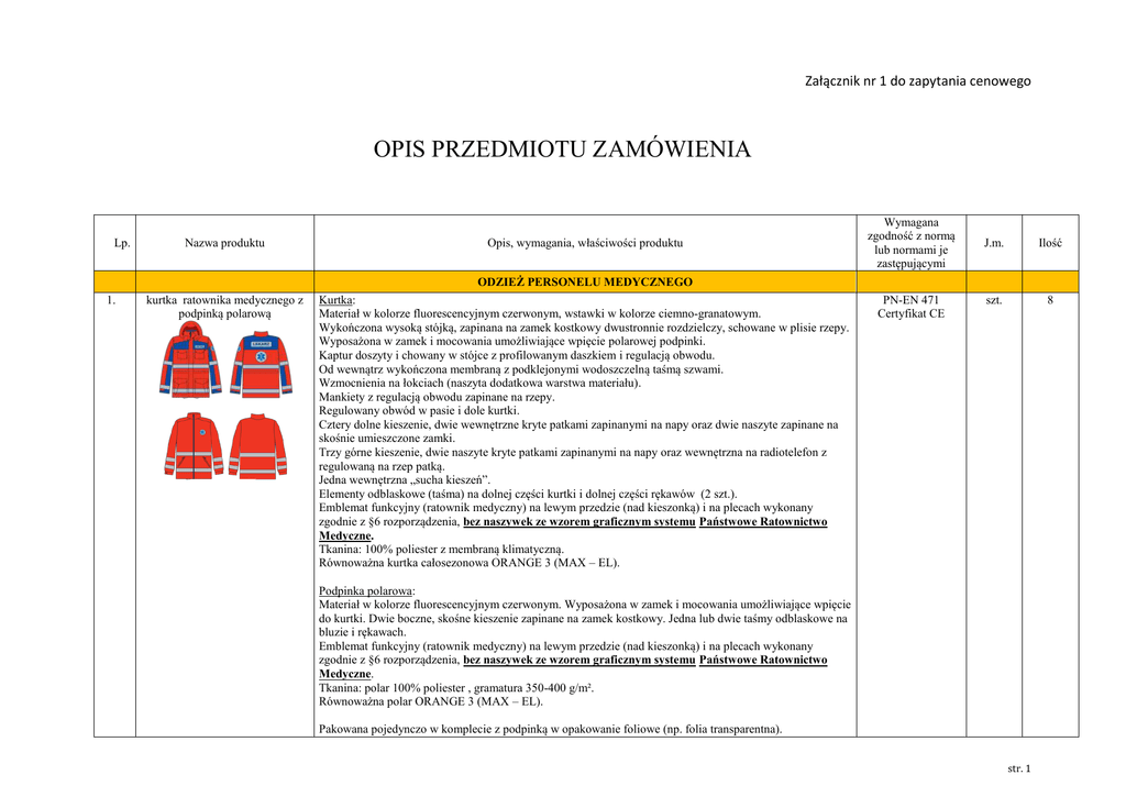 Załącznik nr 1 do zapytania cenowego OPIS PRZEDMIOTU ZAMÓWIENIA Lp. 1. Nazwa produktu kurtka ratownika medycznego z podpinką polarową Opis, wymagania, właściwości produktu ODZIEŻ PERSONELU MEDYCZNEGO Kurtka: Materiał w kolorze fluorescencyjnym czerwonym, wstawki w kolorze ciemno-granatowym. Wykończona wysoką stójką, zapinana na zamek kostkowy dwustronnie rozdzielczy, schowane w plisie rzepy. Wyposażona w zamek i mocowania umożliwiające wpięcie polarowej podpinki. Kaptur doszyty i chowany w stójce z profilowanym daszkiem i regulacją obwodu. Od wewnątrz wykończona membraną z podklejonymi wodoszczelną taśmą szwami. Wzmocnienia na łokciach (naszyta dodatkowa warstwa materiału). Mankiety z regulacją obwodu zapinane na rzepy. Regulowany obwód w pasie i dole kurtki. Cztery dolne kieszenie, dwie wewnętrzne kryte patkami zapinanymi na napy oraz dwie naszyte zapinane na skośnie umieszczone zamki. Trzy górne kieszenie, dwie naszyte kryte patkami zapinanymi na napy oraz wewnętrzna na radiotelefon z regulowaną na rzep patką. Jedna wewnętrzna „sucha kieszeń”. Elementy odblaskowe (taśma) na dolnej części kurtki i dolnej części rękawów (2 szt.). Emblemat funkcyjny (ratownik medyczny) na lewym przedzie (nad kieszonką) i na plecach wykonany zgodnie z §6 rozporządzenia, bez naszywek ze wzorem graficznym systemu Państwowe Ratownictwo Medyczne. Tkanina: 100% poliester z membraną klimatyczną. Równoważna kurtka całosezonowa ORANGE 3 (MAX – EL). Wymagana zgodność z normą lub normami je zastępującymi PN-EN 471 Certyfikat CE J.m. Ilość szt. 8 Podpinka polarowa: Materiał w kolorze fluorescencyjnym czerwonym. Wyposażona w zamek i mocowania umożliwiające wpięcie do kurtki. Dwie boczne, skośne kieszenie zapinane na zamek kostkowy. Jedna lub dwie taśmy odblaskowe na bluzie i rękawach. Emblemat funkcyjny (ratownik medyczny) na lewym przedzie (nad kieszonką) i na plecach wykonany zgodnie z §6 rozporządzenia, bez naszywek ze wzorem graficznym systemu Państwowe Ratownictwo Medyczne. Tkanina: polar 100% poliester , gramatura 350-400 g/m². Równoważna polar ORANGE 3 (MAX – EL). Pakowana pojedynczo w komplecie z podpinką w opakowanie foliowe (np. folia transparentna). str. 1 Lp. 2. Nazwa produktu Opis, wymagania, właściwości produktu Wymagana zgodność z normą lub normami je zastępującymi Spodnie całoroczne ratownika medycznego Metka z rozmiarem, nazwą producenta, składem surowcowym i instrukcją dotyczącą sposobu konserwacji wszyta w sposób trwały w produkt. Odzież spełniająca wymogi i normy (oraz normy je zastępujące) określone w Rozporządzeniu Ministra Zdrowia w sprawie oznaczenia systemu Państwowe Ratownictwo Medyczne oraz wymagań w zakresie umundurowania członków zespołów ratownictwa medycznego z dnia 18 października 2010 r. Emblemat funkcyjny (ratownik medyczny) na lewym przedzie (nad kieszonką) i na plecach wykonany zgodnie z §6 rozporządzenia, bez naszywek ze wzorem graficznym systemu Państwowe Ratownictwo Medyczne. Materiał w kolorze fluorescencyjnym czerwonym, wstawki w kolorze ciemno-granatowym. Od wewnątrz wykończone membraną z podklejonymi wodoszczelną taśmą szwami. Zapinane na guzik i metalowy zamek. Wykończone pasem z gumową regulacją oraz wzmocnionymi szlufkami. Dwie wpuszczane kieszenie biodrowe. Z tyłu jedna kieszeń wpuszczana z patką, zapinana na napę. Na nogawkach dwie kieszenie bojówkowe, kryte patkami, zapinane na napy. Wzmocnione kolana oraz kostkowe zamki wszywane po zewnętrznej stronie dołu nogawek. Elementy odblaskowe (taśma) na dolnej części nogawek (2 szt.). Tkanina: 35% bawełna, 65 % poliester, gramatura 200 - 220g/m², kurczliwość 1,5-2%, temperatura prania do 60 st. C. Równoważna spodnie całoroczne ORANGE 3 (MAX – EL). PN-EN 471 Certyfikat CE J.m. Ilość szt. 8 Metka z rozmiarem, nazwą producenta, składem surowcowym i instrukcją dotyczącą sposobu konserwacji wszyta w sposób trwały w produkt. Pakowane pojedynczo w opakowanie foliowe (np. folia transparentna). Odzież spełniająca wymogi i normy (oraz normy je zastępujące) określone w Rozporządzeniu Ministra Zdrowia w sprawie oznaczenia systemu Państwowe Ratownictwo Medyczne oraz wymagań w zakresie umundurowania członków zespołów ratownictwa medycznego z dnia 18 października 2010 r. str. 2 Lp. 3. Nazwa produktu Ubranie letnie ratownika medycznego (damskie/męskie) Opis, wymagania, właściwości produktu Ubranie składające się z bluzy i spodni: Wymagana zgodność z normą lub normami je zastępującymi PN-EN 471 Certyfikat CE J.m. Ilość kpl. 11 – M 8-D PN-EN 471 Certyfikat CE szt. 15 – M 10 - D PN-EN 471 Certyfikat CE szt. 10 Bluza jednorzędowa ze stójką zapinana z przodu na sześć guzików (od 1,5 do 2 cm). Tył bluzy jednoczęściowy. Rękawy długie wszywane w pachę. Z przodu 2 kieszonki górne oraz 2 kieszenie dolne. Elementy odblaskowe (taśma) na rękawach (2 szt.) oraz z przodu i z tyłu na wysokości bioder (1szt.) Tkanina: 35% bawełna, 65 % poliester, kolor: czerwień fluorescencyjna gramatura 200 - 220g/m², kurczliwość 1,5-2%, temperatura prania do 60 st. C. Metka z rozmiarem, nazwą producenta, składem surowcowym i instrukcją dotyczącą sposobu konserwacji wszyta w sposób trwały w produkt. Równoważna bluza letnia ORANGE 3 (MAX – EL). Pakowana pojedynczo ze spodniami w opakowanie foliowe (np. folia transparentna). Odzież spełniająca wymogi i normy (oraz normy je zastępujące) określone w Rozporządzeniu Ministra Zdrowia w sprawie oznaczenia systemu Państwowe Ratownictwo Medyczne oraz wymagań w zakresie umundurowania członków zespołów ratownictwa medycznego z dnia 18 października 2010 r. Emblemat funkcyjny (ratownik medyczny) na lewym przedzie (nad kieszonką) i na plecach wykonany zgodnie z §6 rozporządzenia, bez naszywek ze wzorem graficznym systemu Państwowe Ratownictwo Medyczne. 4. Koszulka letnia ratownika medycznego (damskie/mę