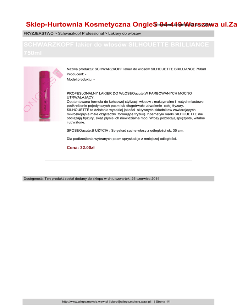 czwartek, 03 lipiec 2014 Sklep-Hurtownia Kosmetyczna OngleSUtworzono: 04-419 Warszawa ul.Za FRYZJERSTWO > Schwarzkopf Professional > Lakiery do włosów SCHWARZKOPF lakier do włosów SILHOUETTE BRILLIANCE 750ml Nazwa produktu: SCHWARZKOPF lakier do włosów SILHOUETTE BRILLIANCE 750ml Producent: Model produktu: - PROFESJONALNY LAKIER DO WŁOSÓW FARBOWANYCH MOCNO UTRWALAJĄCY. Opatentowana formuła do końcowej stylizacji włosow : maksymalne i natychmiastowe podkreślenie pojedynczych pasm lub długotrwałe utrwalenie całej fryzury. SILHOUETTE to działanie wysokiej jakości aktywnych składnikow zawierających mikroskopijnie małe cząsteczki formujące fryzurę. Kosmetyki marki SILHOUETTE nie obciążają fryzury, skąd płynie ich niewidzialna moc. Włosy pozostają sprężyste, witalne i utrwalone. SPOSÓB UŻYCIA : Spryskać suche włosy z odległości ok. 35 cm. Dla podkreślenia wybranych pasm spryskać je z mniejszej odległości. Cena: 32.00zł Dostępność: Ten produkt został dodany do sklepu w dniu czwartek, 26 czerwiec 2014 http://www.allepaznokcie.waw.pl | [email protected] | | Strona 1/1