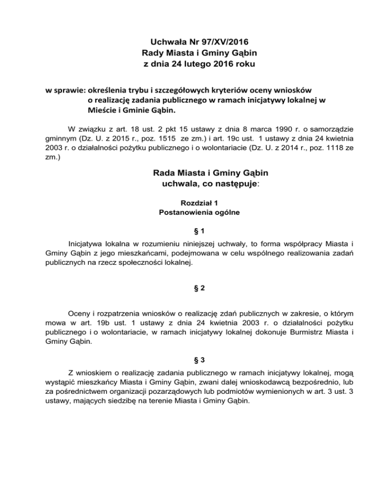 Uchwała Nr 97/XV/2016 Rady Miasta i Gminy Gąbin z dnia 24 lutego 2016 roku w sprawie: określenia trybu i szczegółowych kryteriów oceny wniosków o realizację zadania publicznego w ramach inicjatywy lokalnej w Mieście i Gminie Gąbin. W związku z art. 18 ust. 2 pkt 15 ustawy z dnia 8 marca 1990 r. o samorządzie gminnym (Dz. U. z 2015 r., poz. 1515 ze zm.) i art. 19c ust. 1 ustawy z dnia 24 kwietnia 2003 r. o działalności pożytku publicznego i o wolontariacie (Dz. U. z 2014 r., poz. 1118 ze zm.) Rada Miasta i Gminy Gąbin uchwala, co następuje: Rozdział 1 Postanowienia ogólne §1 Inicjatywa lokalna w rozumieniu niniejszej uchwały, to forma współpracy Miasta i Gminy Gąbin z jego mieszkańcami, podejmowana w celu wspólnego realizowania zadań publicznych na rzecz społeczności lokalnej. §2 Oceny i rozpatrzenia wniosków o realizację zdań publicznych w zakresie, o którym mowa w art. 19b ust. 1 ustawy z dnia 24 kwietnia 2003 r. o działalności pożytku publicznego i o wolontariacie, w ramach inicjatywy lokalnej dokonuje Burmistrz Miasta i Gminy Gąbin. §3 Z wnioskiem o realizację zadania publicznego w ramach inicjatywy lokalnej, mogą wystąpić mieszkańcy Miasta i Gminy Gąbin, zwani dalej wnioskodawcą bezpośrednio, lub za pośrednictwem organizacji pozarządowych lub podmiotów wymienionych w art. 3 ust. 3 ustawy, mających siedzibę na terenie Miasta i Gminy Gąbin. Rozdział 2 Współudział w realizacji inicjatywy lokalnej §4 1. Współudział wnioskodawcy w realizacji zadania publicznego w ramach inicjatywy lokalnej może polegać na: a) świadczeniu pracy społecznej; b) świadczeniach pieniężnych, c) świadczeniach rzeczowych. 2. Wsparcie ze strony Miasta i Gminy Gąbin może polegać na: a) wsparciu rzeczowym – w zakresie możliwości miasta, poprzez użyczenie, udostępnienie rzeczy (sprzętu, narzędzi, materiałów) niezbędnych do realizacji inicjatywy, b) wsparciu organizacyjnym – w zakresie możliwości miasta, poprzez wsparcie merytoryczne przy opracowaniu dokumentacji oraz doradztwo 3. Wysokość środków budżetowych zaangażowanych przez Miasto i Gminę Gąbin w ramach inicjatywy lokalnej nie może przekroczyć 70% jej całkowitych kosztów (rozumianych jako suma świadczeń: pracy społecznej, środków finansowych oraz świadczeń rzeczowych). Rozdział 3 Postępowanie w sprawie inicjatywy lokalnej §5 1. Rozpatrzenie wniosku następuje w terminie miesiąca, a wniosku szczególnie skomplikowanego w terminie dwóch miesięcy - od dnia wpływu. 2. W przypadku niemożliwości rozpatrzenia wniosku w terminach wymienionych w ust. 1, Burmistrz zawiadamia wnioskodawcę o przyczynach niezałatwienia w terminie oraz wyznacza nowy termin do rozpatrzenia wniosku. 3. W razie wystąpienia braków wniosku, uniemożliwiających jego ocenę, wnioskodawca ostaje wezwany do uzupełnienia wniosku. 4. Burmistrz zawiadamia na piśmie o wynikach oceny wniosku. 5. W przypadku pozytywnego rozpatrzenia wniosku wraz z informacją, o której mowa w ust.4, Burmistrz przesyła wnioskodawcy zaproszenie do zawarcia umowy i wspólnego sporządzenia dokumentów niezbędnych do przeprowadzenia inicjatywy lokalnej. 6. Wniosek złożony w ramach inicjatywy lokalnej powinien zawierać: a) informację o wnioskodawcy; tj. imię i nazwisko, dane adresowe pełnomocnika mieszkańców lub nazwę i adres organizacji pozarządowej, wraz z listą mieszkańców składających wniosek, zawierającą ich imiona i nazwiska, adresy zamieszkania i podpisy, b) nazwę i dokładny opis zadania będącego przedmiotem wniosku, w tym: lokalizację zadania, proponowany zakres rzeczowy, wstępny harmonogram realizacji poszczególnych działań, opis dotychczas wykonanych prac i podjętych działań, określenie stopnia przygotowania zadania przez wnioskodawcę na dzień złożenia wniosku, deklarację wnioskodawcy o wielkości i sposobie wniesienia jego udziału w realizację zadania, szacunkowy koszt realizacji zadania wraz ze wskazaniem źródeł finansowania, określenie społecznych korzyści wynikających z inicjatywy lokalnej, c) przykładowy wzór wniosku w ramach inicjatywy lokalnej stanowi załącznik do niniejszej uchwały. 7. Do wniosku należy załączyć jeden z niżej wymienionych dokumentów: a) odpis z KRS lub innego rejestru potwierdzającego status prawny podmiotu, o którym mowa w §3, b) pełnomocnictwo – dla osoby reprezentującej grupę mieszkańców. 8. Burmistrz Miasta i Gminy Gąbin podejmuje decyzję o przyjęciu wniosku do realizacji zadania publicznego, bądź odmowie, w terminie o którym mowa w §5 pkt 1. W przypadku odmowy realizacji wnioskowanego zadania publicznego, zawiadomienie będzie zawierało uzasadnienie negatywnego rozpatrzenia wniosku. §6 Burmistrz Miasta i Gminy Gąbin dokonując oceny wniosku o realizację zadania publicznego w ramach inicjatywy lokalnej bierze pod uwagę: 1) celowość realizacji wnioskowanego zadania z punktu widzenia potrzeb społeczności lokalnej, 2) gospodarność proponowanego sposobu wykonania zadania publicznego, 3) wkład proponowanej pracy społecznej w realizację inicjatywy lokalnej, 4) ocenia wielkość środków rzeczowych i kwalifikacje osób organizujących i realizujących zadanie, 5) uwzględnia planowany udział finansowych środków własnych wnioskodawcy oraz przeznaczone środki publiczne na ten cel, 6) ocenia proponowaną jakość wykonania zadania i przedstawioną kalkulację koszów w odniesieniu do zakresu rzeczowego zadania. §7 1. Po uwzględnieniu wniosku Burmistrz Miasta i Gminy Gąbin zawiera umowę z wnioskodawcą o wykonanie zadania publicznego w ramach inicjatywy lokalnej. 2. Umowa o której mowa w ust 1 zawierana jest na czas określony i obejmuje: a) szczegółowy opis zadania publicznego, b) termin wykonania zadania publicznego, c) wskazanie zadań stron w ramach inicjatywy lokalnej, d) tryb kontroli wykonania zadania publicznego, e) termin i sposób rozliczania zadania publicznego. §8 Burmi