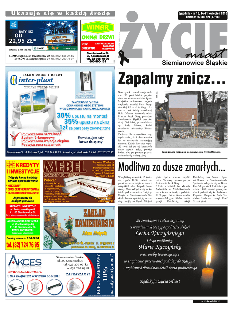 Nasz rynek zmienił swoje oblicze. W poniedziałek popołudniu, na siemianowickim Rynku Miejskim umieszczono zdjęcie tragicznie zmarłej Pary Prezydenckiej RP, a także flagę z kirem – znak żałoby narodowej. Hołd Ofiarom katastrofy oddali m.in. Jacek Guzy, prezydent Siemianowic Śląskich oraz Andrzej Gościniak, przewodniczący Rady Miasta, Radni, uczniowie, mieszkańcy Siemianowic. Zarówno dla uczestników tego wydarzenia, jak i obserwatorów był to niezwykle wzruszający moment. Każdy, kto chce wyrazić swój żal po tej katastrofie może zapalić znicz, położyć kwiat, albo po porostu przystanąć na chwilę w ciszy. W najbliższy czwartek, 15 kwietnia, o godz. 18.00 zostanie odprawiona msza święta w intencji wszystkich ofiar Tragedii Narodowej. Msza odbędzie się w kościele pod wezwaniem Świętego Krzyża w Siemianowicach Śląskich. Po uroczystości jej uczestnicy przejdą na Rynek Miejski, gdzie będzie można zapalić znicz. Na mszę zaprasza prezydent miasta Jacek Guzy. Z kolei w kościele św. Michała Archanioła w Michałkowicach msza święta w środę o godzinie 18.00 poprzedzi spotkanie modlitewno-refleksyjne Klubu Inteligencji Katolickiej, Akcji Katolickiej oraz Prawa i Sprawiedliwości w Siemianowicach. Spotkanie odbędzie się w Domu Parafialnym obok kościoła o godzinie 19.00, swoimi przemyśleniami podzieli się ks. Proboszcz Eugeniusz Kurpas, ks. Prałat Stanisław Sierla oraz muzyk Józef Skrzek. od poniedziałku w sali sesyjnej ratusza wystawiona jest księga kondolencyjna, w której można dokonywać wpisów w związku z tragedią narodową pod Smoleńskiem. Księga wystawiona będzie do końca tygodnia w godzinach otwarcia Urzędu Miasta. Od wtorku do czwartku w godz. 8.00 - 16.00, a w piątek od 8.00 do 14.00. Również w Biurze Promocji Miasta przy Rynku 7 została wystawiona księga kondolencyjna, w której bytomianie mogą wpisać wyrazy współczucia i żalu po stracie pary prezydenckiej, polityków i osób towarzyszących, zmierzających na polskie uroczystości uczczenia ofiar zbrodni katyńskiej. Księga kondolencyjna wystawiona będzie w Biurze Promocji Miasta do soboty od 10.00 do 18.00. Piekarzanie, którzy zechcą upamiętnić Ofiary katastrofy, będą mogli składać swoje wpisy w księdze kondolencyjnej wyłożo- W Siemianowicach wszystkie atrakcje i występy, jakie zaplanowano w związku z akcją MOTOSERCE zostały odwołane, jednak nie zrezygnowano ze zbiórki krwi dla potrzebujących dzieci. Sobota była pełna zadumy, smutku, ale także świadomości, że w obliczu tragedii musimy okazywać sobie wsparcie. W tak trudnej chwili warto było więc wykonać gest, o który prosili organizatorzy akcji – oddać krew. Pobieranie krwi zgod- nej w Urzędzie Miasta . Jako pierwszy do księgi wpisał się prezydent Stanisław Korfanty. Prezydent napisał między innymi: Księga kondolencyjna została wystawiona także w Urzędzie Mia- sta , w holu na parterze. Mieszkańcy mogą dokonywać wpisów do piątku w godzinach pracy urzędu. W księgach kondolencyjnych, które wystawione są w całym kraju pojawia się mnóstwo wpisów, Polacy, ale także obcokrajowcy, próbują ująć w słowa swoje emocje, oddają cześć Ofiarom tej strasznej tragedii i składają kondolencje ich rodzinom. nie z zapowiedzią odbywało się w Poradni Psychologiczno - Pedagogicznej na ulicy ul. Olimpijskiej 2A, obok boiska, na którym zamiast tłumu rozbawionych ludzi zapanowała cisza i spokój. W podobny charakterze odbyła się także akcja MOTOSERCE w Bytomiu. Bez koncertów i zabawy, za to w poczuciu solidarności i w przekonaniu, że warto oddawać krew. Siemianowice Śląskie - 17 000 egz. Bytom, Piekary Śląskie, Radzionków - 18 000 egz. Marcin Wroński Barbara Jendrzejczyk Dagmara Brudek, Zbigniew Wieczorek, Anna Witkowska, Agnieszka Skowronek [email protected] tel./fax 032-765-96-39 kom. 502-968-234; 502 067 181 [email protected] MEDIANA Firma Usługowo-Informacyjna, Siemianowice Śląskie Polskapresse Sp. z o.o. Sosnowiec ul. Świerczewskiego 30/3 41-100 Siemianowice Śląskie Redakcja nie ponosi odpowiedzialności za treść reklam i ogłoszeń. Zastrzegamy sobie prawo do skracania i adjustacji materiałów. Nie zamówionych materiałów nie zwracamy. Zamieszczane w tej gazecie teksty, zdjęcia i opracowania graficzne są własnością wydawcy i nie mogą być bez jego zgody wykorzystywane w innych mediach. W turnieju tym wziął udział Uczniowski Klub Sportowy Wołodyjowski przy ZS Nr 4 z Siemianowic Śląskich. W pierwszym dniu turnieju wystartowały w pierwszej kolejności starsze zawodniczki z rocznika 1996/98, Klaudia Serwacka, Iza Konwicka i Marysia Miszczak zajmując kolejno 20, 31 i 49 miejsce. Tak słabe wyniki wiążą się z przejściem zawod- niczek z mini szpad na szpady pełno wymiarowe. Zawodniczki te, ze względu na osiągnięty wiek musiały po raz pierwszy walczyć ze starszymi i bardziej doświadczonymi zawodniczkami. W kolejnym etapie szermierczych walk wystąpiły zawodniczki w kategorii wiekowej 1999/2000 Basia Brych, Ola Pernach i debiutująca Monika Kowasz, zajmując kolejno 3, 12 i 34 miejsce. Należy złożyć oklaski debiutującej Monice, która mimo zajętej dalekiej pozycji, swoją postawą i walecznością potrafiła zainteresować obserwatorów turnieju. W następnym dniu mieli wystartować chłopcy, jednak ze względu na tragedię, która dotknęła nasz kraj dalszy ciąg zawodów został odwołany. Przed 15.00 obie trumny w Pałacu Prezydenckim zostają udostępnione czekającym tu od rana, a czasami od poniedziałku ludziom. Kolejka chętnych sięga Kolumny Króla Zygmunta III. Czeka się w niej nawet 6 godzin. Nie przeszkadza nawet deszcz i zapowiedź burzy z piorunami. Jest cicho, pracują tylko ekipy telewizji ze wszystkich chyba krajów świata. W chwili kiedy byliśmy na miejscu wywiadu udzielała właśnie Justyna Steczkowska z stroju żałobnym, a przecież 9 kwietnia gościliśmy ją w jakże innym nastro