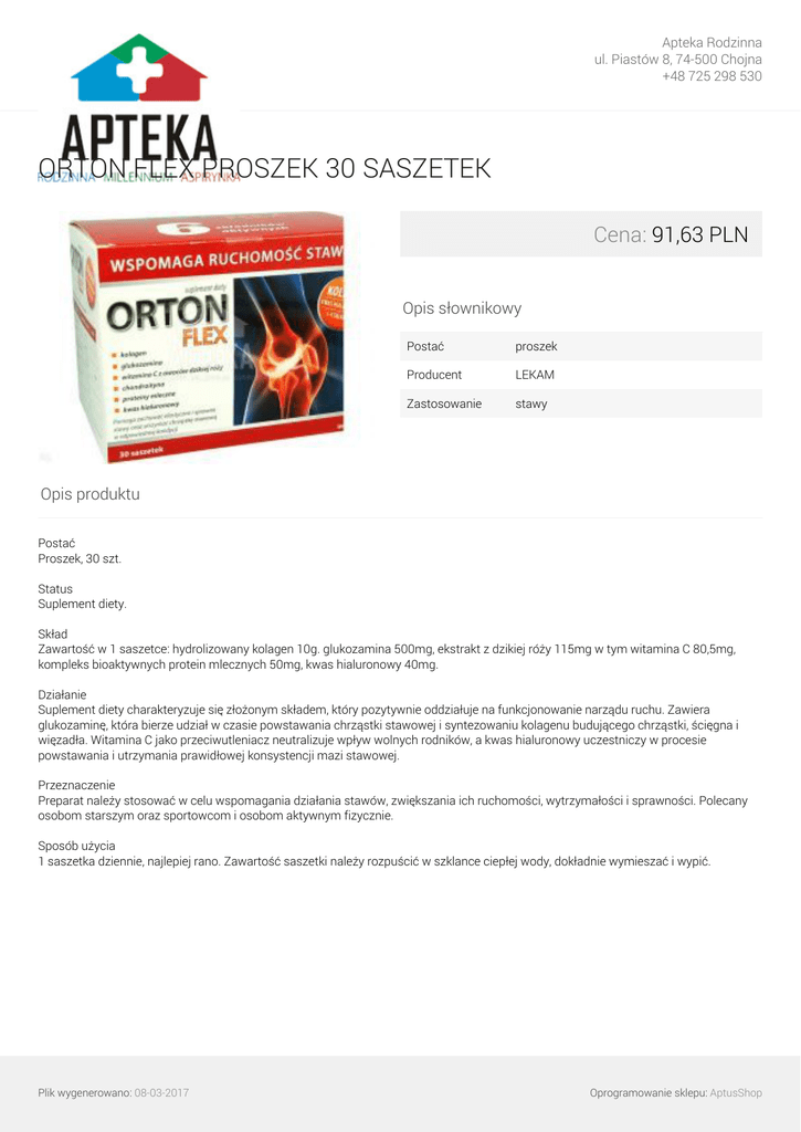 Apteka Rodzinna ul. Piastów 8, 74-500 Chojna +48 725 298 530 ORTON FLEX PROSZEK 30 SASZETEK Cena: 91,63 PLN Opis słownikowy Postać proszek Producent LEKAM Zastosowanie stawy Opis produktu Postać Proszek, 30 szt. Status Suplement diety. Skład Zawartość w 1 saszetce: hydrolizowany kolagen 10g. glukozamina 500mg, ekstrakt z dzikiej róży 115mg w tym witamina C 80,5mg, kompleks bioaktywnych protein mlecznych 50mg, kwas hialuronowy 40mg. Działanie Suplement diety charakteryzuje się złożonym składem, który pozytywnie oddziałuje na funkcjonowanie narządu ruchu. Zawiera glukozaminę, która bierze udział w czasie powstawania chrząstki stawowej i syntezowaniu kolagenu budującego chrząstki, ścięgna i więzadła. Witamina C jako przeciwutleniacz neutralizuje wpływ wolnych rodników, a kwas hialuronowy uczestniczy w procesie powstawania i utrzymania prawidłowej konsystencji mazi stawowej. Przeznaczenie Preparat należy stosować w celu wspomagania działania stawów, zwiększania ich ruchomości, wytrzymałości i sprawności. Polecany osobom starszym oraz sportowcom i osobom aktywnym fizycznie. Sposób użycia 1 saszetka dziennie, najlepiej rano. Zawartość saszetki należy rozpuścić w szklance ciepłej wody, dokładnie wymieszać i wypić. Plik wygenerowano: 08-03-2017 Powered by TCPDF (www.tcpdf.org) Oprogramowanie sklepu: AptusShop