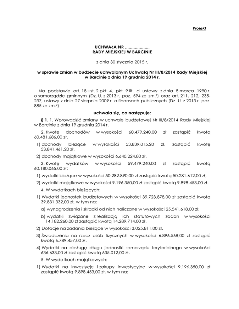 Projekt UCHWAŁA NR .................... RADY MIEJSKIEJ W BARCINIE z dnia 30 stycznia 2015 r. w sprawie zmian w budżecie uchwalonym Uchwałą Nr III/8/2014 Rady Miejskiej w Barcinie z dnia 19 grudnia 2014 r. Na podstawie art. 18 ust. 2 pkt 4, pkt 9 lit. d ustawy z dnia 8 marca 1990 r. o samorządzie gminnym (Dz. U. z 2013 r. poz. 594 ze zm.1) oraz art. 211, 212, 235237, ustawy z dnia 27 sierpnia 2009 r. o finansach publicznych (Dz. U. z 2013 r. poz. 885 ze zm.2) uchwala się, co następuje: § 1. 1. Wprowadzić zmiany w uchwale budżetowej Nr III/8/2014 Rady Miejskiej w Barcinie z dnia 19 grudnia 2014 r. 2. Kwotę dochodów 60.481.686,00 zł. 1) dochody bieżące 53.841.461,20 zł, w wysokości w wysokości 60.479.240,00 53.839.015,20 zł zastąpić kwotą zł, zastąpić kwotę zł zastąpić kwotą 2) dochody majątkowe w wysokości 6.640.224,80 zł. 3. Kwotę wydatków 60.180.065,00 zł: w wysokości 59.479.240,00 1) wydatki bieżące w wysokości 50.282.890,00 zł zastąpić kwotą 50.281.612,00 zł, 2) wydatki majątkowe w wysokości 9.196.350,00 zł zastąpić kwotą 9.898.453,00 zł. 4. W wydatkach bieżących: 1) Wydatki jednostek budżetowych w wysokości 39.723.878,00 zł zastąpić kwotą 39.831.332,00 zł, w tym na: a) wynagrodzenia i składki od nich naliczane w wysokości 25.541.618,00 zł, b) wydatki związane z realizacją ich statutowych 14.182.260,00 zł zastąpić kwotą 14.289.714,00 zł. zadań w wysokości 2) Dotacje na zadania bieżące w wysokości 3.025.811,00 zł. 3) Świadczenia na rzecz osób fizycznych w wysokości 6.896.568,00 zł zastąpić kwotą 6.789.457,00 zł. 4) Wydatki na obsługę długu jednostki samorządu terytorialnego w wysokości 636.633,00 zł zastąpić kwotą 635.012,00 zł. 5. W wydatkach majątkowych: 1) Wydatki na inwestycje i zakupy inwestycyjne w wysokości 9.196.350,00 zł zastąpić kwotą 9.898.453,00 zł, w tym na: a) wydatki na programy finansowane z udziałem środków, o których mowa w art. 5 ust. 1 pkt 2 i 3 ustawy o finansach publicznych, w części związanej w realizacją zadań jednostki samorządu terytorialnego w wysokości 32.451,00 zł. 6. Nadwyżkę budżetową w wysokości 301.621,00 zł przeznacza się na spłatę otrzymanych pożyczek z Wojewódzkiego Funduszu Ochrony Środowiska i Gospodarki Wodnej. 7. Wolne środki, o których mowa w art. 217 ust. 2 pkt 6 ustawy o finansach publicznych w wysokości 786.525,00 zł przeznacza się na spłatę otrzymanych pożyczek z Wojewódzkiego Funduszu Ochrony Środowiska i Gospodarki Wodnej. § 2. Określa się limit zobowiązań z tytułu zaciągniętych kredytów i pożyczek oraz emitowanych papierów wartościowych na finansowanie przejściowego deficytu budżetu w kwocie 1.000.000,00 zł. § 3. Wykonanie Uchwały powierza się Burmistrzowi Barcina. § 4. Uchwała wchodzi w życie z dniem ogłoszenia w sposób zwyczajowo przyjęty. 1] Zmiany tekstu jednolitego wymienionej ustawy zostały ogłoszone w Dz. U. z 2013 r. poz. 645 oraz poz. 1318, z 2014 r. poz. 379, poz. 1072. 2] Zmiany tekstu jednolitego wymienionej ustawy zostały ogłoszone w Dz. U. z 2013 r. poz. 938, poz. 1646, z 2014 r. poz. 379, poz. 911, poz. 1146, poz. 1626, poz. 1877. Uzasadnienie 1) Wprowadza się zmiany w Uchwale budżetowej Nr III/8/2014 Rady Miejskiej w Barcinie z dnia 19 grudnia 2014 roku po stronie dochodów w wysokości 2.446,00 zł oraz wydatków w wysokości 700.825,00 zł. 2) Zgodnie z zapisami Rozporządzenia Ministra Finansów z dnia 16 grudnia 2014 r. zmieniającego rozporządzenie w sprawie szczegółowej klasyfikacji dochodów, wydatków, przychodów i rozchodów oraz środków pochodzących ze źródeł zagranicznych (Dz. U. z 2014 r. poz. 1952), dokonuje się zmiany planu dochodów z tytułu opłaty za gospodarowanie odpadami komunalnymi z działu 756, rozdz. 75618 "Wpływy z innych opłat stanowiących dochody jednostek samorządu terytorialnego na podstawie ustaw" do działu 900, rozdz. 90002 "Gospodarka odpadami". 3) W planie dochodów w dziale 801, rozdz. 80101 wprowadza się § 2400 "Wpływy do budżetu pozostałości środków finansowych gromadzonych na wydzielonym rachunku jednostki budżetowej" w wysokości 780,00 zł, z tytułu przekazania na rachunek budżetu gminy niewykorzystanych w 2014 r. środków finansowych zgromadzonych na rachunku wydzielonym Szkoły Podstawowej Nr 2 w Barcinie. Jednocześnie w planie wydatków dokonuje się zwiększenia w dziale 801, rozdz. 80101 § 4210 „Zakup materiałów i wyposażenia" o wyżej wymienioną kwotę. 4) W związku z otrzymaniem darowizny od firmy Chemirol z Mogilna z przeznaczeniem na dofinansowanie wyżywienia uczniów Zespołu Publicznych Szkół Nr 1 w Piechcinie, wprowadza się w planie dochodów w dziale 801, rozdz. 80148 § 0960 "Otrzymane spadki, zapisy i darowizny w postaci pieniężnej" w wysokości 1.666,00 zł. W związku z powyższym w planie wydatków dokonuje się zwiększenia w dziale 801, rozdz. 80148 § 4220 "Zakup środków żywności" o wyżej wymienioną kwotę. 5) W Funduszu Sołeckiego dokonuje się następujących zmian w planie wydatków: Nazwa sołectwa Dział Rozdział Paragraf 010 01095 4300 Zakup usług pozostałych 1,00 900 90095 6050 Opracowanie projektu zagospodarowania działki nr 86 w Barcinie Wsi 1,00 Dąbrówka Barcińska 010 01095 4210 Zakup materiałów i wyposażenia 1,00 Józefinka 010 01095 6050 Doposażenie placu zabaw w Kniei (sołectwo Józefinka) 1,00 Kania 010 01095 4210 Zakup materiałów i wyposażenia 1,00 Krotoszyn 900 90095 6050 Utwardzenie placu przy świetlicy wiejskiej w Krotoszynie 1,00 Piechcin 600 60017 6050 Budowa chodnika przy ul. Pałacowej w Piechcinie 1,00 Sadłogoszcz 010 01095 4210 Zakup materiałów i wyposażenia 1,00 Zalesie Barcińskie 900 90095 6050 Modernizacja świetlicy wiejskiej w Zalesiu Barcińskim 1,00 Złotowo 010 01095 6050 Budowa placu zabaw w sołectwie Złotowo 1,00 Barcin Wieś Nazwa paragrafu/zadania Wartość 6) Zgodnie z zapisami Rozporządzenia