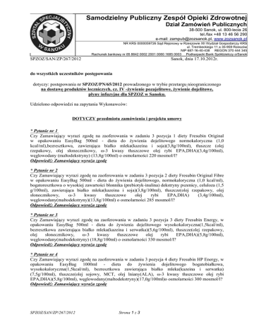 Samodzielny Publiczny Zespół Opieki Zdrowotnej Dział Zamówień Publicznych 38-500 Sanok, ul. 800-lecia 26 tel./fax +48 13 46 56 290 e-mail: [email protected], www.zozsanok.pl NR KRS 0000059726 Sąd Rejonowy w Rzeszowie XII Wydział Gospodarczy KRS ul. Trembeckiego 11 a 35-959 Rzeszów NIP 687-16-40-438 REGON 370 444 345 Rachunek bankowy nr 85 8642 0002 2001 0060 1685 0003 Podkarpacki Bank Spółdzielczy o/Sanok SPZOZ/SAN/ZP/267/2012 Sanok, dnia 17.10.2012r. do wszystkich uczestników postępowania dotyczy: postępowania nr SPZOZ/PN/65/2012 prowadzonego w trybie przetargu nieograniczonego na dostawę produktów leczniczych, cz. IV -żywienie pozajelitowe, żywienie dojelitowe, płyny infuzyjne dla SPZOZ w Sanoku. Udzielono odpowiedzi na zapytania Wykonawców: DOTYCZY przedmiotu zamówienia i projektu umowy * Pytanie nr 1 Czy Zamawiający wyrazi zgodę na zaoferowania w zadaniu 3 pozycja 1 diety Fresubin Original w opakowaniu EasyBag 500ml - dieta do żywienia dojelitowego normokaloryczna (1,0 kcal/ml),bezresztkowa, zawierająca białko mleka(kazeina i soja)(3,8g/100ml), tłuszcze (olej rzepakowy, olej słonecznikowy, ω-3 kwasy tłuszczowe olej rybi EPA,DHA)(3,4g/100ml), węglowodany (maltodekstryny) (13,8g/100ml) o osmolarności 220 mosmol/l? Odpowiedź: Zamawiający wyraża zgodę * Pytanie nr 2 Czy Zamawiający wyrazi zgodę na zaoferowania w zadaniu 3 pozycja 2 diety Fresubin Original Fibre w opakowaniu EasyBag 500ml - dieta do żywienia dojelitowego, normokaloryczna (1,0 kcal/ml), bogatoresztkowa o wysokiej zawartości błonnika (prebiotyk-inulina) dekstryny pszenicy, celuloza (1,5 g/100ml), zawierająca białko mleka(kazeina i soja)(3,8g/100ml), tłuszcze(olej rzepakowy, olej słonecznikowy, ω-3 kwasy tłuszczowe olej rybi EPA,DHA) (3,4g/100ml), węglowodany(maltodekstryny)(13,8g/100ml) o osmolarności 285 mosmol/l? Odpowiedź: Zamawiający wyraża zgodę * Pytanie nr 3 Czy Zamawiający wyrazi zgodę na zaoferowania w zadaniu 3 pozycja 3 diety Fresubin Energy, w opakowaniu EasyBag 500ml - dieta do żywienia dojelitowego wysokokaloryczna(1,5kcal/ml), bezresztkowa zawierająca białko mleka(kazeina i serwatka)(5,6g/100ml), tłuszcze(olej rzepakowy, olej słonecznikowy, ω-3 kwasy tłuszczowe olej rybi EPA,DHA)(5,8g/100ml), węglowodany(maltodekstryny) (18,8g/100ml) o osmolarności 330 mosmol/l? Odpowiedź: Zamawiający wyraża zgodę * Pytanie nr 4 Czy Zamawiający wyrazi zgodę na zaoferowania w zadaniu 3 pozycja 4 diety Fresubin HP Energy, w opakowaniu EasyBag 1000ml - dieta do żywienia dojelitowego bogatobiałkowa, wysokokaloryczna(1,5kcal/ml), bezresztkowa zawierająca białko mleka(kazeina i serwatka) (7,5g/100ml), tłuszcze(olej sojowy, MCT, olej lniany(ALA), ω-3 kwasy tłuszczowe olej rybi EPA,DHA)(5,8g/100ml), węglowodany(maltodekstryny)(17,0g/100ml)o osmolarności 300 mosmol/l? Odpowiedź: Zamawiający wyraża zgodę SPZOZ/SAN/ZP/267/2012 Strona 1 z 3 * Pytanie nr 5 Czy Zamawiający wyrazi zgodę na zaoferowania w zadaniu 3 pozycja 5 diety Reconvan w opakowaniu EasyBag 500ml w ilości 600 sztuk - dieta do żywienia dojelitowego bogatobiałkowa, normokaloryczna (1,0 kcal/ml), bezresztkowa, dla krytycznie chorych zawierająca białko (wysoka zawartość białka, glutaminy i argininy): mleko (kazeina, hydrolizat serwatki)(5,5g/100ml), tłuszcze (wysoka zawartość EPA i DHA z oleju rybiego, 58% MCT): olej rybi (EPA, DHA), olej szafranowy, olej lniany, MCT(3,3g/100ml), węglowodany: maltodekstryny(12g/100ml) o osmolarności 270 mosmol/l? Odpowiedź: Zamawiający wyraża zgodę * Pytanie nr 6 Czy Zamawiający wyrazi zgodę na zaoferowania w zadaniu 3 pozycja 6 diety Diben w opakowaniu EasyBag 1000ml - dieta do żywienia dojelitowego, normokaloryczna (1,0 kcal/ml), bogatoresztkowa, stosowana w cukrzycy zawierająca białko mleka(w tym kazeina)(4,5g/100ml) tłuszcze(wysoka zawartość tłuszczów, MUFA)(olej słonecznikowy, olej szafranowy, ω-3 kwasy tłuszczowe olej rybi EPA,DHA)(5,0g/100ml) o niskiej zawartości węglowodanów(skrobia, fruktoza) (9,25g/100ml) błonnik(wysoka zawartość)(dekstryny tapioki, celuloza mikrokrystaliczna) (1,5g/100ml) o osmolarności 345 mosmol/l? Odpowiedź: Zamawiający wyraża zgodę * Pytanie nr 7 Czy Zamawiający wyrazi zgodę na zaoferowania w zadaniu 3 pozycja 7 diety Survimed OPD w opakowaniu EasyBag 500ml - dieta do żywienia dojelitowego oligopeptydowa, normokaloryczna (1,0 kcal/ml), bezresztkowa(zawiera śladowe ilości celulozy), stosowana w zaburzeniach wchłaniania zawierająca białko (krótkołańcuchowe peptydy i wolne aminokwasy): hydrolizat serwatki(4,5g/100ml), tłuszcze (niska zawartość, 51% MCT): MCT, olej rzepakowy, olej szafranowy, olej rybi (EPA, DHA)(2,8g/100ml), węglowodany: maltodekstryny, modyfikowana skrobia(14,3g/100ml), błonnik(śladowa zawartość): celuloza(0,08g/100ml) o osmolarności 300 mosmol/l? Odpowiedź: Zamawiający wyraża zgodę * Pytanie nr 8 Czy Zamawiający wyrazi zgodę na zaoferowania w zadaniu 3 pozycja 8 diety Fresubin HP Energy, w opakowaniu EasyBag 500ml - dieta do żywienia dojelitowego bogatobiałkowa, wysokokaloryczna(1,5kcal/ml), bezresztkowa zawierająca białko mleka(kazeina i serwatka) (7,5g/100ml), tłuszcze(olej sojowy, MCT, olej lniany(ALA), ω-3 kwasy tłuszczowe olej rybi EPA,DHA)(5,8g/100ml), węglowodany(maltodekstryny)(17,0g/100ml)o osmolarności 300 mosmol/l? Odpowiedź: Zamawiający wyraża zgodę * Pytanie nr 9 - dot. zad. nr 2 żywienie pozajelitowe II Czy Zamawiający w Zadaniu nr 2 pozycja nr 1 dopuści preparat równoważny Aminosteril N-Hepa 8% 500 ml? Odpowiedź: Zamawiający dopuszcza * Pytanie nr 10 - dot. zad. nr 5 – płyny infuzyjne Czy Zamawiający w Zadaniu nr 5 pozycja nr 1 dopuści preparat Volulyte 6% - 6% Hydroksyetyloskrobia o masie cząsteczkowej 130/0,38 – 0,45 w roztworze zbilansowanym buforowany octanami o najniższej na rynku zawartości sodu i chlorków, z możliwością zastosowania u pacjentów z niewydolnością wątroby ? Odpowiedź: Zamaw