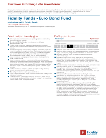 Kluczowe informacje dla inwestorów Niniejszy dokument zawiera kluczowe informacje dla inwestorów dotyczące tego funduszu. Nie są to materiały marketingowe. Dostarczenie tych informacji jest wymogiem prawnym mającym na celu ułatwienie zrozumienia charakteru i ryzyka związanego z inwestowaniem w ten fundusz. Przeczytanie niniejszego dokumentu jest zalecane inwestorowi, aby mógł on podjąć świadomą decyzję inwestycyjną. Fidelity Funds - Euro Bond Fund subfundusz spółki Fidelity Funds A-ACC-Euro (ISIN: LU0251130638) Ten fundusz jest zarządzany przez FIL Investment Management (Luxembourg) S.A. Cele i polityka inwestycyjna Celem jest zapewnienie stosunkowo wysokiego zysku z możliwością osiągnięcia wzrostu kapitału. Co najmniej 70% środków jest inwestowanych w obligacje denominowane w EUR. Fundusz może inwestować poza swoim podstawowym obszarem geograficznym, podstawowymi sektorami rynku, gałęziami czy typami aktywów. Inwestycje mogą być dokonywane w obligacje emitowane w walutach innych niż waluta referencyjna funduszu. Ekspozycję na ryzyko kursowe można zabezpieczyć na przykład za pomocą kontraktów walutowych typu forward. Walutą referencyjną jest waluta używana do celów sprawozdawczości i może ona być inna niż waluta transakcji. Może inwestować w obligacje emitowane przez władze publiczne, spółki i inne podmioty. Może inwestować w aktywa bezpośrednio lub uzyskać ekspozycję pośrednio za pomocą innych dozwolonych środków, w tym instrumentów pochodnych. Może stosować instrumenty pochodne w celu zmniejszenia ryzyka lub kosztu bądź w celu wygenerowania dodatkowego kapitału albo zysku, w tym w celach inwestycyjnych, zgodnie z profilem ryzyka funduszu. Fundusz podejmuje decyzje o wyborze inwestycji według własnego uznania w ramach swoich celów i zasad. Zysk jest gromadzony w cenie tytułu uczestnictwa. Tytuły uczestnictwa można zwykle kupować i sprzedawać każdego dnia roboczego funduszu. Ten fundusz może być nieodpowiedni dla inwestorów, którzy planują umorzyć swoje tytuły uczestnictwa w funduszu w ciągu 5 lat. Inwestycję w fundusz należy uznać za długoterminową. Profil ryzyka i zysku Niższe ryzyko Wyższe ryzyko Zazwyczaj niższe zyski 1 2 Zazwyczaj wyższe zyski 3 4 5 6 7 Kategorię ryzyka obliczono przy użyciu historycznych danych o wynikach. Kategoria ryzyka może nie być rzetelnym wskaźnikiem przyszłego profilu ryzyka funduszu, nie jest gwarantowana i może się zmieniać w czasie. Najniższa kategoria ryzyka nie oznacza inwestycji całkowicie pozbawionej ryzyka. Klasyfikacji profilu ryzyka i zysku dokonuje się według poziomu historycznej zmienności wartości aktywów netto tytułów uczestnictwa danego typu. W ramach tej klasyfikacji kategorie 1-----2 oznaczają niski poziom historycznej zmienności, 3-----5 ------ poziom średni, a 6-----7 ------ poziom wysoki. Wartość inwestycji może zarówno wzrosnąć, jak i spaść, a inwestor może otrzymać mniejszą kwotę, niż początkowo zainwestował. Zmiany kursów walutowych mogą mieć niekorzystny wpływ na zwrot z inwestycji. Aby zminimalizować ten efekt, można zastosować zabezpieczenie przed ryzykiem walutowym, jednak nie zawsze musi być to skuteczne. Wykorzystanie finansowych instrumentów pochodnych może doprowadzić do zwiększenia zysków lub strat w ramach funduszu. Zastosowanie tych instrumentów może prowadzić do wykorzystania dźwigni finansowej oznaczającej poziom ekspozycji, który może powodować potencjalne większe zyski lub straty dla funduszu niż w przypadku jej braku. Istnieje ryzyko, że emitenci obligacji mogą być niezdolni do spłaty pożyczonych pieniędzy lub dokonywania płatności z tytułu odsetek. Chociaż staramy się złagodzić to zagrożenie, fundusz może być narażony na ryzyko straty finansowej, jeśli zainwestuje w instrument emitenta, który nie spłaci swoich zobowiązań. Do realizacji strat może również dojść, gdy fundusz będzie miał ekspozycję na podmiot, który czasowo lub trwale zaprzestanie dokonywania płatności odsetek. Ceny obligacji są odwrotnie zależne od stóp procentowych, więc gdy stopy procentowe wzrastają, obligacje mogą tracić na wartości. Rosnące stopy procentowe mogą doprowadzić do spadku wartości inwestycji. Kluczowe informacje dla inwestorów Fidelity Funds - Euro Bond Fund Opłaty dotyczące tego funduszu (ISIN: LU0251130638) Uiszczane opłaty są przekazywane na pokrycie kosztów działania funduszu, w tym kosztów marketingu i dystrybucji. Opłaty te obniżają potencjalny wzrost wartości inwestycji. Opłaty jednorazowe pobierane przed lub po dokonaniu inwestycji 3.50% nie dotyczy Opłata za subskrypcję Opłata za umorzenie Jest to maksymalna kwota, jaka może zostać pobrana z Państwa środków przed ich zainwestowaniem lub przed wypłaceniem zysków z inwestycji. Opłaty pobierane z funduszu w ciągu roku 1.00% Opłaty Bieżące Opłaty pobierane z funduszu w określonych warunkach szczególnych Przedstawione opłaty wpisowe i opłaty za wyjście są opłatami maksymalnymi. W niektórych przypadkach opłaty mogą być niższe ------ można się o tym dowiedzieć od doradcy finansowego/dystrybutora. Podstawą kwoty bieżących opłat dla typu jednostek uczestnictwa jest szacunkowa kwota opłat. Ta kwota może być różna w poszczególnych latach. Są z niej wyłączone: opłaty za wyniki; koszty transakcji portfelowych z wyjątkiem przypadku, gdy opłata wpisowa/za wyjście jest płacona przez fundusz podczas zakupu lub sprzedaży jednostek w innym przedsiębiorstwie zbiorowego inwestowania. Aby uzyskać więcej informacji o opłatach, należy zapoznać się z informacjami w sekcji opłat w najnowszym Prospekcie. Opłata za wyniki nie dotyczy Wyniki osiągnięte w przeszłości 20% 15% 10% 5% 0% -5% -10% Wyniki historyczne nie są wskazówką przyszłych rezultatów. 15.8 12.5 12.4 5.6 3.7 2.1 1.6 0.1 -1.9 -6.7 2007* 2008 2009 2010 2011 2012 2013 2