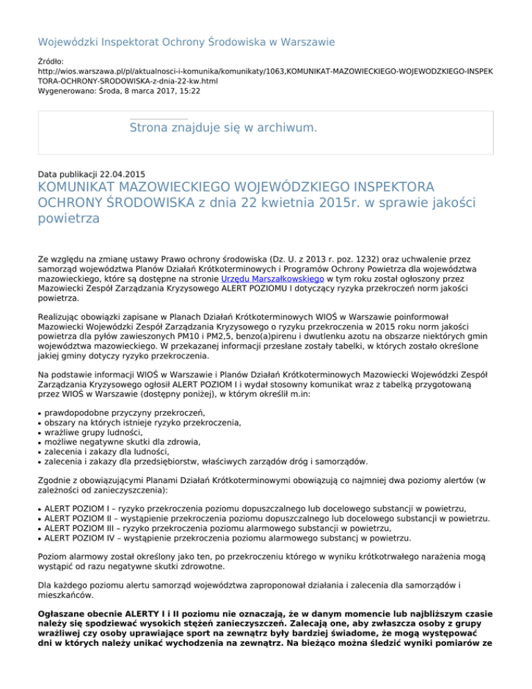 Wojewódzki Inspektorat Ochrony Środowiska w Warszawie Źródło: http://wios.warszawa.pl/pl/aktualnosci-i-komunika/komunikaty/1063,KOMUNIKAT-MAZOWIECKIEGO-WOJEWODZKIEGO-INSPEK TORA-OCHRONY-SRODOWISKA-z-dnia-22-kw.html Wygenerowano: Środa, 8 marca 2017, 15:22 Strona znajduje się w archiwum. Data publikacji 22.04.2015 KOMUNIKAT MAZOWIECKIEGO WOJEWÓDZKIEGO INSPEKTORA OCHRONY ŚRODOWISKA z dnia 22 kwietnia 2015r. w sprawie jakości powietrza Ze względu na zmianę ustawy Prawo ochrony środowiska (Dz. U. z 2013 r. poz. 1232) oraz uchwalenie przez samorząd województwa Planów Działań Krótkoterminowych i Programów Ochrony Powietrza dla województwa mazowieckiego, które są dostępne na stronie Urzędu Marszałkowskiego w tym roku został ogłoszony przez Mazowiecki Zespół Zarządzania Kryzysowego ALERT POZIOMU I dotyczący ryzyka przekroczeń norm jakości powietrza. Realizując obowiązki zapisane w Planach Działań Krótkoterminowych WIOŚ w Warszawie poinformował Mazowiecki Wojewódzki Zespół Zarządzania Kryzysowego o ryzyku przekroczenia w 2015 roku norm jakości powietrza dla pyłów zawieszonych PM10 i PM2,5, benzo(a)pirenu i dwutlenku azotu na obszarze niektórych gmin województwa mazowieckiego. W przekazanej informacji przesłane zostały tabelki, w których zostało określone jakiej gminy dotyczy ryzyko przekroczenia. Na podstawie informacji WIOŚ w Warszawie i Planów Działań Krótkoterminowych Mazowiecki Wojewódzki Zespół Zarządzania Kryzysowego ogłosił ALERT POZIOM I i wydał stosowny komunikat wraz z tabelką przygotowaną przez WIOŚ w Warszawie (dostępny poniżej), w którym określił m.in: ● ● ● ● ● ● prawdopodobne przyczyny przekroczeń, obszary na których istnieje ryzyko przekroczenia, wrażliwe grupy ludności, możliwe negatywne skutki dla zdrowia, zalecenia i zakazy dla ludności, zalecenia i zakazy dla przedsiębiorstw, właściwych zarządów dróg i samorządów. Zgodnie z obowiązującymi Planami Działań Krótkoterminowymi obowiązują co najmniej dwa poziomy alertów (w zależności od zanieczyszczenia): ● ● ● ● ALERT POZIOM I – ryzyko przekroczenia poziomu dopuszczalnego lub docelowego substancji w powietrzu, ALERT POZIOM II – wystąpienie przekroczenia poziomu dopuszczalnego lub docelowego substancji w powietrzu. ALERT POZIOM III – ryzyko przekroczenia poziomu alarmowego substancji w powietrzu, ALERT POZIOM IV – wystąpienie przekroczenia poziomu alarmowego substancj w powietrzu. Poziom alarmowy został określony jako ten, po przekroczeniu którego w wyniku krótkotrwałego narażenia mogą wystąpić od razu negatywne skutki zdrowotne. Dla każdego poziomu alertu samorząd województwa zaproponował działania i zalecenia dla samorządów i mieszkańców. Ogłaszane obecnie ALERTY I i II poziomu nie oznaczają, że w danym momencie lub najbliższym czasie należy się spodziewać wysokich stężeń zanieczyszczeń. Zalecają one, aby zwłaszcza osoby z grupy wrażliwej czy osoby uprawiające sport na zewnątrz były bardziej świadome, że mogą występować dni w których należy unikać wychodzenia na zewnątrz. Na bieżąco można śledzić wyniki pomiarów ze stacji automatycznych na stronie http://sojp.wios.warszawa.pl Planowany jest dalszy rozwój tego serwisu tak, aby pomóc mieszkańcom w lepszy sposób planować przebywanie na świeżym powietrzu. Najwyższe poziomy zanieczyszczeń prognozowane są w okresie zimowym (możliwe także w okresie wczesnej wiosny i późnej jesieni). W 2015 roku spodziewane jest przekroczenie ALERTÓW POZIOM I i II, a nie poziomów III i IV, które mogłyby nieść negatywne skutki w wyniku krótkotrwałego narażenia. Jednocześnie informuję, że na 12 monitorowanych substancji normy przekraczane są tylko dla 4: ● ● ● ● ● ● ● ● ● ● ● ● dwutlenku siarki - SO2, dwutlenku azotu - NO2, tlenku węgla - CO, benzenu - C6H6, pyłu zawieszonego PM10, pyłu zawieszonego PM2,5, ołowiu w pyle - Pb(PM10), arsenu w pyle - As(PM10), kadmu w pyle - Cd(PM10), niklu w pyle - Ni(PM10), benzo(a)pirenu w pyle - B(a)P(PM10), ozonu - O3. Roczna Ocena Jakości Powietrza za 2014 rok zostanie opublikowana do 30 kwietnia 2015 r. (dostępna będzie na stronie - http://wios.warszawa.pl/pl/publikacje-wios/publikacje). Ryzyko przekroczenia norm jakości w powietrzu w roku 2015 (ALERT POZIOM I) Wojewódzki Inspektorat Ochrony Środowiska w Warszawie określił na podstawie dotychczasowych swoich raportów (Rocznych Ocen Jakości Powietrza w województwie mazowieckim dostępnych na stronie WIOŚ w Warszawie http://wios.warszawa.pl/pl/publikacje-wios/publikacje). Od co najmniej 10 lat poziom stężeń, które przekraczają normy utrzymuje się na względnie podobnym poziomie. Występujące wahania w poszczególnych latach mają związek głównie ze zmieniającymi się warunkami meteorologicznymi. Są miejsca, w których widać poprawę w tym zakresie spowodowaną skutecznymi działaniami samorządu lokalnego – np. miasto Żyrardów. W Rocznej Ocenie Jakości Powietrza dla województwa mazowieckiego za 2013 r. znaleźć można następujące wnioski : Wnioski: ● ● ● ● Na większości stanowisk pomiarowych monitorujących poziomy stężeń pyłu PM10 norma dobowa została przekroczona, natomiast na żadnym stanowisku nie została przekroczona norma roczna. Wyniki analiz i oszacowań WIOŚ w Warszawie wskazują, że blisko 26% mieszkańców Mazowsza jest narażonych na zbyt dużą liczbę dni z przekroczeniem normy pyłu PM10, a ok. 8% na zbyt wysokie stężenie średnioroczne. Najniższy zmierzony poziom stężenia średniorocznego benzo(a)pirenu w roku 2013 odnotowano w Ostrołęce, gdzie przekraczało ono normę prawie 2-krotnie. Najwyższy poziom stężenia średniorocznego miał miejsce w Legionowie – stwierdzono ponad 5-krotne przekroczenie normy. Na wszystkich pozostałych stanowiskach pomiarowych norma również została przekroczona kilkakrotnie. Modelow