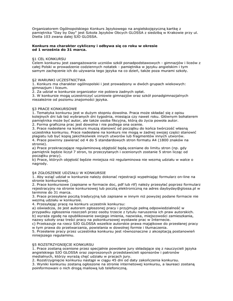Organizatorem Ogólnopolskiego Konkurs Językowego na angielskojęzyczną kartkę z pamiętnika "Day by Day" jest Szkoła Języków Obcych GLOSSA z siedzibą w Krakowie przy ul. Dietla 103 zwana dalej SJO GLOSSA. Konkurs ma charakter cykliczny i odbywa się co roku w okresie od 1 września do 31 marca. §1 CEL KONKURSU Celem konkursu jest zaangaŜowanie uczniów szkół ponadpodstawowych - gimnazjów i liceów z całej Polski w prowadzenie codziennych notatek - pamiętnika w języku angielskim i tym samym zachęcenie ich do uŜywania tego języka na co dzień, takŜe poza murami szkoły. §2 WARUNKI UCZESTNICTWA 1. Konkurs ma charakter ogólnopolski i jest prowadzony w dwóch grupach wiekowych: gimnazjum i liceum. 2. Za udział w konkursie organizator nie pobiera Ŝadnych opłat. 3. W konkursie mogą uczestniczyć uczniowie gimnazjów oraz szkół ponadgimnazjalnych niezaleŜnie od poziomu znajomości języka. §3 PRACE KONKURSOWE 1. Tematyka konkursu jest w duŜym stopniu dowolna. Praca moŜe składać się z opisu kolejnych dni lub teŜ wybranych dni tygodnia, miesiąca czy nawet roku. Głównym bohaterem pamiętnika moŜe być autor, ale takŜe osoba fikcyjna, którą do Ŝycia powoła autor. 2. Forma graficzna prac jest dowolna i nie podlega ona ocenie. 3. Prace nadesłane na konkurs muszą stanowić od początku do końca twórczość własną uczestnika konkursu. Prace nadesłane na konkurs nie mogą w Ŝadnej swojej części stanowić plagiatu lub być kopią jakichkolwiek innych utworów lub fragmentów innych utworów. 4. Prace powinny zawierać od 4 do 5 standardowych stron formatu A4 (1800 znaków na stronie). a) Prace przekraczające regulaminową objętość będą oceniane do limitu stron (np. gdy pamiętnik będzie liczył 7 stron, to przeczytanych i ocenionych zostanie 5 stron licząc od początku pracy). b) Prace, których objętość będzie mniejsza niŜ regulaminowa nie wezmą udziału w walce o nagrody. §4 ZGŁOSZENIE UDZIAŁU W KONKURSIE 1. Aby wziąć udział w konkursie naleŜy dokonać rejestracji wypełniając formularz on-line na stronie konkursowej. 2. Prace konkursowe (zapisane w formacie doc, pdf lub rtf) naleŜy przesyłać poprzez formularz rejestracyjny na stronie konkursowej lub pocztą elektroniczną na adres [email protected] w terminie do 31 marca. 3. Prace przesyłane pocztą tradycyjną lub zapisane w innym niŜ powyŜej podane formacie nie wezmą udziału w konkursie. 4. Przesyłając pracę na konkurs uczestnik konkursu: a) oświadcza, Ŝe jest autorem zgłoszonej pracy i przyjmuje pełną odpowiedzialność w przypadku zgłoszenia roszczeń przez osoby trzecie z tytułu naruszenia ich praw autorskich. b) wyraŜa zgodę na opublikowanie swojego imienia, nazwiska, miejscowości zamieszkania, nazwy szkoły oraz treści pracy na pokonkursowej wystawie prac w Internecie. c) Przekazuje na rzecz SJO GLOSSA wszelkie autorskie prawa majątkowe do przesłanej pracy w tym prawa do przetwarzania, powielania w dowolnej formie i tłumaczenia. 5. Przesłanie pracy przez uczestnika konkursu jest równoznaczne z akceptacją postanowień niniejszego regulaminu. §5 ROZSTRZYGNIĘCIE KONKURSU 1. Prace zostaną ocenione przez specjalnie powołane jury składające się z nauczycieli języka angielskiego SJO GLOSSA oraz zaproszonych przedstawicieli sponsorów i patronów medialnych, którzy wyraŜą chęć udziału w pracach jury. 2. Rozstrzygnięcie konkursu nastąpi w ciągu 45 dni od daty zakończenia konkursu. 3. Wyniki konkursu zostaną ogłoszone na stronie internetowej konkursu, a laureaci zostaną poinformowani o nich drogą mailową lub telefoniczną. §6 NAGRODY I WYRÓśNIENIA W konkursie zostaną przyznane po dwie nagrody główne oraz po 5 wyróŜnień dla uczestników konkursu dla kaŜdej kategorii wiekowej. Dodatkowe 4 nagrody (po dwie dla kaŜdej kategorii wiekowej) zostaną przyznane dla szkół, których uczniowie otrzymali nagrody główne. 1. W kategorii liceum nagrodami są: a) Pierwsza nagroda: dwutygodniowy kurs języka angielskiego w Anglii lub Irlandii, zakwaterowanie w trakcie kursu i przelot z Polski (nagroda nie obejmuje wyŜywienia, ubezpieczenia od kosztów leczenia, transferów, wycieczek i zajęć pozalekcyjnych, kieszonkowego). b) Druga nagroda: dwutygodniowy kurs języka angielskiego w Anglii lub Irlandii (nagroda nie obejmuje kosztów zakwaterowania, przelotu z Polski, wyŜywienia, ubezpieczenia od kosztów leczenia, transferów, wycieczek i zajęć pozalekcyjnych, kieszonkowego). 2. W kategorii gimnazjum nagrodami są: a) Pierwsza nagroda: zestaw ksiąŜek i/lub materiałów audio-video i/lub programów komputerowych do nauki języka angielskiego o wartości 400zł b) Druga nagroda: zestaw ksiąŜek i/lub materiałów audio-video i/lub programów komputerowych do nauki języka angielskiego o wartości 300zł 3. Autorzy wyróŜnionych prac otrzymają nagrody ksiąŜkowe. 4. Szkoły, których uczniowie zostaną nagrodzeni w konkursie otrzymają nagrody ksiąŜkowe o wartości: Pierwsza nagroda 400zł Druga nagroda 300zł 5. Wszyscy uczestnicy konkursu, których prace spełniły wymogi regulaminowe otrzymają: a) dyplomy uczestnictwa b) prawo do zniŜek w wysokości 5% na uczestnictwo w zagranicznych kursach językowych oraz 20% na uczestnictwo w krajowych kursach językowych organizowanych przez SJO GLOSSA. 6. Nauczyciele wszystkich uczestników konkursu oraz ich szkoły otrzymają pamiątkowe dyplomy potwierdzające udział uczniów w konkursie i osiągnięte przez nich wyniki. §7 ODBIÓR NAGRODY 1. Pierwsza i druga nagroda w kategorii liceum moŜe być zrealizowana w terminie uzgodnionym z organizatorem, który moŜe narzucić ograniczenia dotyczące tego terminu. 2. Zdobywca pierwszej i drugiej nagrody w kategorii liceum jest zobowiązany potwierdzić (telefonicznie, e-mailem lub osobiście) chęć skorzystania z nagrody najpóźniej na 8 tygodni przed planowanym wyjazdem na kurs językowy. Jeśli nagrodzony nie dokona takowego p