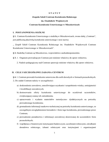 STATUT Zespołu Szkół Centrum Kształcenia Rolniczego im. Osadników Wojskowych Centrum Kształcenia Ustawicznego w Mieszkowicach I. POSTANOWIENIA OGÓLNE § 1. Centrum Kształcenia Ustawicznego z siedzibą w Mieszkowicach, zwane dalej „Centrum”, jest publiczną placówką kształcenia ustawicznego i nosi nazwę: „ Zespół Szkół Centrum Kształcenia Rolniczego im. Osadników Wojskowych Centrum Kształcenia Ustawicznego w Mieszkowicach”. § 2. Siedzibą Centrum są Mieszkowice, województwo zachodniopomorskie. § 3. 1. Organem prowadzącym Centrum jest minister właściwy do spraw rolnictwa. 2. Nadzór pedagogiczny nad Centrum sprawuje minister właściwy dla spraw rolnictwa. II. CELE I SZCZEGÓŁOWE ZADANIA CENTRUM § 4. 1. Centrum prowadzi kształcenie ustawiczne dla osób dorosłych w formach pozaszkolnych. 2. Do zadań Centrum należy w szczególności: a) doskonalenie zawodowe, umożliwiające uzyskanie i uzupełnienie wiedzy, umiejętności i kwalifikacji zawodowych; b) dostosowanie oferty kształcenia ustawicznego do oczekiwań uczestników, zwiększającej szansę ich zatrudnienia; c) opracowanie i wydanie materiałów metodyczno- dydaktycznych na potrzeby prowadzonego kształcenia; d) gromadzenie informacji naukowo-technicznej na potrzeby kształcenia ustawicznego, ze szczególnym uwzględnieniem kierunków i form tego kształcenia, prowadzonego przez Centrum; e) prowadzenie poradnictwa i informacji zawodowej skierowanej do uczestników form pozaszkolnych; f) współpraca z branżowymi instytucjami badawczymi, uczelniami rolniczymi, ośrodkami doradztwa rolniczego, izbami rolniczymi oraz instytucjami i organizacjami 1 działającymi na rzecz rozwoju nowoczesnego rolnictwa oraz indywidualnymi gospodarstwami rolnymi; g) współpraca z urzędami pracy w zakresie szkolenia osób zarejestrowanych w tych urzędach; h) współpraca z pracodawcami w zakresie przygotowania oferty kształcenia w formach pozaszkolnych, zgodnej z oczekiwaniami pracodawców, a także w zakresie organizacji kształcenia ustawicznego pracowników: i) współpraca z innymi podmiotami prowadzącymi kształcenie ustawiczne w kraju i za granicą; j) organizacja zajęć z zakresu praktycznej nauki zawodu, wynikających z części lub całości programu nauczania dla danego zawodu, w tym modułowego programu nauczania dla danego zawodu k) organizacja współpracy oraz wymiany doświadczeń między nauczycielami kształcenia zawodowego ze szkół rolniczych; l) współpraca z placówkami doskonalenia nauczycieli, w zakresie doradztwa i doskonalenia pracy dydaktycznej. III. ORGANY CENTRUM § 5. Organami Centrum są: 1. Dyrektor Centrum; 2. Rada Pedagogiczna; 3. Samorząd Słuchaczy. § 6. 1. Dyrektor Centrum w szczególności: a) kieruje bieżącą działalnością Centrum oraz reprezentuje je na zewnątrz; b) sprawuje nadzór pedagogiczny nad działalnością nauczycieli; c) realizuje uchwały Rady Pedagogicznej, podjęte w ramach jej kompetencji stanowiących i czuwa nad jej zgodnością z przepisami prawa; d) dysponuje środkami określonymi w planie finansowym zaopiniowanym przez Radę Pedagogiczną i ponosi odpowiedzialność za ich prawidłowe wykorzystanie; e) wykonuje inne zadania wynikające z odrębnych przepisów, w tym dokonuje oceny pracy nauczycieli i przewodniczy Radzie Pedagogicznej; 2 f) przestrzega postanowień statutu w sprawie rodzaju nagród i kar stosowanych wobec słuchaczy; g) rozstrzyga sprawy sporne między organami Centrum; h) dba o powierzone mienie. 2. Dyrektor Centrum jest kierownikiem zakładu pracy dla zatrudnionych nauczycieli i pracowników niebędących nauczycielami. 3. Dyrektor Centrum w szczególności decyduje w sprawach: a) zatrudniania i zwalniania nauczycieli oraz pracowników niebędących nauczycielami; b) przyznawania nagród oraz wymierzania kar porządkowych nauczycielom i pracownikom niebędącym nauczycielami; c) występowania z wnioskami, po zasięgnięciu opinii Rady Pedagogicznej, w sprawach odznaczeń, nagród i innych wyróżnień dla nauczycieli i pracowników niebędących nauczycielami. 4. Dyrektor Centrum przedstawia Radzie Pedagogicznej, co najmniej dwa razy w roku szkolnym, ogólne warunki ze sprawowania nadzoru pedagogicznego oraz informacje o działalności Centrum, ze szczególnym uwzględnieniem jakości pracy Centrum. 5. Dyrektor Centrum wstrzymuje wykonanie uchwał niezgodnych z przepisami prawa. O wstrzymaniu wykonania uchwały Dyrektor Centrum niezwłocznie zawiadamia organ prowadzący Centrum oraz organ sprawujący nadzór pedagogiczny. Organ sprawujący nadzór pedagogiczny, w porozumieniu z organem prowadzącym, uchyla uchwałę w razie stwierdzenia jej niezgodności z przepisami prawa. Rozstrzygnięcie organu sprawującego nadzór pedagogiczny jest ostateczne. 6. Dyrektor Centrum w wykonaniu swoich zadań współpracuje z organami Centrum. § 7. 1. Do kompetencji stanowiących Rady Pedagogicznej należy: a) zatwierdzanie planów pracy Centrum; b) ustalenie organizacji doskonalenia zawodowego nauczycieli Centrum. 2. Rada Pedagogiczna opiniuje w szczególności: a) organizację pracy Centrum, w tym rozkład zajęć edukacyjnych; b) projekt planu finansowego Centrum; c) wniosek Dyrektora Centrum o przyznanie nauczycielom odznaczeń, nagród i innych wyróżnień; 3 d) propozycje Dyrektora Centrum w sprawach przydziału nauczycielom stałych prac i zajęć w ramach wynagrodzenia zasadniczego oraz dodatkowo płatnych zajęć dydaktycznych. 3. Rada Pedagogiczna przygotowuje projekt statutu Centrum albo jego zmian. §8 1. W Centrum działa Samorząd Słuchaczy. 2. Samorząd Słuchaczy może przedstawić Radzie Pedagogicznej oraz Dyrektorowi Centrum wnioski i opinie we wszystkich sprawach Centrum, w szczególności dotyczących realizacji podstawowych praw słuchaczy, takich jak prawo do: a) zapoznanie się z programem nauczania; b) jawnej i umotywowanej oceny postępów w nauce; c) organizowania działalności kulturalnej, oświatowej, sporto