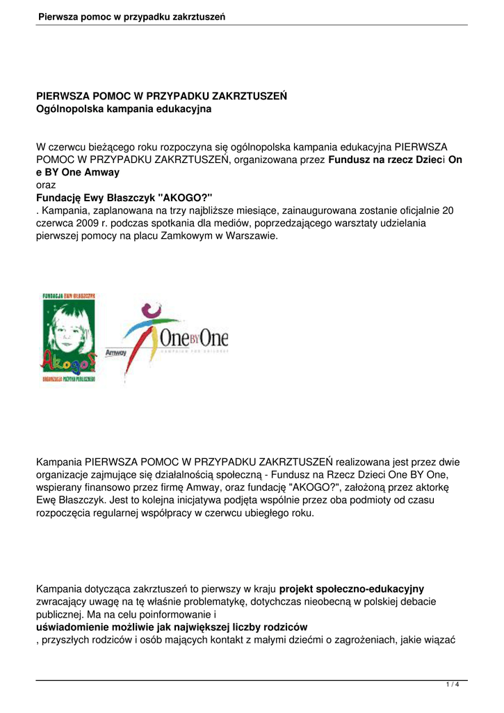 Pierwsza pomoc w przypadku zakrztuszeń PIERWSZA POMOC W PRZYPADKU ZAKRZTUSZEŃ Ogólnopolska kampania edukacyjna W czerwcu bieżącego roku rozpoczyna się ogólnopolska kampania edukacyjna PIERWSZA POMOC W PRZYPADKU ZAKRZTUSZEŃ, organizowana przez Fundusz na rzecz Dzieci On e BY One Amway oraz Fundację Ewy Błaszczyk "AKOGO?" . Kampania, zaplanowana na trzy najbliższe miesiące, zainaugurowana zostanie oficjalnie 20 czerwca 2009 r. podczas spotkania dla mediów, poprzedzającego warsztaty udzielania pierwszej pomocy na placu Zamkowym w Warszawie. Kampania PIERWSZA POMOC W PRZYPADKU ZAKRZTUSZEŃ realizowana jest przez dwie organizacje zajmujące się działalnością społeczną - Fundusz na Rzecz Dzieci One BY One, wspierany finansowo przez firmę Amway, oraz fundację "AKOGO?", założoną przez aktorkę Ewę Błaszczyk. Jest to kolejna inicjatywa podjęta wspólnie przez oba podmioty od czasu rozpoczęcia regularnej współpracy w czerwcu ubiegłego roku. Kampania dotycząca zakrztuszeń to pierwszy w kraju projekt społeczno-edukacyjny zwracający uwagę na tę właśnie problematykę, dotychczas nieobecną w polskiej debacie publicznej. Ma na celu poinformowanie i uświadomienie możliwie jak największej liczby rodziców , przyszłych rodziców i osób mających kontakt z małymi dziećmi o zagrożeniach, jakie wiązać 1/4 Pierwsza pomoc w przypadku zakrztuszeń się mogą z zakrztuszeniami. Pozornie błahe zachłyśnięcie się dziecka płynem czy kawałkiem pokarmu, poprzez zatrzymanie dopływu krwi do mózgu może spowodować poważne zagrożenie dla zdrowia, a nawet życia. Zakrztuszenia mogą prowadzić do groźnych uszkodzeń mózgu, kończących się śpiączką, dlatego też organizatorzy kampanii chcieliby w szczególności zwrócić uwagę na niedocenianą profilaktykę zakrztuszeń oraz szeroko edukować w zakresie postępowania w przypadku zakrztuszeń. Informacja i edukacja Kampania koncentrować się będzie na informacji i edukacji. Materiały informacyjne, dotyczące profilaktyki zakrztuszeń oraz pierwszej pomocy, upowszechniane będą szeroko wśród mediów informacyjnych, zajmujących się problematyką zdrowotną oraz skierowanych do rodziców małych dzieci. Na potrzeby kampanii stworzono plakat z przejrzystą, obrazkową instrukcją udzielania pierwszej pomocy w przypadku zakrztuszenia u dziecka powyżej pierwszego roku życia. Plakat, jak i wszelkie materiały edukacyjne, powstał w konsultacji z partnerem merytorycznym kampanii - P olską Radą Resuscytacji - organizacją skupiającą lekarzy i ratowników medycznych, zajmującą się na co dzień edukacją w zakresie podstawowych i zaawansowanych zabiegów ratujących życie. Z ramienia Rady ekspertem kampanii została Elżbieta Byrska-Maciejasz - lekarz pracujący jako anestezjolog dziecięcy, kierownik grupy roboczej do spraw zabiegów resuscytacyjnych w pediatrii. Plakat z instrukcją pierwszej pomocy wydrukowano w dwóch rozmiarach - A3 i A2. Pierwszy dołączony został jako insert do foliowanego nakładu lipcowego numeru magazynu dla rodziców "Mamo, to ja" (w sprzedaży od 9 czerwca). W ramach wsparcia, jakiego udziela kampanii wydawca pisma - Edipresse Polska, na łamach "Mamo, to ja" przez kolejne trzy miesiące ukazywać się będą materiały na temat zakrztuszeń oraz porady eksperckie. 2/4 Pierwsza pomoc w przypadku zakrztuszeń Ten sam plakat w formacie A2 dystrybuowany będzie na terenie szpitali, ośrodków zdrowia, przedszkoli i żłobków w całym kraju przez wolontariuszy z Funduszu na Rzecz Dzieci One BY One Amway. Dwa cykle warsztatowe Mieszkańcy Warszawy i Krakowa, zainteresowani problematyką pierwszej pomocy w przypadku zakrztuszeń u dzieci, będą mogli dodatkowo wziąć udział w warsztatach prowadzonych bezpłatnie przez zawodowych ratowników medycznych. Warsztaty w stolicy odbędą się na placu Zamkowym już w sobotę 20 czerwca, w ramach oficjalnej inauguracji kampanii. Zostaną powtórzone w Krakowie na Małym Rynku 30 sierpnia. Oba cykle warsztatowe są otwarte dla wszystkich chętnych. Trwać będą od południa do godziny 18.00. Podczas spotkań z ratownikami, niezależnie od czynnego uczestnictwa w warsztatach, będzie można otrzymać bezpłatne materiały na temat pierwszej pomocy oraz zasięgnąć fachowej porady lekarza. Na dzieci przybyłe na warsztaty z rodzicami czekać będą liczne atrakcje. Dla najmłodszych organizatorzy przygotowali konkursy z nagrodami, grę w Mega Twister, wspólne malowanie i puszczanie wielkich baniek mydlanych - wszystko pod okiem wykwalifikowanych animatorów i opiekunów. Na zakończenie dnia zaplanowano część rozrywkową - minirecital Ewy Błaszczyk - założycielki fundacji "AKOGO?". Artystka wystąpi wraz z córką Marianną Janczarską. Wykona utwory ze swojej ostatniej płyty "Nawet gdy wichura". Przez cały dzień na placu Zamkowym zbierane będą pieniądze na prowadzoną przez Fundację budowę kliniki "Budzik" w Międzylesiu. Kwestę poprowadzą wolontariusze z Funduszu na Rzecz Dzieci One BY One Amway. Patronat honorowy nad warsztatami inaugurującymi kampanię (20 czerwca 2009 r. w Warszawie) objęli: Minister Zdrowia Ewa Kopacz, Minister Edukacji Narodowej Katarzyna Hall, Prezydent Warszawy Hanna Gronkiewicz-Waltz, Marszałek Województwa Mazowieckiego Adam Struzik, Wojewoda Mazowiecki Dariusz Piątek, Rzecznik Praw Dziecka Marek Michalak, Przewodniczący Sejmowej Komisji Zdrowia Poseł na Sejm RP Bolesław Piecha. 3/4 Pierwsza pomoc w przypadku zakrztuszeń Patronat merytoryczny nad kampanią objęła Polska Rada Resuscytacji. Patronem medialnym wspierającym kampanię jest Edipresse Polska - wydawca miesięcznika dla rodziców małych dzieci "Mamo, to ja". 4/4