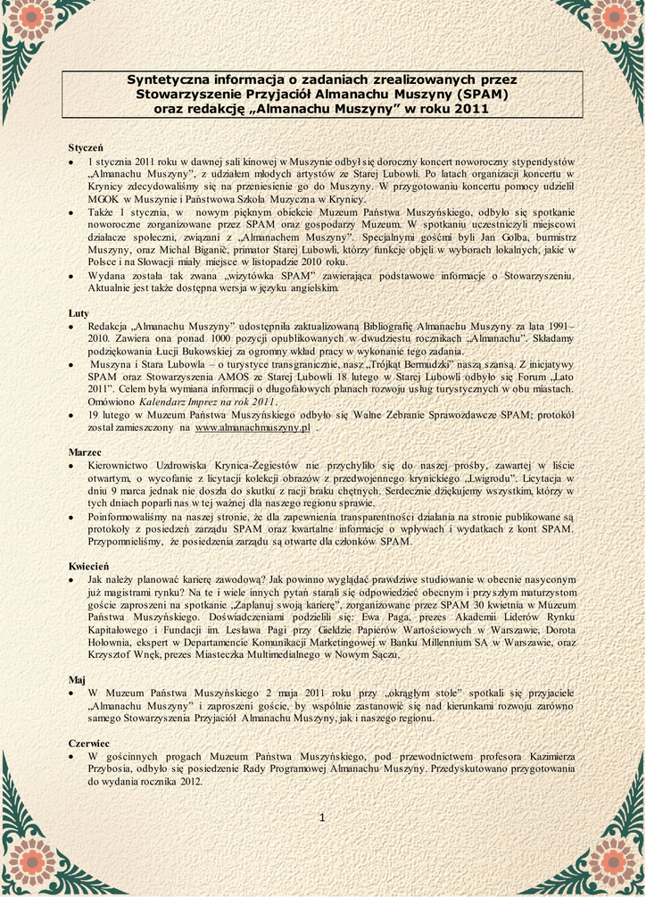 Syntetyczna informacja o zadaniach zrealizowanych przez Stowarzyszenie Przyjaciół Almanachu Muszyny (SPAM) oraz redakcję „Almanachu Muszyny” w roku 2011 Styczeń 1 stycznia 2011 roku w dawnej sali kinowej w Muszynie odbył się doroczny koncert noworoczny stypendystów „Almanachu Muszyny”, z udziałem młodych artystów ze Starej Lubowli. Po latach organizacji koncertu w Krynicy zdecydowaliśmy się na przeniesienie go do Muszyny. W przygotowaniu koncertu pomocy udzielił MGOK w Muszynie i Państwowa Szkoła Muzyczna w Krynicy. Także 1 stycznia, w nowym pięknym obiekcie Muzeum Państwa Muszyńskiego, odbyło się spotkanie noworoczne zorganizowane przez SPAM oraz gospodarzy Muzeum. W spotkaniu uczestniczyli miejscowi działacze społeczni, związani z „Almanachem Muszyny”. Specjalnymi gośćmi byli Jan Golba, burmistrz Muszyny, oraz Michal Biganič, primator Starej Lubowli, którzy funkcje objęli w wyborach lokalnych, jakie w Polsce i na Słowacji miały miejsce w listopadzie 2010 roku. Wydana została tak zwana „wizytówka SPAM” zawierająca podstawowe informacje o Stowarzyszeniu. Aktualnie jest także dostępna wersja w języku angielskim. Luty Redakcja „Almanachu Muszyny” udostępniła zaktualizowaną Bibliografię Almanachu Muszyny za lata 1991– 2010. Zawiera ona ponad 1000 pozycji opublikowanych w dwudziestu rocznikach „Almanachu”. Składamy podziękowania Łucji Bukowskiej za ogromny wkład pracy w wykonanie tego zadania. Muszyna i Stara Lubowla – o turystyce transgranicznie, nasz „Trójkąt Bermudzki” naszą szansą. Z inicjatywy SPAM oraz Stowarzyszenia AMOS ze Starej Lubowli 18 lutego w Starej Lubowli odbyło się Forum „Lato 2011”. Celem była wymiana informacji o długofalowych planach rozwoju usług turystycznych w obu miastach. Omówiono Kalendarz Imprez na rok 2011. 19 lutego w Muzeum Państwa Muszyńskiego odbyło się Walne Zebranie Sprawozdawcze SPAM; protokół został zamieszczony na www.almanachmuszyny.pl . Marzec Kierownictwo Uzdrowiska Krynica-Żegiestów nie przychyliło się do naszej prośby, zawartej w liście otwartym, o wycofanie z licytacji kolekcji obrazów z przedwojennego krynickiego „Lwigrodu”. Licytacja w dniu 9 marca jednak nie doszła do skutku z racji braku chętnych. Serdecznie dziękujemy wszystkim, którzy w tych dniach poparli nas w tej ważnej dla naszego regionu sprawie. Poinformowaliśmy na naszej stronie, że dla zapewnienia transparentności działania na stronie publikowane są protokoły z posiedzeń zarządu SPAM oraz kwartalne informacje o wpływach i wydatkach z kont SPAM. Przypomnieliśmy, że posiedzenia zarządu są otwarte dla członków SPAM. Kwiecień Jak należy planować karierę zawodową? Jak powinno wyglądać prawdziwe studiowanie w obecnie nasyconym już magistrami rynku? Na te i wiele innych pytań starali się odpowiedzieć obecnym i przy szłym maturzystom goście zaproszeni na spotkanie „Zaplanuj swoją karierę”, zorganizowane przez SPAM 30 kwietnia w Muzeum Państwa Muszyńskiego. Doświadczeniami podzielili się: Ewa Paga, prezes Akademii Liderów Rynku Kapitałowego i Fundacji im. Lesława Pagi przy Giełdzie Papierów Wartościowych w Warszawie, Dorota Hołownia, ekspert w Departamencie Komunikacji Marketingowej w Banku Millennium SA w Warszawie, oraz Krzysztof Wnęk, prezes Miasteczka Multimedialnego w Nowym Sączu. Maj W Muzeum Państwa Muszyńskiego 2 maja 2011 roku przy „okrągłym stole” spotkali się przyjaciele „Almanachu Muszyny” i zaproszeni goście, by wspólnie zastanowić się nad kierunkami rozwoju zarówno samego Stowarzyszenia Przyjaciół Almanachu Muszyny, jak i naszego regionu. Czerwiec W gościnnych progach Muzeum Państwa Muszyńskiego, pod przewodnictwem profesora Kazimierza Przybosia, odbyło się posiedzenie Rady Programowej Almanachu Muszyny. Przedyskutowano przygotowania do wydania rocznika 2012. 1 W dniu 29 czerwca w Dworku Białoprądnickim w Krakowie otwarta została pokonkursowa wystawa fotograficzna „Detal architektoniczny obiektów gospodarczych z terenu historycznego państwa muszyńskiego”, organizowanego przez SPAM oraz Krynickie Towarzystwo Fotograficzne. Dotychczasowe dziesięć edycji konkursu przyniosło ogromny dorobek w postaci dokumentacji zagrożonych zniszczeniem wielu setek detali architektonicznych z terenu historycznego państwa muszyńskiego, a także ze słowackich miast – Starej Lubowli i Bardiowa, czyli terenów północnego Spiszu i Szary sza. Na wystawie zaprezentowane zostały prace nagrodzone w roku 2010, w którym laureatami byli: Teresa Basałyga, Alicja Przybyszowska i Roman Ślusarz. W trakcie wernisażu podkreślono historyczną więź między Dworkiem Białoprądnickim w Krakowie a Ziemią Muszyńską. Wystawę zorganizowała Anna Matuzik, członek komisji wystawienniczej SPAM. W dniu 8 czerwca 2011 r. w Willi Wanda w Muszynie obradowało jury dorocznego konkursu „Detal architektoniczny”, organizowanego przez „Almanach Muszyny” i Krynickie Towarzystwo Fotograficzne. Tematem konkursu były zagrożone zniszczeniem detale obiektów kolejowych na terenie historycznego państwa muszyńskiego. Pod koniec czerwca 2011 r. wydany został 21. rocznik „Almanachu Muszyny”, zawierający na 392 stronach ponad 60 tekstów autorstwa kilkudziesięciu osób z Muszyny i wielu miast w Polsce i Słowacji. Jak zwykle artykuły dotyczą przede wszystkim historii Ziemi Muszyńskiej, a także sąsiadującego z nią północnego Spiszu. Rocznik otwiera artykuł Barbary Chudzińskiej pt. Badania archeologiczne na muszyńskim zamku. Sezon 2010. Po raz pierwszy „Almanach Muszyny” 2011 ukazał się w dwóch formach – tradycyjnej papierowej oraz na CD. „Almanach” w formie tradycyjnej otrzymali wszyscy autorzy oraz donatorzy FSAM. Redaktor naczelna „Almanachu Muszyny” Bożena Mściwujewska-Kruk została laureatką nagrody „Społecznik roku 2010”, przeznaczonej dla działacza społecznego z powiat