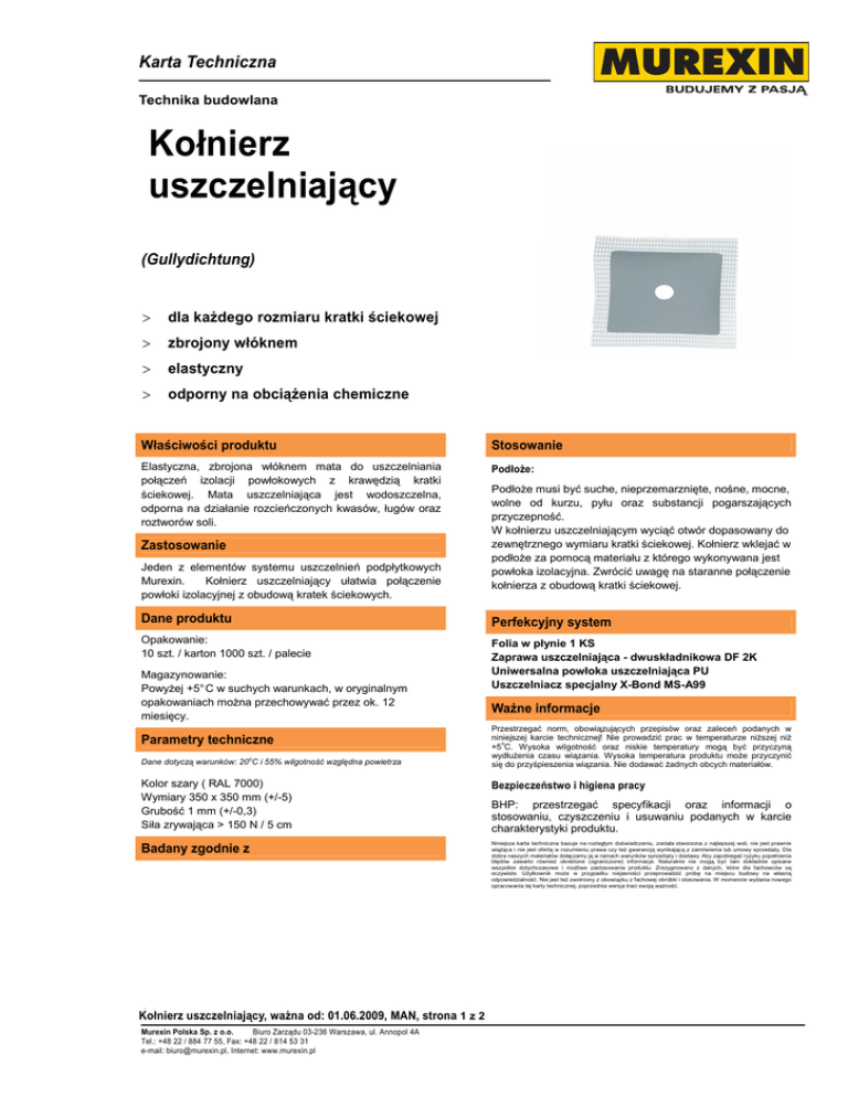 Karta Techniczna Technika budowlana BAT_KOLNIERZ_USZCZELNIAJACY Kołnierz uszczelniający (Gullydichtung) > dla kaŜdego rozmiaru kratki ściekowej > zbrojony włóknem > elastyczny > odporny na obciąŜenia chemiczne Właściwości produktu Stosowanie Elastyczna, zbrojona włóknem mata do uszczelniania połączeń izolacji powłokowych z krawędzią kratki ściekowej. Mata uszczelniająca jest wodoszczelna, odporna na działanie rozcieńczonych kwasów, ługów oraz roztworów soli. PodłoŜe: Zastosowanie Jeden z elementów systemu uszczelnień podpłytkowych Murexin. Kołnierz uszczelniający ułatwia połączenie powłoki izolacyjnej z obudową kratek ściekowych. PodłoŜe musi być suche, nieprzemarznięte, nośne, mocne, wolne od kurzu, pyłu oraz substancji pogarszających przyczepność. W kołnierzu uszczelniającym wyciąć otwór dopasowany do zewnętrznego wymiaru kratki ściekowej. Kołnierz wklejać w podłoŜe za pomocą materiału z którego wykonywana jest powłoka izolacyjna. Zwrócić uwagę na staranne połączenie kołnierza z obudową kratki ściekowej. Dane produktu Perfekcyjny system Opakowanie: 10 szt. / karton 1000 szt. / palecie Folia w płynie 1 KS Zaprawa uszczelniająca - dwuskładnikowa DF 2K Uniwersalna powłoka uszczelniająca PU Uszczelniacz specjalny X-Bond MS-A99 Magazynowanie: PowyŜej +5° C w suchych warunkach, w oryginalnym opakowaniach moŜna przechowywać przez ok. 12 miesięcy. Parametry techniczne Dane dotyczą warunków: 20oC i 55% wilgotność względna powietrza WaŜne informacje Przestrzegać norm, obowiązujących przepisów oraz zaleceń podanych w niniejszej karcie technicznej! Nie prowadzić prac w temperaturze niŜszej niŜ +5oC. Wysoka wilgotność oraz niskie temperatury mogą być przyczyną wydłuŜenia czasu wiązania. Wysoka temperatura produktu moŜe przyczynić się do przyśpieszenia wiązania. Nie dodawać Ŝadnych obcych materiałów. Kolor szary ( RAL 7000) Wymiary 350 x 350 mm (+/-5) Grubość 1 mm (+/-0,3) Siła zrywająca > 150 N / 5 cm Bezpieczeństwo i higiena pracy Badany zgodnie z Niniejsza karta techniczna bazuje na rozległym doświadczeniu, została stworzona z najlepszej woli, nie jest prawnie wiąŜąca i nie jest ofertą w rozumieniu prawa czy teŜ gwarancją wynikającą z zamówienia lub umowy sprzedaŜy. Dla dobra naszych materiałów dołączamy ją w ramach warunków sprzedaŜy i dostawy. Aby zapobiegać ryzyku popełnienia błędów zawarto równieŜ określone (ograniczone) informacje. Naturalnie nie mogą być tam dokładnie opisane wszystkie dotychczasowe i moŜliwe zastosowania produktu. Zrezygnowano z danych, które dla fachowców są oczywiste. UŜytkownik moŜe w przypadku niejasności przeprowadzić próbę na miejscu budowy na własną odpowiedzialność. Nie jest teŜ zwolniony z obowiązku z fachowej obróbki i stosowania. W momencie wydania nowego opracowania tej karty technicznej, poprzednia wersja traci swoją waŜność. 01 Kołnierz uszczelniający, waŜna od: 01.06.2009, MAN, strona 11z 2 Murexin Polska Sp. z o.o. Biuro Zarządu 03-236 Warszawa, ul. Annopol 4A Tel.: +48 22 / 884 77 55, Fax: +48 22 / 814 53 31 e-mail: [email protected], Internet: www.murexin.pl BHP: przestrzegać specyfikacji oraz informacji o stosowaniu, czyszczeniu i usuwaniu podanych w karcie charakterystyki produktu.