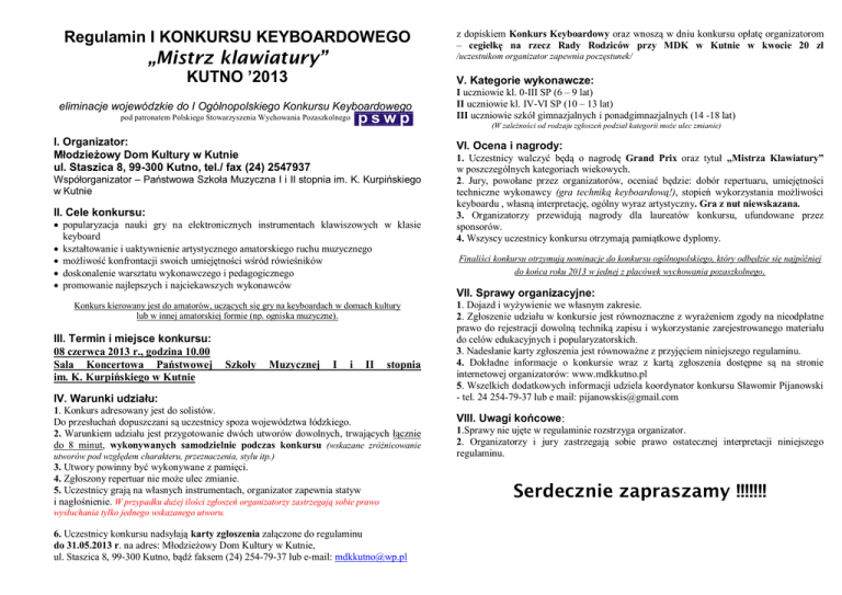 Regulamin I KONKURSU KEYBOARDOWEGO „Mistrz klawiatury” z dopiskiem Konkurs Keyboardowy oraz wnoszą w dniu konkursu opłatę organizatorom – cegiełkę na rzecz Rady Rodziców przy MDK w Kutnie w kwocie 20 zł /uczestnikom organizator zapewnia poczęstunek/ KUTNO ’2013 V. Kategorie wykonawcze: eliminacje wojewódzkie do I Ogólnopolskiego Konkursu Keyboardowego pod patronatem Polskiego Stowarzyszenia Wychowania Pozaszkolnego I uczniowie kl. 0-III SP (6 – 9 lat) II uczniowie kl. IV-VI SP (10 – 13 lat) III uczniowie szkół gimnazjalnych i ponadgimnazjalnych (14 -18 lat) (W zależności od rodzaju zgłoszeń podział kategorii może ulec zmianie) I. Organizator: Młodzieżowy Dom Kultury w Kutnie ul. Staszica 8, 99-300 Kutno, tel./ fax (24) 2547937 VI. Ocena i nagrody: Współorganizator – Państwowa Szkoła Muzyczna I i II stopnia im. K. Kurpińskiego w Kutnie II. Cele konkursu: popularyzacja nauki gry na elektronicznych instrumentach klawiszowych w klasie keyboard kształtowanie i uaktywnienie artystycznego amatorskiego ruchu muzycznego możliwość konfrontacji swoich umiejętności wśród rówieśników doskonalenie warsztatu wykonawczego i pedagogicznego promowanie najlepszych i najciekawszych wykonawców Konkurs kierowany jest do amatorów, uczących się gry na keyboardach w domach kultury lub w innej amatorskiej formie (np. ogniska muzyczne). III. Termin i miejsce konkursu: 08 czerwca 2013 r., godzina 10.00 Sala Koncertowa Państwowej im. K. Kurpińskiego w Kutnie Szkoły Muzycznej I i II stopnia IV. Warunki udziału: 1. Konkurs adresowany jest do solistów. Do przesłuchań dopuszczani są uczestnicy spoza województwa łódzkiego. 2. Warunkiem udziału jest przygotowanie dwóch utworów dowolnych, trwających łącznie do 8 minut, wykonywanych samodzielnie podczas konkursu (wskazane zróżnicowanie utworów pod względem charakteru, przeznaczenia, stylu itp.) 3. Utwory powinny być wykonywane z pamięci. 4. Zgłoszony repertuar nie może ulec zmianie. 5. Uczestnicy grają na własnych instrumentach, organizator zapewnia statyw i nagłośnienie. W przypadku dużej ilości zgłoszeń organizatorzy zastrzegają sobie prawo wysłuchania tylko jednego wskazanego utworu. 6. Uczestnicy konkursu nadsyłają karty zgłoszenia załączone do regulaminu do 31.05.2013 r. na adres: Młodzieżowy Dom Kultury w Kutnie, ul. Staszica 8, 99-300 Kutno, bądź faksem (24) 254-79-37 lub e-mail: [email protected] 1. Uczestnicy walczyć będą o nagrodę Grand Prix oraz tytuł „Mistrza Klawiatury” w poszczególnych kategoriach wiekowych. 2. Jury, powołane przez organizatorów, oceniać będzie: dobór repertuaru, umiejętności techniczne wykonawcy (gra techniką keyboardową!), stopień wykorzystania możliwości keyboardu , własną interpretację, ogólny wyraz artystyczny. Gra z nut niewskazana. 3. Organizatorzy przewidują nagrody dla laureatów konkursu, ufundowane przez sponsorów. 4. Wszyscy uczestnicy konkursu otrzymają pamiątkowe dyplomy. Finaliści konkursu otrzymują nominacje do konkursu ogólnopolskiego, który odbędzie się najpóźniej do końca roku 2013 w jednej z placówek wychowania pozaszkolnego. VII. Sprawy organizacyjne: 1. Dojazd i wyżywienie we własnym zakresie. 2. Zgłoszenie udziału w konkursie jest równoznaczne z wyrażeniem zgody na nieodpłatne prawo do rejestracji dowolną techniką zapisu i wykorzystanie zarejestrowanego materiału do celów edukacyjnych i popularyzatorskich. 3. Nadesłanie karty zgłoszenia jest równoważne z przyjęciem niniejszego regulaminu. 4. Dokładne informacje o konkursie wraz z kartą zgłoszenia dostępne są na stronie internetowej organizatorów: www.mdkkutno.pl 5. Wszelkich dodatkowych informacji udziela koordynator konkursu Sławomir Pijanowski - tel. 24 254-79-37 lub e mail: [email protected] VIII. Uwagi końcowe: 1.Sprawy nie ujęte w regulaminie rozstrzyga organizator. 2. Organizatorzy i jury zastrzegają sobie prawo ostatecznej interpretacji niniejszego regulaminu. Serdecznie zapraszamy !!!!!!! KARTA ZGŁOSZENIA (prosimy wypełnić czytelnie drukowanymi literami) I KONKURS KEYBOARDOWY „Mistrz klawiatury” KUTNO ’2013 1. IMIĘ I NAZWISKO SOLISTY ……………………………......................................................................................................................... 2. KATEGORIA – I.kl.0-III SP (do 9 lat), II kl.IV-VI SP (10-13 lat), III uczniowie szkół gimnazjalnych i ponadgimnazjalnych (14-18 lat) I KONKURS KEYBOARDOWY „Mistrz klawiatury” KUTNO ’2013 Klasa, typ szkoły, wiek:……………………………………......................................................................... Kategoria wykonawcza: .......................................................................................................................... 3. ADRES KONTAKTOWY (kod, miejscowość, ulica, telefon) ................................................................................................................................................................. 4. TYTUŁ UTWORU / KOMPOZYTOR (podać czas trwania każdej prezentacji – łącznie nie dłużej niż 8 minut) 1/ ......................................................................................................................................................... 2/ ........................................................................................................................................................ (każdy z wykonawców gra na swoim instrumencie, statyw X gwarantuje organizator) 5. INSTYTUCJA DELEGUJĄCA (pełna nazwa i adres) ................................................................................................................................................................. 6. INSTRUKTOR /OPIEKUN (imię i nazwisko; tel. kontaktowy) ………………………………………………………..………………………………………………..………….. 7. UWAGI (odnośnie 