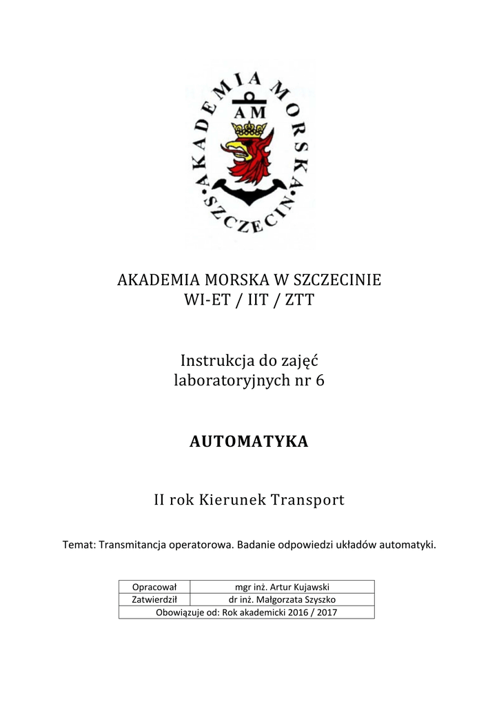 AKADEMIA MORSKA W SZCZECINIE WI-ET / IIT / ZTT Instrukcja do zajęć laboratoryjnych nr 6 AUTOMATYKA II rok Kierunek Transport Temat: Transmitancja operatorowa. Badanie odpowiedzi układów automatyki. Opracował mgr inż. Artur Kujawski Zatwierdził dr inż. Małgorzata Szyszko Obowiązuje od: Rok akademicki 2016 / 2017 RAMOWY SPIS TREŚCI CEL I ZAKRES ĆWICZENIA .................................................................................... 3 CZĘŚĆ TEORETYCZNA ......................................................................................... 3 PRZEBIEG ĆWICZENIA......................................................................................... 4 WARUNKI ZALICZENIA ........................................................................................ 6 EFEKTY KSZTAŁCENIA ......................................................................................... 6 LITERATURA ....................................................................................................... 6 2 CEL I ZAKRES ĆWICZENIA Celem ćwiczenia jest zapoznanie się z pojęciem transmitancji operatorowej zwanej funkcją przejścia oraz z podstawowymi pojęciami dotyczącymi układów sterowania w środowisku Matlab i Simulink. CZĘŚĆ TEORETYCZNA Transmitancja operatorowa G(s) (funkcja przejścia) jest definiowana jako stosunek transformaty Laplace’a sygnału wyjściowego (funkcji odpowiedzi) do transformaty Laplace’a sygnału wejściowego (funkcji wymuszającej), przy zerowych warunkach początkowych. U(s) Y(s) G(s) Właściwości transmitancji operatorowej są następujące: • jest właściwością samego układu, niezależną od wielkości i rodzaju sygnału wejściowego; • transmitancje dla wielu fizycznie różnych układów mogą być identyczne; • transmitancja zawiera niezbędne składniki do przedstawienia związku pomiędzy sygnałami wyjściowymi i wejściowymi nie dostarczając żadnej informacji dotyczącej fizycznej struktury układu; • jeżeli znamy transmitancję układu to możemy określić sygnał wyjściowy (odpowiedź) dla różnych sygnałów wejściowych; • transmitancja operatorowa opisuje układ tak samo dokładnie jak równanie różniczkowe, • równanie charakterystyki statycznej można otrzymać z transmitancji operatorowej przez podstawienie w miejsce s=0; • mianownik transmitancji operatorowej przyrównany do zera jest równaniem charakterystycznym układu automatyki. Dwa podstawowe sygnały wymuszające to: sygnał impulsowy sygnał skokowy - 1 3 PRZEBIEG ĆWICZENIA I. Obliczanie odpowiedzi układów automatyki na zadany sygnał wymuszający 1. Znajdź odpowiedź impulsową układu o danej transmitancji: 2 +3 2. Znajdź odpowiedź impulsową układu o danej transmitancji: −2 +3 +2 3. Znajdź odpowiedź skokową układu o danej transmitancji: 3 +6 +4 +3 4. Znajdź odpowiedź skokową układu o danej transmitancji: 2 −3 +4 II. Wyznacz wykresy odpowiedzi impulsowych i skokowych w Matlabie na podstawie przykładów2 i 3 z zadania I W programie Matlab konieczne jest zdefiniowanie transmitancji operatorowej, która jak wiemy nazywana jest również funkcją przejścia. Odpowiada za to wbudowana funkcja o nazwie: transfer function – tf(). Parametrami tej funkcji są wektory liczb odpowiadające kolejnym współczynnikom stojącym przy zmiennej zespolonej s. Funkcja przejścia jest ułamkiem dwóch wielomianów i dla tego konieczne jest zdefiniowanie dwóch wektorów (licznik – numerator, mianownik – denominator). Przykład: Transmitancja dana wzorem −3 + 2 4 +2 +3 będzie miała swoją reprezentację w Matlabie jako funkcja przejścia: −32 , 423 Aby wykreślić odpowiedzi skokową oraz impulsową należy użyć odpowiednio funkcji step() lub Impulse(). Wynikiem powinien być wykres. 4 Proszę zrobić wykresy (step, impulse) odpowiednio dla przykładów 2 i 3 z zadania I. Wyniki proszę umieścić w sprawozdaniu. III. Zbuduj 2 układy w Simulinku na podstawie przykładów 2 i 3 z zadania I Po wykonaniu poprzedniego zadania należy przejść do Simulinka wpisując po prostu w wiersz poleceń komendę simulink. Po lewej stronie znajduje się drzewo dostępnych bloków pogrupowanych względem kategorii. Nas będą interesowały 3 kategorie: • Sources • Continuous • Sinks W grupie Sources potrzebne nam będą bloki Step oraz Pulse. W grupie Continuous potrzebny będzie blok Transfer Fcn Z grupy Sinks będziemy korzystać z bloku Scope Budujemy 2 układy na obraz i podobieństwo poniższego rysunku: Dwa układy będą reprezentowały odpowiedzi impulsowe a dwa będą reprezentowały odpowiedzi skokowe dla przykładów 2 i 3 z zadania pierwszego. Parametry każdego bloku edytuje się poprzez dwukrotne kliknięcie myszą. IV. Sprawozdanie W sprawozdaniu powinny znaleźć się: • • • • 2 wykresy z zadania II i zrzut ekranowy z wiersza poleceń dla każdej poprawnie zdefiniowanej funkcji przejścia; 2 układy z zadania III ; 2 wykresy sygnałów wymuszających impulsowego oraz skokowego z zadania III; 2 wykresy odpowiedzi impulsowej i skokowej z zadania III,; 5 WARUNKI ZALICZENIA Warunkiem zaliczenia ćwiczenia jest poprawne wykonanie zadań oraz wysłanie pliku sprawozdania o nazwie: Nazwisko_Imie_06 na adres http://microbot.com.pl/am/t2/ wybierając katalog dla odpowiedniej grupy laboratoryjnej. EFEKTY KSZTAŁCENIA Posiada wiedzę w zakresie analizy sygnałów w układach automatycznej regulacji na podstawie wyznaczania odpowiedzi impulsowej oraz skokowej w elementach o danej transmitancji. Posiada wiedzę z zakresu obsługi komputerów osobistych z dostępem do internetu oraz obsługi systemu operacyjnego Windows z pakietem do obliczeń inżynierskich Matlab oraz Simulink. (SEKP10, SEKP11). LITERATURA 1. http://www.ont.com.pl/ 2. http://www.mathworks.com/products/matlab/ 3. http://www.mathworks.com/videos/getting-started-with-matlab68985.html?s_cid=learn_vid 6