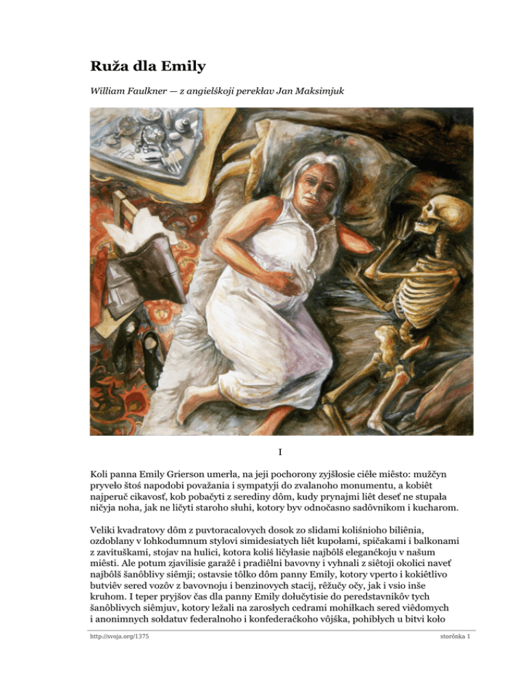 Ruža dla Emily William Faulkner — z angielśkoji perekłav Jan Maksimjuk I Koli panna Emily Grierson umerła, na jeji pochorony zyjšłosie ciêłe miêsto: mužčyn pryveło štoś napodobi považania i sympatyji do zvalanoho monumentu, a kobiêt najperuč cikavosť, kob pobačyti z serediny dôm, kudy prynajmi liêt deseť ne stupała ničyja noha, jak ne ličyti staroho słuhi, kotory byv odnočasno sadôvnikom i kucharom. Veliki kvadratovy dôm z puvtoracalovych dosok zo slidami koliśnioho biliênia, ozdoblany v lohkodumnum stylovi simidesiatych liêt kupołami, spičakami i balkonami z zavituškami, stojav na hulici, kotora koliś ličyłasie najbôlš eleganćkoju v našum miêsti. Ale potum zjavilisie garažê i pradiêlni bavovny i vyhnali z siêtoji okolici naveť najbôlš šanôblivy siêmji; ostavsie tôlko dôm panny Emily, kotory vperto i kokiêtlivo butviêv sered vozôv z bavovnoju i benzinovych stacij, rêžučy očy, jak i vsio inše kruhom. I teper pryjšov čas dla panny Emily dołučytisie do peredstavnikôv tych šanôblivych siêmjuv, kotory ležali na zarosłych cedrami mohiłkach sered viêdomych i anonimnych sołdatuv federalnoho i konfederaćkoho vôjśka, pohibłych u bitvi koło http://svoja.org/1375 storônka 1 William Faulkner — z angielśkoji perekłav Jan Maksimjuk Ruža dla Emily Jeffersonu. Jak šče žyła, panna Emily uosoblała tradyciju, dovh i staranie, i svoho rodu obovjazok, jaki miêsto unasliêduvało od 1894 roku, koli burmistr Jeffersonu pułkovnik Sartoris (toj samy, kotory ukazom zaboroniv murynkam vychoditi na huliciu bez partucha) osvobodiv jijiê od płatiênia podatkuv — od dnia smerti jeji baťka navse. Panna Emily ne pryniała b dobročynnosti, tomu pułkovnik Sartoris vydumav zamotanu historyju, nibyto baťko panny Emily koliś pozyčyv miêstovi hrošy, i oddati jich takim sposobom było dla miêsta najbôlš zručno. Vydumati takoje môh tôlko čołoviêk pokoliênia i składu rozumu pułkovnika Sartorisa, i tôlko kobiêta mohła siêtomu poviêryti. Ale koli miêstom stali kirovati lude nastupnoho pokoliênia, z bôlš spuvčasnymi idejami, siêty dohovôr vyklikav pevne nezadovolenie. U peršy deń novoho roku vony vysłali jôj trebuvanie zapłaty podatku. Nastupiv luty, ale odkazu ne było. Vony napisali jôj oficijalne piśmo z prośboju v zručny dla jijiê čas pryjti do bjura šeryfa. Čerez tyždeń burmistr napisav jôj sam, proponujučy pryjiêchati do jijiê abo vysłati po jijiê automobil, i otrymav odkaz na listkovi paperu davnioho formatu, napisany tonkim kaligrafičnym počyrkom i vyblakłym čorniłom. Suť odkazu była v tôm, što panna Emily davno vže ne vychodit z domu; do piśma było pryłožane podatkove trebuvanie bez jakoho-leń tłumačenia. Było sklikane spicijalne posiêdžanie horodśkoji rady. Do panny Emily pryjšła delegacija i postukała v dvery, začyniany dla odviêdnikuv liêt vôsim abo deseť tomu, koli vona perestała davati lekciji malovania na porcelani. Stary muryn upustiv jich do temnovatych siênciuv, skôl schody veli naverch, u šče bôlšu temnotu. Potychało pylavoju i zapuščanostieju, duch byv syry i zatchły. Muryn zavjôv jich do salonu, zastavlanoho tiažkimi, obobitymi skôroju meblami. Koli muryn odkryv žaluzyji odnoho okna, vony zobačyli, što skôra połopałasie; koli vony siêli, nad jichnimi stehnami linivo pudniałasie lohki krupinki pylavy i pomału zakružylisie v odinum sonečnum promeni, jaki probivsie do pokoja. Pered kominkom, na štalugach pokrytych potemniêłoju pozołotoju, stojav pastelovy portret baťka panny Emily. Vony vstali, koli vona vujšła, opirajučysie na hebanovu pałku z guloju potemniêłoho zołota — nizka, gruba kobiêta, usia v čornum, z zołotym linciužkom, kotory spuskavsie do jijiê taliji i znikav za pojasom. Vona była osoboju drôbnoho tiêłoskładu i tonkoji kosti — same tomu toje, što v kohoś inšoho možna było b nazvati povnotiêłostieju, u jijiê vydavałosie otłustiêniom. Jeji tiêło vyhladało nabrakłym i rozdutym, jakby proležało neviď-kôlko v stojaščuj vodiê, i miêło mertvo-bliêdny odtiênok. Jeji očy chovalisie v tłustych fałdach jeji licia, podôbny do uhiêlčykuv, uvotknutych u hrudu tiêsta, i peresovuvalisie z odnoho tvaru na inšy, koli vony vykładali jôj, z čym pryjšli. Vona ne poprosiła jich siêsti. Stojała v dverach i spokôjno słuchała, poka toj, chto hovoryv, ne zbivsie i ne zatich. Tohdy vony včuli tykanie nevidôčnych časôv na kunciovi linciužka. Jeji hołos byv suchi i chołodny: „Ja ne płaču podatkuv u Jeffersoni. Mniê siête vytłumačyv pułkovnik Sartoris. Odin z vas môh by zahlanuti v horodśkije papery i zaspokojiti svoju cikavosť”. — Ale ž my tak i zrobili. My — horodśkije vłady, panno Emily. Vy ne otrymali piśma z pôdpisom šeryfa? http://svoja.org/1375 storônka 2 William Faulkner — z angielśkoji perekłav Jan Maksimjuk Ruža dla Emily — Tak, ja štoś tam otrymała, — skazała panna Emily. — Vidno, vôn vvažaje sebe za šeryfa... Ja ne płaču podatkuv u Jeffersoni. — Bačyte, u horodśkich zapisach siête nihde ne zhadujetsie. Nam dovedetsie... — Idiête do pułkovnika Sartorisa. Ja ne płaču podatkuv u Jeffersoni. — Ale ž panno Emily... — Idiête do pułkovnika Sartorisa. (Pułkovnik Sartoris byv pokojnikom uže čuť ne deseť liêt.) Ja ne płaču podatkuv u Jeffersoni. Tob! — U dverach zjavivsie muryn. — Provedi siêtych panôv do vychodu. II Takim sposobom vona jich peremohła, u piêšum i kônnum šychtovi, jak trydčeť liêt tomu vona peremohła jich baťkôv, koli vyjšła sprava zapachu. Toje było dva roki posli smerti jeji baťka i nezadovho posli toho, jak jeji kochany — usiê my dumali, što vony povinčajutsie — kinuv jijiê. Po smerti baťka vona velmi rêdko vychodiła z domu; posli toho, jak pujšov ženich, lude i naohuł perestali jijiê bačyti. Horodśkije damy kilka razy odva