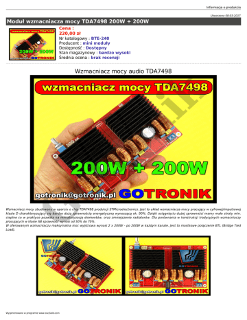 Informacje o produkcie Utworzono 08-03-2017 Moduł wzmacniacza mocy TDA7498 200W + 200W Cena : 220,00 zł Nr katalogowy : BTE-240 Producent : mini moduły Dostępność : Dostępny Stan magazynowy : bardzo wysoki Średnia ocena : brak recenzji G ot r on ik Wzmacniacz mocy audio TDA7498 Wzmacniacz mocy zbudowany w oparciu o chip TDA7498 produkcji STMicroelectronics. Jest to układ wzmacniacza mocy pracujący w cyfrowej/impulsowej klasie D charakteryzujący się bardzo dużą sprawnością energetyczną wynoszącą ok. 90%. Dzięki osiągnięciu dużej sprawności mamy małe straty min. cieplne co w praktyce pozwala na miniaturyzację elementów, oraz zmniejszenie radiatorów. Dla porównania w konstrukcji tradycyjnych wzmacniaczy pracujących w klasie AB sprawność wynosi od 50% do 70%. W oferowanym wzmacniaczu maksymalna moc wyjściowa wynosi 2 x 200W - po 200W w każdym kanale. Jest to mostkowe połączenie BTL (Bridge Tied Load). Wygenerowano w programie www.oscGold.com dane techniczne: ● ● ● ● ● ● ● ● ● ● ● ● on ik ● wzmacniacz mocy audio pracuje w cyfrowej/impulsowej klasie D zbudowany w oparciu o układ: TDA7498 - STMicroelectronics bardzo duża moc wyjściowa: 2 x 200W wysoka sprawność: 90% prąd spoczynkowy: 80mA pasmo przenoszenia: 20Hz do 20kHz napięcia zasilania DC: od 20V do 32V zalecane napięcie zasilania: 32V dc maksymalny prąd wyjsciowy: 10A zastosowano metalizowane rezystory ± 5% potencjometr do regulacji wzmocnienia / głośności wyjście do podłączenia kolmn/głośników: terminal block ARK-2 do przykręcenia przewodów złącze zasilania: DC-JACK wymiary płytki drukowanej: 147 x 87mm karta katalogowa układu TDA7498 (datasheet) ot r ● przykładowa aplikacja - sposób podłączenia wzmacniacza mocy TDA7498: G ● G ot r on ik Informacje o produkcie Wygenerowano w programie www.oscGold.com G ot r on ik zdjęcia: G ot r on ik Informacje o produkcie Wygenerowano w programie www.oscGold.com on ik ot r G G ot r on ik Informacje o produkcie Wygenerowano w programie www.oscGold.com on ik ot r G ot r on ik Informacje o produkcie G YJ YuanJing TDA7498 amplifier board 32VDC 2.0 channel class D Parallel TDA7498 amplifier 200W+200W better TA2024 TDA7498 Class-D Power Amplifier Board [100W + 100W] [Parallel] TDA7498 - ST-Micro Dual BTL Class-D Audio Amplifier Wygenerowano w programie www.oscGold.com