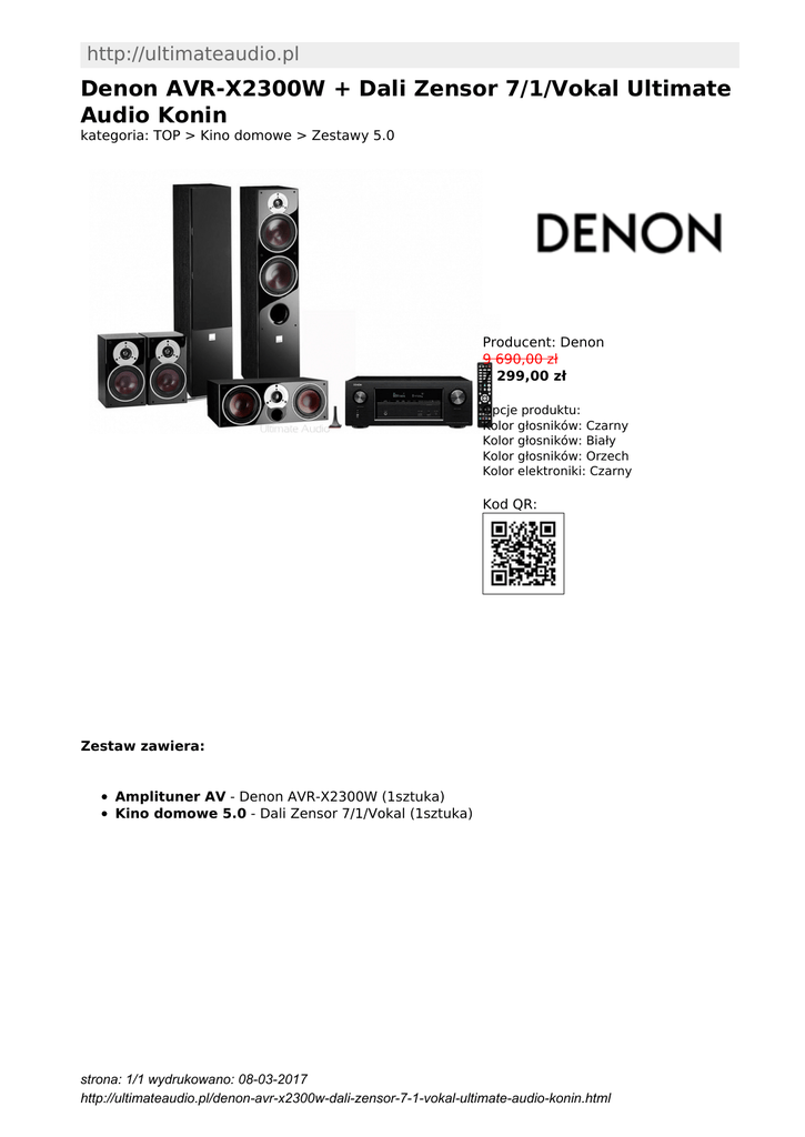 http://ultimateaudio.pl Denon AVR-X2300W + Dali Zensor 7/1/Vokal Ultimate Audio Konin kategoria: TOP > Kino domowe > Zestawy 5.0 Producent: Denon 9 690,00 zł 7 299,00 zł Opcje produktu: Kolor głosników: Czarny Kolor głosników: Biały Kolor głosników: Orzech Kolor elektroniki: Czarny Kod QR: Zestaw zawiera: Amplituner AV - Denon AVR-X2300W (1sztuka) Kino domowe 5.0 - Dali Zensor 7/1/Vokal (1sztuka) strona: 1/1 wydrukowano: 08-03-2017 http://ultimateaudio.pl/denon-avr-x2300w-dali-zensor-7-1-vokal-ultimate-audio-konin.html