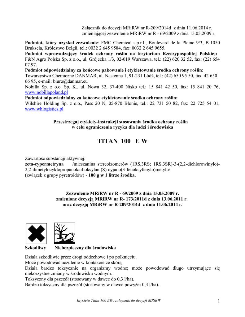 Załącznik do decyzji MRiRW nr R-209/2014d z dnia 11.06.2014 r. zmieniającej zezwolenie MRiRW nr R - 69/2009 z dnia 15.05.2009 r. Podmiot, który uzyskał zezwolenie: FMC Chemical s.p.r.l., Boulevard de la Plaine 9/3, B-1050 Bruksela, Królestwo Belgii, tel.: 0032 2 645 9584, fax: 0032 2 645 9655. Podmiot wprowadzający środek ochrony roślin na terytorium Rzeczypospolitej Polskiej: F&N Agro Polska Sp. z o.o., ul. Grójecka 1/3, 02-019 Warszawa, tel.: (22) 620 32 52, fax: (22) 654 07 97. Podmiot odpowiedzialny za końcowe pakowanie i etykietowanie środka ochrony roślin: Towarzystwo Chemiczne DANMAR, ul. Nasienna 1, 91-231 Łódź, tel.: (42) 650 95 50, fax. 42 650 66 95, e-mail: [email protected] Nobilla Sp. z o.o. Sp. K., ul. Nowa 32, 37-400 Nisko tel.: 15 841 42 50, fax: 15 841 20 76, www.nobillapoland.pl Podmiot odpowiedzialny za końcowe etykietowanie środka ochrony roślin: Wilshire Holding Sp. z o.o., Pass 20 N, 05-870 Błonie, tel.: 22 731 50 82, fax: 22 725 54 01, www.whlogistics.pl Przestrzegaj etykiety-instrukcji stosowania środka ochrony roślin w celu ograniczenia ryzyka dla ludzi i środowiska TITAN 100 E W Zawartość substancji aktywnej: zeta-cypermetryna /mieszanina stereoizomerów (1RS,3RS; 1RS,3SR)-3-(2,2-dichlorowinylo)2,2-dimetylocyklopropanokarboksylan (S)-cyjano(3-fenoksyfenylo)metylu/ (związek z grupy pyretroidów) - 100 g w 1 litrze środka. Zezwolenie MRiRW nr R - 69/2009 z dnia 15.05.2009 r. zmienione decyzją MRiRW nr R- 173/2011d z dnia 13.06.2011 r. oraz decyzją MRiRW nr R-209/2014d z dnia 11.06.2014 r. Szkodliwy Niebezpieczny dla środowiska Działa szkodliwie przez drogi oddechowe i po połknięciu. Może powodować uczulenie w kontakcie ze skórą. Działa bardzo toksycznie na organizmy wodne; może powodować długo utrzymujące się niekorzystne zmiany w środowisku wodnym. Toksyczny dla pszczół (stosowany w dawce do 0,3 l/ha). Bardzo toksyczny dla pszczół (stosowany w dawce powyżej 0,3 l/ha). Etykieta Titan 100 EW, załącznik do decyzji MRiRW 1 UWAGA! 1. Zabrania się stosowania środka w strefie bezpośredniej ochrony ujęć wody oraz na terenie otulin parków narodowych i rezerwatów. 2. Nie zanieczyszczać wód środkiem lub jego opakowaniem. I OPIS DZIAŁANIA Titan 100 EW jest środkiem owadobójczym w formie emulsji (olej w wodzie) do rozcieńczania wodą, o działaniu kontaktowym i żołądkowym przeznaczonym do zwalczania szkodników ssących i gryzących w roślinach rolniczych i sadowniczych. Na roślinie działa powierzchniowo. II ZAKRES STOSOWANIA, TERMINY I DAWKI 1. ROŚLINY ROLNICZE a) PSZENICA OZIMA I JARA, JĘCZMIEŃ OZIMY I JARY, ŻYTO, PSZENŻYTO OZIME I JARE, OWIES mszyce Zalecana dawka: 0,1 l/ha. Zabieg wykonać po wykłoszeniu - nie później niż do okresu mlecznej dojrzałości ziarna. skrzypionki Zalecana dawka: 0,1 l/ha. Stosować od początku wylęgania się larw. b) ZIEMNIAK larwy i chrząszcze stonki ziemniaczanej Zalecana dawka: 0,15-0,2 l/ha. Wyższą z zalecanych dawek stosować do zwalczania chrząszczy oraz w przypadku bujnej naci ziemniaczanej. Wykonać w sezonie 1 do 2 zabiegów. Odstęp między zabiegami powinien wynosić 10 dni. c) RZEPAK OZIMY chowacz brukwiaczek Zalecana dawka: 0,1 l/ha. Zabieg wykonać przed złożeniem jaj przez chrząszcze, zgodnie z sygnalizacją. słodyszek rzepakowy (zabieg przeciwko słodyszkowi zwalcza również chowacza czterozębnego) Zalecana dawka: 0,1 l/ha. Zabieg wykonać po wystąpieniu chrząszczy na plantacji, zgodnie z sygnalizacją. Etykieta Titan 100 EW, załącznik do decyzji MRiRW 2 szkodniki łuszczynowe (pryszczarek kapustnik, chowacz podobnik) Zalecana dawka: 0,1 l/ha. Zabieg wykonać w początkowym okresie opadania płatków kwiatowych. Zalecana ilość wody: 200-400 l/ha. Zalecany rodzaj opryskiwania: średniokroplisty. d) TYTOŃ wciornastek tytoniowiec (wektor brązowej plamistości pomidora) • rozsadnik Zalecane stężenie: 0,05% (50 ml środka w 100 l wody). Stosować 100 ml cieczy użytkowej na/m2. Opryskiwać rozsadę 3-7 dni przed wysadzeniem w pole. • na plantacji trzykrotne opryskiwanie Zalecane stężenie: 0,025% (25 ml środka w 100 l wody). Pierwszy zabieg - po wysadzeniu rozsady -300 l cieczy/ha Drugi zabieg - po 21 dniach -450 l cieczy/ha Trzeci zabieg - po 42 dniach od pierwszego zabiegu -600 l cieczy/ha. 2. ROŚLINY SADOWNICZE JABŁOŃ toczyk gruszowiaczek Zalecana dawka: 0,3 l/ha. Zabieg wykonać na początku wylęgania się larw, w okresie przekwitania zimowych odmian jabłoni (pod koniec opadania płatków kwiatowych). - owocówka jabłkóweczka Zalecana dawka: 0,3-0,4 l/ha. Zabieg wykonać, gdy występuje faza tzw. „czarnej główki”. Wyższą z zalecanych dawek stosować w przypadku dużej liczebności szkodnika. Zalecana ilość wody: 500 - 750 l/ha. UWAGI: Zaleca się stosować środek w temperaturze poniżej 20°C. W wyższej temperaturze zabieg wykonać pod koniec dnia. Zabieg przeciwko szkodnikom (zwłaszcza ssącym) wykonać dokładnie, aby wszystkie części rośliny były pokryte cieczą użytkową. Środek stosować przemiennie z insektycydami należącymi do innych grup chemicznych. W celu ochrony pszczół i innych owadów zapylających przestrzegać następujących zaleceń: a) w przypadku stosowania środka w dawce do 0,3 l/ha na rośliny uprawne w czasie kwitnienia oraz kiedy na uprawie chronionej występują kwitnące chwasty i w miejscach, gdzie pszczoły mają pożytek, zabieg należy wykonać wieczorem po zakończeniu dziennego oblotu pszczół. b) środka w dawce powyżej 0,3 l/ha środka nie stosować: - na rośliny uprawne w czasie kwitnienia - kiedy na uprawie chronionej występują kwitnące chwasty - w miejscach gdzie pszczoły mają pożytek, a także na roślinach, których kwitnienie może rozpocząć się przed upływem okresu prewencji. Etykieta Titan 100 EW, załącznik do decyzji MRiRW 3 III OKRES KARENCJI okres od dnia ostatniego zabiegu do dnia zbioru roślin przeznaczonych do konsumpcji ZBOŻA (ps