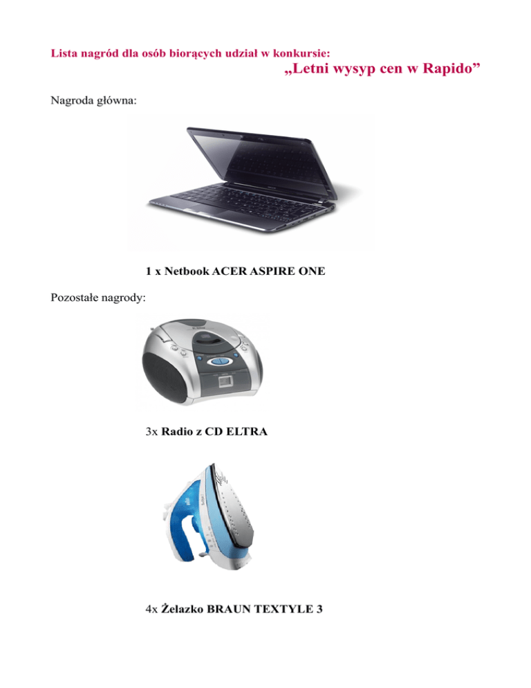 Lista nagród dla osób biorących udział w konkursie: „Letni wysyp cen w Rapido” Nagroda główna: 1 x Netbook ACER ASPIRE ONE Pozostałe nagrody: 3x Radio z CD ELTRA 4x Żelazko BRAUN TEXTYLE 3 5x Komplet garnków ze stali nierdzewnej TADAR 1x Zegarek CASIO 1x Zegarek TIMEX 15x Wentylator obrotowy …. lista nagród otwarta ..... sprawdź później więcej dostępnych nagród