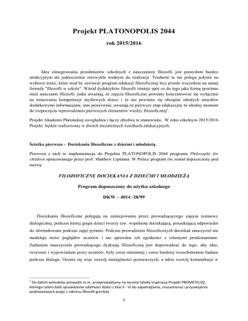 Projekt PLATONOPOLIS 2044 rok 2015/2016 Idea zintegrowania przedmiotów szkolnych z nauczaniem filozofii jest pomysłem bardzo atrakcyjnym ale jednocześnie niezwykle trudnym do realizacji. Trudność ta nie polega jedynie na wyborze treści, które miał by zawierać program edukacji filozoficznej lecz przede wszystkim na samej formule "filozofii w szkole". Wśród dydaktyków filozofii istnieje spór co do tego jaka formę powinno mieć nauczanie filozofii: jedni uważają, że zajęcia filozoficzne powinny koncentrować się wyłącznie na trenowaniu kompetencji myślowych dzieci i że nie powinno się obciążać młodych umysłów dodatkowymi informacjami, inni przeciwnie, uważają że pierwszy etap edukacyjny to idealny moment do rozpoczęcia wprowadzania pierwszych elementów wiedzy filozoficznej1. Projekt Akademii Platońskiej uwzględnia i łączy obydwa te stanowiska. W roku szkolnym 2015/2016 Projekt będzie realizowany w dwóch niezależnych ścieżkach edukacyjnych. Ścieżka pierwsza - Dociekania filozoficzne z dziećmi i młodzieżą. Pierwsza z nich to implementacja do Projektu PLATONOPOLIS 2044 programu Philosophy for children opracowanego przez prof. Matthew Lipmana. W Polsce program ów został dopuszczony pod nazwą: FILOZOFICZNE DOCIEKANIA Z DZIEĆMI I MŁODZIEŻĄ Program dopuszczony do użytku szkolnego DKW – 4014 -28/99 Dociekania filozoficzne polegają na zainicjowaniu przez prowadzącą/cego zajęcia rozmowy dialogicznej, podczas której grupa dzieci tworzy tzw. wspólnotę dociekającą, poszukującą odpowiedzi do sformułowane podczas zajęć pytanie. Podczas prowadzenia filozoficznych dociekań nauczyciel nie modeluje treści poglądów uczniów i nie sprawdza ich zgodności z własnymi przekonaniami. Zadaniem nauczyciela prowadzącego dyskusję filozoficzną jest doprowadzać do tego, aby idee, tworzone i wypowiadane przez uczniów, były coraz staranniej i coraz bardziej wszechstronnie badane podczas dialogu. Ocenia się więc rozwój umiejętności poznawczych, a także rozwój komunikacji w 1 Do takich wniosków prowadzi m.in. przeprowadzony na teranie Szkoły Inspiracja Projekt PROMETEUSZ, którego celem było sprawdzenie zdolności dzieci z klas II - VI do zapamiętania, zrozumienia i przyswojenia podstawowych pojęć z zakresu filozofii greckiej. 1 grupie. Dlatego ocena obejmuje zarówno umiejętność funkcjonowania podczas dyskusji, jak i umiejętności poznawcze. Dociekania filozoficzne będą realizowane w Szkole Inspiracja w formie systemowej jako integralny element edukacji filozoficznej i przedmiotowej, w wymiarze jednej godziny tygodniowo dla każdej klasy. Ta ścieżka Projektu zawiera w sobie innowacyjny, prekursorski element polegający na łączeniu dociekań filozoficznych z wiedzą przedmiotową. Celem takiej formy dociekań, jest umożliwienie dzieciom dokonania refleksji - dzieci będą mogły zastanowić się nad sensem wiedzy szkolnej, nad jej związkiem z ich życiem, nad jej miejscem w całościowym obrazie świata jaki pod wpływem doświadczeń i edukacji kształtuje się w umyśle dziecka. Jednak należy podkreślić, iż elementy wiedzy przedmiotowej mogą stanowić jedynie punkt wyjścia dociekań filozoficznych. Istota dociekań polega na tym, że to same dzieci (tzw. wspólnota dociekająca) decydują o kierunku dialogicznej rozmowy, dlatego dyskusja może potoczyć się w przestrzeń zupełnie nie związanym z jej punktem wyjścia. Na tym polega trening myślenia - ma ono zostać wyzwolone z ograniczających je barier. Ścieżka druga - Program do lekcji etyki z filozofią oraz tworzenie filozoficzno etycznego rdzenia systemu edukacyjnego. Plan opracowania nowego systemu edukacyjnego opartego na filozoficzno - etycznym fundamencie wymaga precyzyjnego określania tego fundamentu. Pierwszym krokiem tworzenia takiego systemu musi być opracowanie nowego programu do edukacji filozoficznej dla wszystkich poziomów edukacyjnych. Specyfika tego programu musi polegać na uwzględnieniu dwóch ściśle ze sobą powiązanych elementów. Pierwszym z nich jest cel finalny Projektu czyli ukształtowanie dojrzałej, świadomej istoty ludzkiej, wyposażonej zarówno w kompetencje myślowe i społeczne oraz w wiedzę z różnych dziedzin, czyniącą zeń osobę światłą, obywatelkę/obywatela nowoczesnego, demokratycznego świata (model absolwenta systemu edukacyjnego Akademii Platońskiej). Drugim elementem jest uwzględnienie perspektywy wiedzy przedmiotowej. Jeżeli kolejnym krokiem Projektu będzie proces integrowania nauczania historii czy fizyki z filozoficznym fundamentem, to ów fundament powinien zawierać w sobie "miejsce na umocowanie" w nim pozostałych programów edukacyjnych, w przeciwnym razie będzie wymagał późniejszej korekty. Dlatego przewidując przyszłą integracje filozofii z innymi przedmiotami, należy umieścić w programie filozoficznym odpowiednie treści (np. jeśli w programie nauczania języka polskiego znajdują sie tematy dotyczące polskiego romantyzmu, to warto zawczasu uwzględnić w programie filozofii lekcje o paryskich wykładach Adama Mickiewicza dotyczących jego wizji filozofii mesjanistycznej, stanowiącej typowo polski nurt w historii filozofii). Pierwszym krokiem do stworzenia takiego kompleksowego i rozbudowanego multi-programu do edukacji filozoficznej było opracowanie nowego programu do lekcji etyki z filozofią. Grupa ekspertów Akademii Platońskiej opracowała nowy autorski program do lekcji etyki z filozofią dla pierwszego i drugiego etapu edukacyjnego. 2