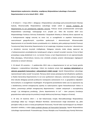 Najważniejsze wydarzenia z dziedziny współpracy Województwa Lubuskiego z francuskim Departamentem Le Lot w latach 2012 – 2014 1. W dniach 1 - 3 lipca 2012 r. delegacja z Województwa Lubuskiego pod przewodnictwem Macieja Szykuły, Wicemarszałka Województwa Lubuskiego wzięła udział w wizycie studyjnej do Departamentu le Lot poświęconej żegludze rzecznej. Podczas wizyty przedstawiciele samorządu Województwa Lubuskiego, realizującego m.in. projekt pn.: Odra dla turystów 2014 oraz Wojewódzkiego Funduszu Ochrony Środowiska i Gospodarki Wodnej w Zielonej Górze zapoznali się z funkcjonowanie żeglugi rzecznej na rzece Lot, w szczególności w aspekcie historycznym, uwarunkowań geograficznych, czynników społecznych i ekonomicznych. Wicemarszałek Departamentu le Lot Danielle Deviers przedstawiła m.in. działania, jakie podejmuje Komitet Promocji Turystycznej Rady Generalnej Departamentu le Lot wspierając inicjatywy turystyczne i ekonomiczne w dziedzinie rzecznej turystyki śródlądowej. Delegacja Lubuska miała okazję zapoznać się z funkcjonowaniem przedsiębiorstw świadczących usługi w ramach turystyki rzecznej. Firma le Boat prowadząca swoją działalność m.in. na terenie Francji, w tym Departamencie le Lot zaprezentowała flotę pływającą, infrastrukturę rzeczną oraz omówiła przepisy prawne obowiązujące żeglujących amatorów w ramach rekreacji. 2. W dniach 29 września – 2 października 2013 roku w departamencie le Lot we Francji gościła delegacja z województwa lubuskiego. Celem tej studyjnej wizyty była wymiana doświadczeń w zakresie gospodarki komunalnej i odnawialnych źródeł energii. Sejmik Województwa Lubuskiego reprezentował radny Leszek Turczyniak. Pierwszy dzień wizyty poświęcony był oficjalnemu spotkaniu w Radzie Generalnej Departamentu le Lot oraz spotkaniom roboczym, natomiast podczas drugiego dnia lubuska delegacja poznała praktyczne rozwiązania zastosowane m.in. w gospodarce odpadami komunalnymi, w szczególności recyklingiem. W programie przewidziano także czas na zapoznanie się z działalnością centrali energetycznej opartej na wykorzystaniu ogniw fotowoltaicznych Valeco w Cahors, prezentacja polityki energetycznej departamentu i działań związanych z oszczędnością energii i jej ekologiczną produkcją, „Domu departamentu le Lot” – dom pasywny (instalacja gospodarstwa wykorzystuje do produkcji energii elektrycznej biomasę i biogazy w Gramat). 3. W dniu 23 kwietnia 2014 r. w Sali Kolumnowej Urzędu Marszałkowskiego Województwa Lubuskiego odbył się I Kongres Młodych Rolników. Zainteresowani mogli dowiedzieć się, jakie pieniądze trafią na wieś w nowej perspektywie finansowej. Poznali także wyróżniających się młodych lubuskich rolników, a także dobre praktyki płynące od francuskich farmerów. Sejmik Województwa Lubuskiego reprezentowali: Przewodniczący Tomasz Możejko oraz Przewodniczący Komisji Rolnictwa i Ochrony Środowiska Zbigniew Kołodziej. Organizatorem kongresu byli: Stowarzyszenie Lubuski Młody Rolnik, Związek Zawodowy Centrum Narodowe Młodych Rolników, Urząd Marszałkowski Województwa Lubuskiego oraz Sekretariat Regionalny Krajowej Sieci Obszarów Wiejskich. Podczas tego spotkania podpisano umowę partnerską o współpracy między stowarzyszeniami młodych rolników z Polski oraz z Francji. 4. W dniach 2 - 5 czerwca 2014 roku Sekretariat Regionalny Krajowej Sieci Obszarów Wiejskich, organizował wyjazd studyjny do Departamentu le LOT we Francji. Wyjazd przeznaczony był dla grup producentów rolnych naszego regionu. Wizyta miała na celu pośredniczenie w poszukiwaniu partnerów do realizacji projektów innowacyjnych a następnie ich rozpowszechnianie, wymianę doświadczeń miedzy uczestnikami wyjazdu, a zagranicznymi przedstawicielami stowarzyszeń oraz grup producentów rolnych z terenu zaprzyjaźnionego, francuskiego regionu, zapoznanie się z projektami realizowanymi na tamtejszych obszarach wiejskich w ramach programów unijnych oraz pogłębianie wiedzy dotyczącej polityki rozwoju obszarów wiejskich. 5. Delegacja francuska brała udział w Dniach Województwa Lubuskiego w 2014 roku, w tym w Forum Regionów Partnerskich. 6. Ponadto od 1990 roku do chwili obecnej trwa wymiana młodzieży ze szkół zawodowych z Polski oraz z Francji, ogółem – 750 Polaków i 250 Francuzów, w tym 500 osób w ramach programów Leonardo da Vinci i Erasmus Plus. Są to praktyki i staże zawodowe z gastronomii i hotelarstwa oraz usług turystycznych (partnerem jest Zespół Szkół Ponadgimnazjalnych w Gubinie) a w latach wcześniejszych także staże z zakresu rolnictwa.