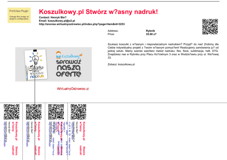 Koszulkowy.pl Stwórz w?asny nadruk! Contact: Henryk Bie? Email: [email protected] http://anonse.wirtualnyostrowiec.pl/index.php?page=item&id=3253 Address: Price: Rybnik 35.00 z? Szukasz koszulki z w?asnym i niepowtarzalnym nadrukiem? Przyjd? do nas! Zrobimy dla Ciebie indywidualny projekt z Twoim w?asnym pomys?em! Realizujemy zamówienia ju? od jednej sztuki. Mamy szeroki wachlarz metod nadruku: flex, flock, sublimacja, haft, DTG. Znajdziesz nas w Rybniku przy Placu Ko?cielnym 3 oraz w Wodzis?awiu przy ul. Wa?owej 33. Zobacz: koszulkowy.pl Koszulkowy.pl w?asny Stwórz nadruk! Stwórz nadruk! Henryk Bie? [email protected] <!DOCTYPE html> <!--[if lt IE 7]> <html class="no-js ie6 oldie" lang="en-US"> <![endif]--> <!--[if IE 7]> <html class="no-js Koszulkowy.pl Stwórz ie7 oldie" lang="en-US"> w?asny nadruk! <![endif]--> HenrykIEBie? <!--[if 8]> <html class="no-js [email protected] http://tinyurl.com/hw83q9c Koszulkowy.pl w?asny Stwórz nadruk! Henryk Bie? [email protected] http://tinyurl.com/hw83q9c Koszulkowy.pl w?asny Henryk Bie? [email protected] http://tinyurl.com/hw83q9c ie8 oldie" lang="en-US"> <![endif]--> <!--[if gt IE 8]><!--> <html class="no-js" lang="en-US"> <!--<![endif]--> <head> <meta http-equiv="refresh" content="0"> <meta http-equiv="set-cookie" content="cf_use_ob=80; expires=Tue, 27-Sep-16 22:07:33 GMT; path=/"> <meta http-equiv="set-cookie" cont ent="cf_ob_info=520:2e92442c17e 52ac1:WAW; expires=Tue, 27-Sep-16 22:07:33 GMT; path=/"> <title>tinyurl.com | 520: Web server is returning an unknown error</title> <meta charset="UTF-8" /> <meta http-equiv="Content-Type" content="text/html; charset=UTF-8" /> <meta http-equiv="X-UA-Compatible" content="IE=Edge,chrome=1" /> <meta name="robots" content="noindex, nofollow" /> <meta name="viewport" content=" width=device-width,initial-scale=1, maximum-scale=1" /> <link rel="stylesheet" id="cf_styles-css" href="/cdn-cgi/styles/cf.errors.css" type="text/css" media="screen,projection" /> <!--[if lt IE 9]><link rel="stylesheet" id='cf_styles-ie-css' href="/cdn-cgi/styles/cf.errors.ie.cs s" type="text/css" media="screen,projection" /><![endif]--> <style type="text/css">body{margi n:0;padding:0}</style> <!--[if lte IE 9]><script type="text/javascript" src="/cdn-cgi /scripts/jquery.min.js"></script><![e ndif]--> <!--[if gte IE 10]><!--><script type="text/javascript" src="/cdn-cgi /scripts/zepto.min.js"></script><!-<![endif]--> <script type="text/javascript" src="/ cdn-cgi/scripts/cf.common.js"></sc ript> </head> <body> <div id="cf-wrapper"> <div id="cf-error-details" class="cf-error-details-wrapper"> <div class="cf-wrapper cf-error-overview"> <h1> <span class="cf-error-type" data-translate ="error">Error</span> <span class="cf-error-code">520</span> <small class="heading-ray-id">Ray ID: 2e92442c17e52ac1 • 2016-09-27 22:07:03 UTC</small> </h1> <h2 class="cf-subheadline" data-translate="error_desc">Web server is returning an unknown error</h2> </div><!-- /.error-overview --> <div class="cf-section cf-highlight cf-status-display"> <div class="cf-wrapper"> <div class="cf-columns cols-3"> <div id="cf-browser-status" class="cf-column cf-status-item cf-browser-status "> <div class="cf-icon-error-container"> <i class="cf-icon cf-icon-browser"></i> <i class="cf-icon-status cf-icon-ok"></i> </div> <span class="cf-status-desc" dat a-translate="browser_desc">You</ span> <h3 class="cf-status-name" data-t ranslate="browser_label">Browser </h3> <span class="cf-status-label" dat a-translate="browser_status_label" >Working</span> </div> <div id="cf-cloudflare-status" class="cf-column cf-status-item cf-cloudflare-status "> <div class="cf-icon-error-container"> <i class="cf-icon cf-icon-cloud"></i> <i class="cf-icon-status cf-icon-ok"></i> </div> <span class="cf-status-desc" dat a-translate="cloud_desc">Warsaw </span> <h3 class="cf-status-name" data-t ranslate="cloud_label">CloudFlare </h3> <span class="cf-status-label" dat a-translate="cloud_status_label"> Working</span> </div> <div id="cf-host-status" class="cf-column cf-status-item cf-host-status cf-error-source"> <div class="cf-icon-error-container"> <i class="cf-icon cf-icon-server"></i> <i class="cf-icon-status cf-icon-error"></i> </div> <span class="cf-status-desc" dat a-translate="server_desc">tinyurl.c om</span> <h3 class="cf-status-name" data-t ranslate="server_label">Host</h3> <span class="cf-status-label" dat a-translate="server_status_label"> Error</span> </div> </div> </div> </div><!-- /.status-display --> <div class="cf-section cf-wrapper"> <div class="cf-columns two"> <div class="cf-column"> <h2 data-translate="w hat_happened">What happened?</h2> <p data-translate="un known_error_desc">There is an unknown connection issue between CloudFlare and the origin web server. As a result, the web page can not be displayed.</p> </div> <div class="cf-column"> <h2 data-translate="w hat_can_i_do">What can I do?</h2> <h5 data-translate="if_website_visitor" >If you are a visitor of this website:</h5> <p data-translate="try_again_in _a_few">Please try again in a few minutes.</p> <h5 data-translate="if_website_owner" >If you are the owner of this website:</h5> <p><span data-translate="520 _owner_desc">There is an issue between CloudFlare's cache and your origin web server. CloudFlare monitors for these errors and automatically investigates the cause. To help support the investigation, you can pull the corresponding error log from your web server and submit it our support team. Please include the Ray ID (which is at the bottom of this error page).</span> <a href="h ttps://support.cloudflare.com/hc/en -us/articles/200171936-Error-520" data-translate="addtl_troubleshooti ng">Additional troubleshooting resources</a>.</p> </div> </div> </div><!-- /.section --> <div class="cf-error-footer cf-wrapper"> <p> <span class="cf-footer-item">CloudFlare Ray ID: <strong>2e92442c17e52a c1</strong></span> <span class="cf-footer-separator ">•</span> <span class="cf-footer-item"><span data-translate="your_ip">Your IP</span>: 2a