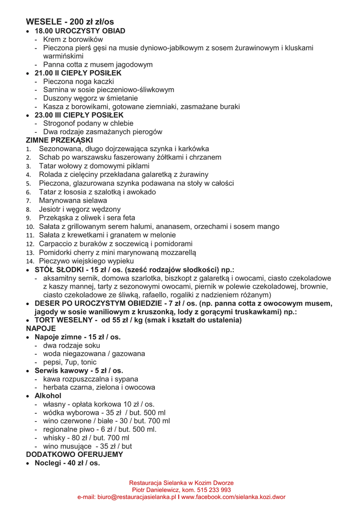 WESELE - 200 zł zł/os 18.00 UROCZYSTY OBIAD - Krem z borowików - Pieczona pierś gęsi na musie dyniowo-jabłkowym z sosem żurawinowym i kluskami warmińskimi - Panna cotta z musem jagodowym 21.00 II CIEPŁY POSIŁEK - Pieczona noga kaczki - Sarnina w sosie pieczeniowo-śliwkowym - Duszony węgorz w śmietanie - Kasza z borowikami, gotowane ziemniaki, zasmażane buraki 23.00 III CIEPŁY POSIŁEK - Strogonof podany w chlebie - Dwa rodzaje zasmażanych pierogów ZIMNE PRZEKĄSKI 1. Sezonowana, długo dojrzewająca szynka i karkówka 2. Schab po warszawsku faszerowany żółtkami i chrzanem 3. Tatar wołowy z domowymi piklami 4. Rolada z cielęciny przekładana galaretką z żurawiny 5. Pieczona, glazurowana szynka podawana na stoły w całości 6. Tatar z łososia z szalotką i awokado 7. Marynowana sielawa 8. Jesiotr i węgorz wędzony 9. Przekąska z oliwek i sera feta 10. Sałata z grillowanym serem halumi, ananasem, orzechami i sosem mango 11. Sałata z krewetkami i granatem w melonie 12. Carpaccio z buraków z soczewicą i pomidorami 13. Pomidorki cherry z mini marynowaną mozzarellą 14. Pieczywo wiejskiego wypieku STÓŁ SŁODKI - 15 zł / os. (sześć rodzajów słodkości) np.: - aksamitny sernik, domowa szarlotka, biszkopt z galaretką i owocami, ciasto czekoladowe z kaszy mannej, tarty z sezonowymi owocami, piernik w polewie czekoladowej, brownie, ciasto czekoladowe ze śliwką, rafaello, rogaliki z nadzieniem różanym) DESER PO UROCZYSTYM OBIEDZIE - 7 zł / os. (np. panna cotta z owocowym musem, jagody w sosie waniliowym z kruszonką, lody z gorącymi truskawkami) np.: TORT WESELNY - od 55 zł / kg (smak i kształt do ustalenia) NAPOJE Napoje zimne - 15 zł / os. - dwa rodzaje soku - woda niegazowana / gazowana - pepsi, 7up, tonic Serwis kawowy - 5 zł / os. - kawa rozpuszczalna i sypana - herbata czarna, zielona i owocowa Alkohol - własny - opłata korkowa 10 zł / os. - wódka wyborowa - 35 zł / but. 500 ml - wino czerwone / białe - 30 / but. 700 ml - regionalne piwo - 6 zł / but. 500 ml. - whisky - 80 zł / but. 700 ml - wino musujące - 35 zł / but DODATKOWO OFERUJEMY Noclegi - 40 zł / os. Restauracja Sielanka w Kozim Dworze Piotr Danielewicz, kom. 515 233 993 e-mail: [email protected] І www.facebook.com/sielanka.kozi.dwor - dysponujemy 60 miejscami noclegowymi w 18 pokojach Śniadanie - od 15 zł / os. - np. zimny bufet wędlin, serów oraz warzyw Poprawiny - grill (karkówka, kiełbaski, kiszka ziemniaczana, kaszanka, pieczone w całości ziemniaki, pomidory z cebulką, kwaszone ogóreczki, sałata grecka, pieczywo, keczup, musztarda) 65 zł / os. - obiad - od 60 zł / os. Pokrowce na krzesła - GRATIS Zaznaczam, że są to propozycje i jeżeli nie spełniają one Państwa oczekiwań możemy je dowolnie zmodyfikować. ROZLICZENIE: - Wstępna rezerwacja na okres dwóch tygodni - potwierdzeniem rezerwacji jest wpłata zadatku w wysokości 1 000 zł. - 30% szacowanej kwoty w formie zadatku za przyjęcie najpóźniej na pół roku przed planowanym przyjęciem - Ostateczne rozliczenie najpóźniej na dzień przed przyjęciem. - Dzieci do 5 roku życia oraz obsługa (dj., fotograf, itp.) - 40 zł / os. - Dzieci między 5, a 10 rokiem życia - 50% ceny za os. dorosłą. Restauracja Sielanka w Kozim Dworze Piotr Danielewicz, kom. 515 233 993 e-mail: [email protected] І www.facebook.com/sielanka.kozi.dwor