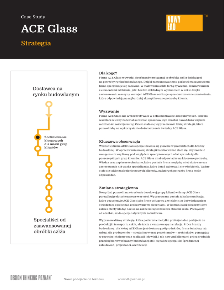 Case Study ACE Glass Strategia Dla kogo? Firma ACE Glass wywodzi się z branży związanej z obróbką szkła działającej na potrzeby rynku budowlanego. Dzięki zaawansowanemu parkowi maszynowemu Dostawca na rynku budowlanym firma specjalizuje się zarówno w malowaniu szkła farbą żywiczną, laminowaniem z elementami zdobienia, jak i bardzo dokładnym wycinaniem w szkle dzięki zastosowaniu maszyny waterjet. ACE Glass realizuje spersonalizowane zamówienia, które odpowiadają na najbardziej skomplikowane potrzeby klienta. Wyzwanie Firma ACE Glass nie wykorzystywała w pełni możliwości produkcyjnych. Szeroki wachlarz wiedzy na temat surowca i sposobów jego obróbki dawał dużo większe możliwości rozwoju usług. Celem stało się wypracowanie takiej strategii, która pozwoliłaby na wykorzystanie doświadczenia i wiedzy ACE Glass. Zdefiniowanie kluczowych dla marki grup klientów Kluczowa obserwacja Wcześniej firma ACE Glass specjalizowała się głównie w produktach dla branży budowlanej. W opracowaniu nowej strategii bardzo ważne stało się, aby zwrócić uwagę na rozwój firmy pod względem sprecyzowanych ofert sprzedaży dla poszczególnych grup klientów. ACE Glass miał odpowiadać na kluczowe potrzeby. Wiedza oraz zaplecze techniczne, które posiada firma mogłyby mieć dużo szersze zastosowanie niż wąska specjalizacja, którą dotąd zajmowali się właściciele. Ważne stało się także znalezienie nowych klientów, na których potrzeby firma może odpowiadać. Zmiana strategiczna Nowy Ład pozwolił na określenie docelowej grupy klientów firmy ACE Glass porządkując dotychczasowe wartości. Wypracowana została taka komunikacja, która pozycjonuje ACE Glass jako firmę usługową z wieloletnim doświadczeniem świadczącą opiekę nad realizowanymi zleceniami. W komunikacji poszerzyliśmy zakres oferty kładąc nacisk na różne usługi z zakresu obróbki szkła. Począwszy od obróbki, aż do specjalistycznych zabudowań. Specjaliści od zaawansowanej obróbki szkła Wypracowaliśmy strategię, która podkreśla nie tylko profesjonalne podejście do produkcji i transportu szkła, ale także zwraca uwagę na relacje. Prócz branży budowlanej, dla której ACE Glass jest dostawcą półproduktów, firma świadczy też usługi dla producentów – specjalistów oraz projektantów – architektów, pomagając w rozwoju ich firmy oraz realizacji ich wizji. I tak nowymi klientami prócz średnich przedsiębiorstw z branży budowlanej stali się także specjaliści (producenci zabudowań, projektanci, architekci). Nowe podejście do biznesu www.dt-poznan.pl Case Study ACE Glass Wizerunek Decyzje wizerunkowe Branding ACE Glass kładzie nacisk na pokazanie szerokich usług i specjalizacji firmy. Zastosowanie odcieni niebieskiego koloru w identyfikacji, bezpośrednio odnosi się do surowca jakim jest szkło. Element charakterystyczny jakim są pasy to inspiracja taflami szyb wykorzystywanych w codziennej pracy. Dedykowane ikony obrazują zarówno proces produkcyjny, jak i dziedziny działalności. Dzięki Nowemu Ładowi firma ACE Glass to nie tylko zakład, ale przede wszystkim partner w obróbce szkła. Elementy charakterystyczne • tekstura – pasy • dwa odcienie niebieskiego • proste, czytelne ikony Narzędzia budowania marki • prezentacja • profesjonalna dokumentacja realizacji • i nfografika tłumacząca proces działania firmy Nowe podejście do biznesu www.dt-poznan.pl