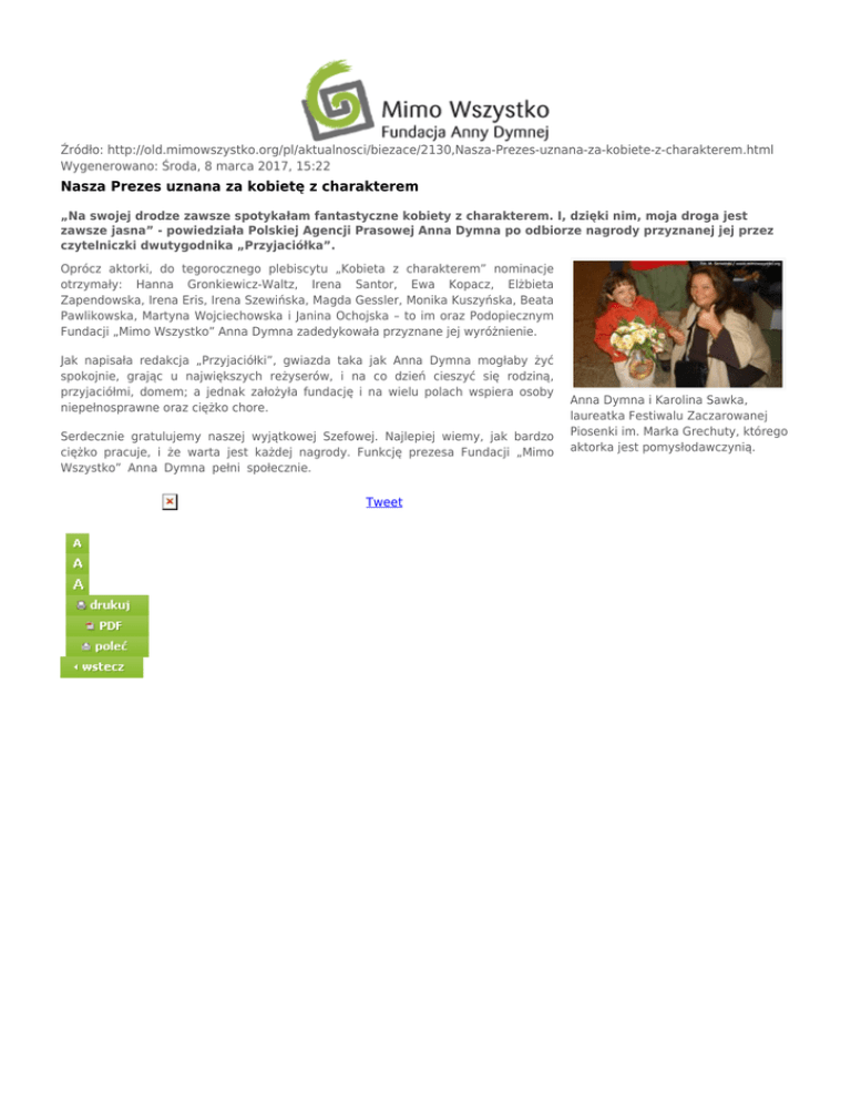 Źródło: http://old.mimowszystko.org/pl/aktualnosci/biezace/2130,Nasza-Prezes-uznana-za-kobiete-z-charakterem.html Wygenerowano: Środa, 8 marca 2017, 15:22 Nasza Prezes uznana za kobietę z charakterem „Na swojej drodze zawsze spotykałam fantastyczne kobiety z charakterem. I, dzięki nim, moja droga jest zawsze jasna” - powiedziała Polskiej Agencji Prasowej Anna Dymna po odbiorze nagrody przyznanej jej przez czytelniczki dwutygodnika „Przyjaciółka”. Oprócz aktorki, do tegorocznego plebiscytu „Kobieta z charakterem” nominacje otrzymały: Hanna Gronkiewicz-Waltz, Irena Santor, Ewa Kopacz, Elżbieta Zapendowska, Irena Eris, Irena Szewińska, Magda Gessler, Monika Kuszyńska, Beata Pawlikowska, Martyna Wojciechowska i Janina Ochojska – to im oraz Podopiecznym Fundacji „Mimo Wszystko” Anna Dymna zadedykowała przyznane jej wyróżnienie. Jak napisała redakcja „Przyjaciółki”, gwiazda taka jak Anna Dymna mogłaby żyć spokojnie, grając u największych reżyserów, i na co dzień cieszyć się rodziną, przyjaciółmi, domem; a jednak założyła fundację i na wielu polach wspiera osoby niepełnosprawne oraz ciężko chore. Serdecznie gratulujemy naszej wyjątkowej Szefowej. Najlepiej wiemy, jak bardzo ciężko pracuje, i że warta jest każdej nagrody. Funkcję prezesa Fundacji „Mimo Wszystko” Anna Dymna pełni społecznie. Tweet Anna Dymna i Karolina Sawka, laureatka Festiwalu Zaczarowanej Piosenki im. Marka Grechuty, którego aktorka jest pomysłodawczynią.