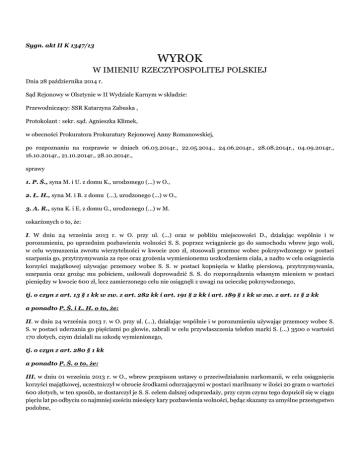 Sygn. akt II K 1347/13 WYROK W IMIENIU RZECZYPOSPOLITEJ POLSKIEJ Dnia 28 października 2014 r. Sąd Rejonowy w Olsztynie w II Wydziale Karnym w składzie: Przewodniczący: SSR Katarzyna Zabuska , Protokolant : sekr. sąd. Agnieszka Klimek, w obecności Prokuratora Prokuratury Rejonowej Anny Romanowskiej, po rozpoznaniu na rozprawie w dniach 06.03.2014r., 22.05.2014., 24.06.2014r., 28.08.2014r., 04.09.2014r., 16.10.2014r., 21.10.2014r., 28.10.2014r., sprawy 1. P. Ś., syna M. i U. z domu K., urodzonego (...) w O., 2. Ł. H., syna M. i B. z domu (...), urodzonego (...) w O., 3. A. R., syna K. i E. z domu G., urodzonego (...) w M. oskarżonych o to, że: I. W dniu 24 września 2013 r. w O. przy ul. (...) oraz w pobliżu miejscowości D., działając wspólnie i w porozumieniu, po uprzednim pozbawieniu wolności S. S. poprzez wciągniecie go do samochodu wbrew jego woli, w celu wymuszenia zwrotu wierzytelności w kwocie 200 zł, stosowali przemoc wobec pokrzywdzonego w postaci szarpania go, przytrzymywania za ręce oraz grożenia wymienionemu uszkodzeniem ciała, a nadto w celu osiągniecia korzyści majątkowej używając przemocy wobec S. S. w postaci kopnięcia w klatkę piersiową, przytrzymywania, szarpania oraz grożąc mu pobiciem, usiłowali doprowadzić S. S. do rozporządzenia własnym mieniem w postaci pieniędzy w kwocie 600 zł, lecz zamierzonego celu nie osiągnęli z uwagi na ucieczkę pokrzywdzonego, tj. o czyn z art. 13 § 1 kk w zw. z art. 282 kk i art. 191 § 2 kk i art. 189 § 1 kk w zw. z art. 11 § 2 kk a ponadto P. Ś. i Ł. H. o to, że: II. w dniu 24 września 2013 r. w O. przy ul. (...), działając wspólnie i w porozumieniu używając przemocy wobec S. S. w postaci uderzania go pięściami po głowie, zabrali w celu przywłaszczenia telefon marki S. (...) 3500 o wartości 170 złotych, czym działali na szkodę wymienionego, tj. o czyn z art. 280 § 1 kk a ponadto P. Ś. o to, że: III. w dniu 01 września 2013 r. w O., wbrew przepisom ustawy o przeciwdziałaniu narkomanii, w celu osiągnięcia korzyści majątkowej, uczestniczył w obrocie środkami odurzającymi w postaci marihuany w ilości 20 gram o wartości 600 złotych, w ten sposób, ze dostarczył je S. S. celem dalszej odsprzedaży, przy czym czynu tego dopuścił się w ciągu pięciu lat po odbyciu co najmniej sześciu miesięcy kary pozbawienia wolności, będąc skazany za umyślne przestępstwo podobne, tj. o czyn z art. 56 ust. 1 ustawy z dnia 29 lipca 2005 r. o przeciwdziałaniu narkomanii w zw. z art. 64 § 1 kk a nadto Ł. H. o to, że: IV. w dniu 24 września 2013 r. w O. przy ul. (...) wbrew przepisom ustawy posiadał środki odurzające w postaci marihuany o łącznej ilości 20, 535 grama oraz amfetaminy o łącznej ilości 6, 967 grama, tj. o czyn z art. 62 ust. 1 ustawy z dnia 29 lipca 2005 r. o przeciwdziałaniu narkomanii I. oskarżonych P. Ś. i Ł. H. w ramach zarzucanych im czynów opisanych w pkt I i II ao uznaje za winnych tego, że: w dniu 24 września 2013 r. w O. przy ul. (...) a następnie w pobliżu miejscowości D., działając wspólnie i w porozumieniu, w krótkich odstępach czasu, w wykonaniu z góry powziętego zamiaru, w celu wymuszenia wierzytelności w kwocie 200 złotych oraz usiłując doprowadzić pokrzywdzonego S. S. do rozporządzenia mieniem własnym w postaci kwoty 600 złotych , po uprzednim użyciu przemocy polegającej na złapaniu pokrzywdzonego za ręce i nakazaniu zajęcia miejsca w samochodzie osobowym marki F., a następnie wepchnięciu pokrzywdzonego do samochodu siłą i odjazdu pojazdem, czym działając wspólnie i w porozumieniu z ustalonym kierowcą pozbawili pokrzywdzonego wolności, uniemożliwiając jego ucieczkę z wnętrza samochodu, a następnie P. Ś. i Ł. H. grozili pokrzywdzonemu pobiciem i uszkodzeniem ciała, zaś Ł. H. nadto używał wobec pokrzywdzonego przemocy w postaci uderzania go pięściami po głowie, szarpania go oraz kopnięcia w klatkę piersiową, czym również zmusili pokrzywdzonego do wydania telefonu komórkowego, przy czym nie doprowadzili pokrzywdzonego do rozporządzenia mieniem w kwocie 600 złotych z uwagi na ucieczkę pokrzywdzonego i czyn ten kwalifikuje z art. 189 § 1 kk i art. 191 § 1 i § 2 kk w zw. z art. 13 § 1 kk w zw. z art. 282 kk w zw. z art. 11§2 kk w zw. z art. 12 kk i za to z mocy art. 189 § 1 kk i art. 191 § 1 i § 2 kk w zw. z art. 13 § 1 kk w zw. z art. 282 kk w zw. z art. 11§2 kk w zw. z art. 12 kk skazuje każdego z nich, a z mocy art. 14§1 kk w zw. z art. 282 kk w zw. z art. 11 § 3 kk wymierza oskarżonemu P. Ś. karę 3 (trzech) lat pozbawienia wolności zaś oskarżonemu Ł. H. karę 2 (dwóch) lat pozbawienia wolności; II. na podstawie art. 33 § 2 kk orzeka wobec Ł. H. karę grzywny w wysokości 50 (pięćdziesięciu) stawek dziennych, przy ustaleniu wysokości jednej stawki na kwotę 20 (dwadzieścia) złotych; III. oskarżonego P. Ś. uznaje za winnego popełnienia zarzucanego mu w pkt III ao czynu z tym ustaleniem, że z jego opisu eliminuje, iż dopuścił się go w ciągu pięciu lat po odbyciu co najmniej sześciu miesięcy kary pozbawienia wolności, będąc skazany za umyślne przestępstwo podobne, zaś z kwalifikacji eliminuje art. 64 § 1 kk i za to na podstawie art. 56 ust. 1 ustawy z dnia 29 lipca 2005 r. o przeciwdziałaniu narkomanii skazuje go na karę 1 (jednego) roku pozbawienia wolności i karę grzywny w wysokości 50 (pięćdziesięciu) stawek dziennych grzywny przy ustaleniu wysokości jednej stawki na kwotę 20 (dwadzieścia) złotych, IV. oskarżonego Ł. H. uznaje za winnego popełnienia zarzucanego mu w pkt IV ao czynu i za to na podstawie art. 62 ust. 1 ustawy z dnia 29 lipca 2005 r. o przeciwdziałaniu narkomanii skazuje go na karę 8 (ośmiu) miesięcy pozbawienia wolności; V. oskarżonego A. R. w ramach zarzucanego mu w pkt I ao czynu uznaje za winnego tego, że w dniu 24 września 2013 r. w O. przy ul. (...) a następnie w pobliżu miejscowości D