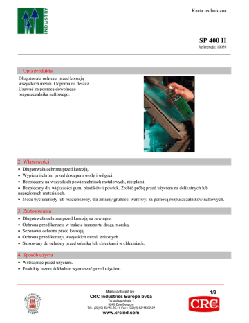 Karta techniczna SP 400 II Referencja: 10053 1. Opis produktu Długotrwała ochrona przed korozją wszystkich metali. Odporna na deszcz. Usuwać za pomocą dowolnego rozpuszczalnika naftowego. 2. Właściwości • Długotrwała ochrona przed korozją. • Wypiera i chroni przed dostępem wody i wilgoci. • Bezpieczny na wszystkich powierzchniach metalowych, nie plami. • Bezpieczny dla większości gum, plastików i powłok. Zrobić próbę przed użyciem na delikatnych lub naprężonych materiałach. • Może być usunięty lub rozcieńczony, dla zmiany grubości warstwy, za pomocą rozpuszczalników naftowych. 3. Zastosowania • • • • • Długotrwała ochrona przed korozją na zewnątrz. Ochrona przed korozją w trakcie transportu drogą morską. Sezonowa ochrona przed korozją. Ochrona przed korozją wszystkich metali żelaznych. Stosowany do ochrony przed solanką lub chlorkami w chłodniach. 4. Sposób użycia • Wstrząsnąć przed użyciem. • Produkty luzem dokładnie wymieszać przed użyciem. Manufactured by : CRC Industries Europe bvba Touwslagerstraat 1 9240 Zele Belgium Tél.: (32)(0) 52/45.60.11 Fax : (32)(0) 52/45.00.34 www.crcind.com 1/3 Karta techniczna SP 400 II Referencja: 10053 • Okresowo powtarzać w czasie stosowania. • Stosować wyłącznie przy odpowiedniej wentylacji. • Sprawdzić przed użyciem na delikatnych materiałach. • Nie stosować na urządzenia pod napięciem. • Nakładać na czystą, suchą powierzchnię. • Oczyścić dyszę aerozolu odwracając puszkę do góry dnem i wciskając przycisk aż do uwolnienia gazu pędnego. • Grubość warstwy może być regulowana przez rozcieńczanie rozpuszczalnikami naftowymi ale odporność na korozję zmienia się wraz z grubością warstwy. Przy stosowaniu w bardzo wilgotnych warunkach na początku użyć CRC 3-36 dla całkowitego wyparcia wilgoci. Następnie pozostawić na 2 - 4 godzin dla odparowania rozpuszczalnika przed nałożeniem SP400 II. • Karta charakterystyki zgodna z rozporządzeniem (WE) nr 1907/2006 art. 31 z poprawkami dostępna jest dla wszystkich produktów CRC. 5. Dane techniczne (bez gazu pędnego) Wygląd Color Odor Gęstość Temperatura zapłonu Auto Ignition temperature Operating temperature active product Czas schnięcia produktu Średnia waga powłoki Odporność produktu w komorze solnej Aerozol Wax. Bursztynowy. Charakterystyczny zapach. 0.865 g/cm3 (@ 20°C). < 0 °C > 200 °C max. 80 °C 60 - 120 min 10 - 50 µm at 50µ: >500 h luzem Wax. Bursztynowy. Charakterystyczny zapach. 0.874 g/cm3 (@ 20°C). > 40 °C > 200 °C max. 80 °C 60 - 120 min 10 - 50 µm at 50µ: >500 h 6. Opakowania Aerozol luzem 12x300 ML 12x500 ML 20 L 200 L 4x5 L 7. Uwagi Manufactured by : CRC Industries Europe bvba Touwslagerstraat 1 9240 Zele Belgium Tél.: (32)(0) 52/45.60.11 Fax : (32)(0) 52/45.00.34 www.crcind.com 2/3 Karta techniczna SP 400 II Referencja: 10053 Trwałość ochrony antykorozyjnej zależy głównie od przygotowania powierzchni i środowiska. Może to być do 1 roku na zewnątrz lub więcej niż 2 lata wewnątrz. Przy pierwszym użyciu należy okresowo kontrolować pojawianie się oznak korozji. Jeśli trwałość ochrony antykorozyjnej zostanie w konkretnych warunkach ustalona to można okresowo ponawiać użycie CRC SP400 II aby utrzymać ochronę powierzchni. Wszystkie dane przedstawione w tej karcie oparte są na naszym doświadczeniu i/lub testach laboratoryjnych. Z powodu różnorodności urządzeń i warunków pracy oraz nieprzewidywalnych zachowań ludzkich polecamy wcześniejsze przetestowanie produktu przed użyciem. Wszystkie informacje podane są w dobrej wierze, ale bez żadnej gwarancji. Informacje przedstawione w niniejszej Karcie Technicznej mogły ulec zmianie w wyniku zmian prawnych, zmiany składników lub nowych doświadczeń. Ostateczna i aktualna wersja Karty Technicznej może być przesłana na żądanie, jest także dostępna na naszej stronie internetowej: www.crcind.com. Zalecamy zarejestrowanie się na tej stronie, aby w przyszłości automatycznie otrzymywać uaktualnione wersje tej Karty Technicznej. CRC_GREEN-SP_400_II-20100428 Wersja Data 28/04/2010 Manufactured by : CRC Industries Europe bvba Touwslagerstraat 1 9240 Zele Belgium Tél.: (32)(0) 52/45.60.11 Fax : (32)(0) 52/45.00.34 www.crcind.com 3/3