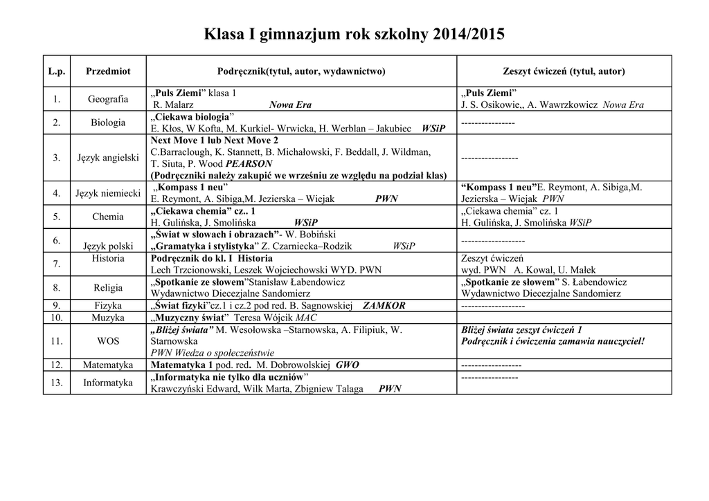 Klasa I gimnazjum rok szkolny 2014/2015 L.p. 1. 2. 3. 4. 5. 6. 7. 8. 9. 10. 11. 12. 13. Przedmiot Podręcznik(tytuł, autor, wydawnictwo) „Puls Ziemi” klasa 1 R. Malarz Nowa Era „Ciekawa biologia” Biologia E. Kłos, W Kofta, M. Kurkiel- Wrwicka, H. Werblan – Jakubiec WSiP Next Move 1 lub Next Move 2 C.Barraclough, K. Stannett, B. Michałowski, F. Beddall, J. Wildman, Język angielski T. Siuta, P. Wood PEARSON (Podręczniki należy zakupić we wrześniu ze względu na podział klas) „Kompass 1 neu” Język niemiecki E. Reymont, A. Sibiga,M. Jezierska – Wiejak PWN „Ciekawa chemia” cz.. 1 Chemia H. Gulińska, J. Smolińska WSiP „Świat w słowach i obrazach”- W. Bobiński Język polski „Gramatyka i stylistyka” Z. Czarniecka–Rodzik WSiP Historia Podręcznik do kl. I Historia Lech Trzcionowski, Leszek Wojciechowski WYD. PWN „Spotkanie ze słowem”Stanisław Łabendowicz Religia Wydawnictwo Diecezjalne Sandomierz Fizyka „Świat fizyki”cz.1 i cz.2 pod red. B. Sagnowskiej ZAMKOR Muzyka „Muzyczny świat” Teresa Wójcik MAC „Bliżej świata” M. Wesołowska –Starnowska, A. Filipiuk, W. WOS Starnowska PWN Wiedza o społeczeństwie Matematyka Matematyka 1 pod. red. M. Dobrowolskiej GWO „Informatyka nie tylko dla uczniów” Informatyka Krawczyński Edward, Wilk Marta, Zbigniew Talaga PWN Geografia Zeszyt ćwiczeń (tytuł, autor) „Puls Ziemi” J. S. Osikowie,, A. Wawrzkowicz Nowa Era -------------------------------“Kompass 1 neu”E. Reymont, A. Sibiga,M. Jezierska – Wiejak PWN „Ciekawa chemia” cz. 1 H. Gulińska, J. Smolińska WSiP ------------------Zeszyt ćwiczeń wyd. PWN A. Kowal, U. Małek „Spotkanie ze słowem” S. Łabendowicz Wydawnictwo Diecezjalne Sandomierz ------------------Bliżej świata zeszyt ćwiczeń 1 Podręcznik i ćwiczenia zamawia nauczyciel! ----------------------------------