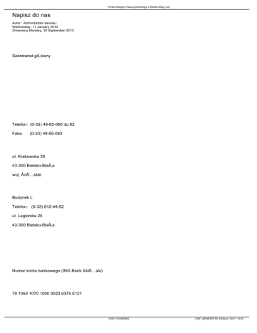 Portal Kolegium Nauczycielskiego w Bielsku-Bia�ej Napisz do nas Autor: Administrator serwisu Wednesday, 11 January 2012 Zmieniony Monday, 30 September 2013 Sekretariat gÅ‚ówny Telefon: (0-33) 49-65-060 do 62 Faks: (0-33) 49-65-063 ul. Krakowska 30 43-300 Bielsko-BiaÅ‚a woj. Å›lÄ…skie Budynek L Telefon: (0-33) 812-49-52 ul. Legionów 25 43-300 Bielsko-BiaÅ‚a Numer konta bankowego (ING Bank ÅšlÄ…ski) 79 1050 1070 1000 0023 6375 5121 _PDF_POWERED _PDF_GENERATED 8 March, 2017, 14:23 Portal Kolegium Nauczycielskiego w Bielsku-Bia�ej PÅ‚atność za: czesne, duplikaty, powtarzanie i akademik. Zeskanuj kod i dodaj KN do kontaktów swojego telefonu: _PDF_POWERED _PDF_GENERATED 8 March, 2017, 14:23