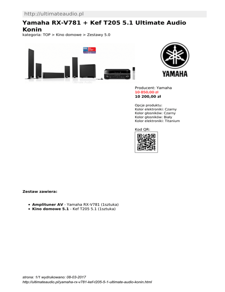 http://ultimateaudio.pl Yamaha RX-V781 + Kef T205 5.1 Ultimate Audio Konin kategoria: TOP > Kino domowe > Zestawy 5.0 Producent: Yamaha 10 850,00 zł 10 200,00 zł Opcje produktu: Kolor elektroniki: Czarny Kolor głosników: Czarny Kolor głosników: Biały Kolor elektroniki: Titanium Kod QR: Zestaw zawiera: Amplituner AV - Yamaha RX-V781 (1sztuka) Kino domowe 5.1 - Kef T205 5.1 (1sztuka) strona: 1/1 wydrukowano: 08-03-2017 http://ultimateaudio.pl/yamaha-rx-v781-kef-t205-5-1-ultimate-audio-konin.html