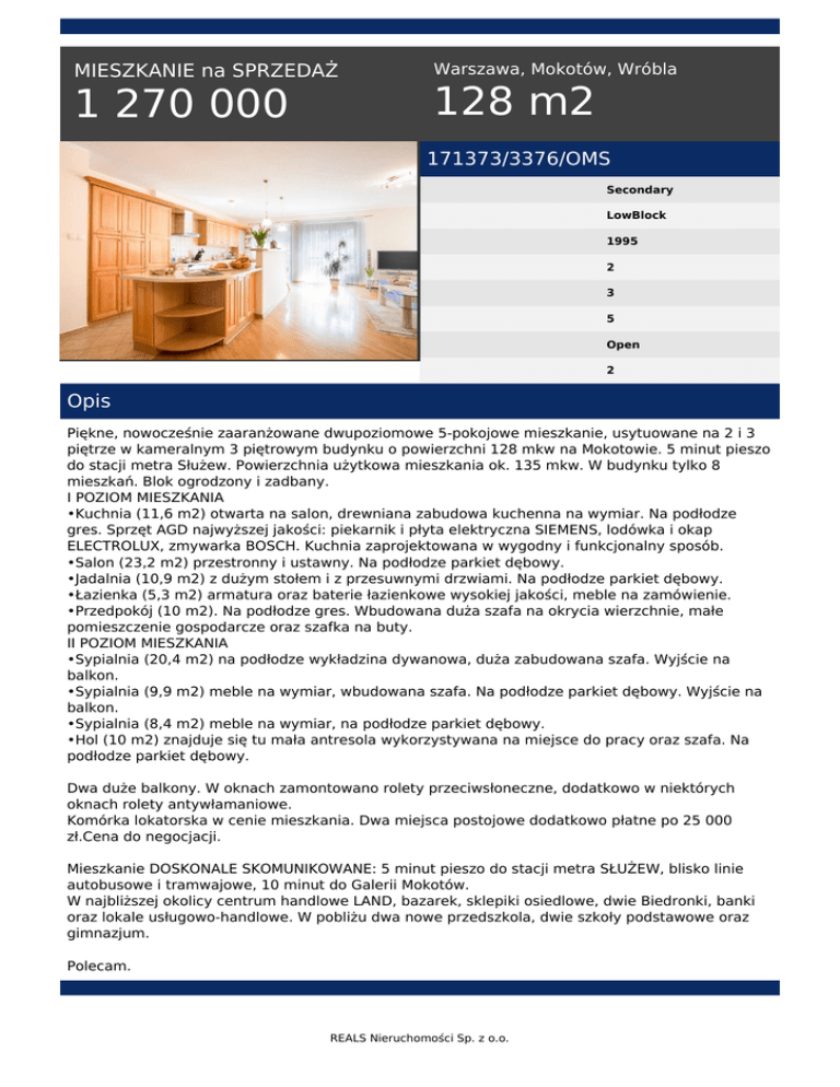 MIESZKANIE na SPRZEDAŻ 1 270 000 Warszawa, Mokotów, Wróbla 128 m2 171373/3376/OMS Secondary LowBlock 1995 2 3 5 Open 2 Opis Piękne, nowocześnie zaaranżowane dwupoziomowe 5-pokojowe mieszkanie, usytuowane na 2 i 3 piętrze w kameralnym 3 piętrowym budynku o powierzchni 128 mkw na Mokotowie. 5 minut pieszo do stacji metra Służew. Powierzchnia użytkowa mieszkania ok. 135 mkw. W budynku tylko 8 mieszkań. Blok ogrodzony i zadbany. I POZIOM MIESZKANIA •Kuchnia (11,6 m2) otwarta na salon, drewniana zabudowa kuchenna na wymiar. Na podłodze gres. Sprzęt AGD najwyższej jakości: piekarnik i płyta elektryczna SIEMENS, lodówka i okap ELECTROLUX, zmywarka BOSCH. Kuchnia zaprojektowana w wygodny i funkcjonalny sposób. •Salon (23,2 m2) przestronny i ustawny. Na podłodze parkiet dębowy. •Jadalnia (10,9 m2) z dużym stołem i z przesuwnymi drzwiami. Na podłodze parkiet dębowy. •Łazienka (5,3 m2) armatura oraz baterie łazienkowe wysokiej jakości, meble na zamówienie. •Przedpokój (10 m2). Na podłodze gres. Wbudowana duża szafa na okrycia wierzchnie, małe pomieszczenie gospodarcze oraz szafka na buty. II POZIOM MIESZKANIA •Sypialnia (20,4 m2) na podłodze wykładzina dywanowa, duża zabudowana szafa. Wyjście na balkon. •Sypialnia (9,9 m2) meble na wymiar, wbudowana szafa. Na podłodze parkiet dębowy. Wyjście na balkon. •Sypialnia (8,4 m2) meble na wymiar, na podłodze parkiet dębowy. •Hol (10 m2) znajduje się tu mała antresola wykorzystywana na miejsce do pracy oraz szafa. Na podłodze parkiet dębowy. Dwa duże balkony. W oknach zamontowano rolety przeciwsłoneczne, dodatkowo w niektórych oknach rolety antywłamaniowe. Komórka lokatorska w cenie mieszkania. Dwa miejsca postojowe dodatkowo płatne po 25 000 zł.Cena do negocjacji. Mieszkanie DOSKONALE SKOMUNIKOWANE: 5 minut pieszo do stacji metra SŁUŻEW, blisko linie autobusowe i tramwajowe, 10 minut do Galerii Mokotów. W najbliższej okolicy centrum handlowe LAND, bazarek, sklepiki osiedlowe, dwie Biedronki, banki oraz lokale usługowo-handlowe. W pobliżu dwa nowe przedszkola, dwie szkoły podstawowe oraz gimnazjum. Polecam. REALS Nieruchomości Sp. z o.o. Centrala Jadwiga Chodanionek tel. 531 006 511 tel. 22 829 92 10 email: [email protected] REALS Nieruchomości Sp. z o.o. Powered by TCPDF (www.tcpdf.org)