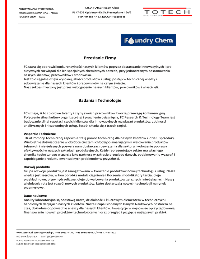 AUTORYZOWANY DYSTRYBUTOR: ROLLWASCH ITALIANA S.P.A. – Albiate FOUNDRY CHEM – Torino F.H.U. TOTECH Adam Kilian PL 47-232 Kędzierzyn-Koźle, Przemysława II 2e/2 NIP 749-183-47-63, REGON 160289545 Przesłanie Firmy FC stara się poprawid konkurencyjnośd naszych klientów poprzez dostarczanie innowacyjnych i pro aktywnych rozwiązao dla ich specjalnych chemicznych potrzeb, przy jednoczesnym poszanowaniu naszych klientów, pracowników i środowiska. Jest to osiągalne dzięki wysokiej jakości produktów i usług, postęp w technicznej wiedzy i zobowiązanie dla naszych klientów i pracowników na całym świecie. Nasz sukces mierzony jest przez wzbogacenie naszych klientów, pracowników i właścicieli. Badania i Technologie FC uznaje, iż to zbiorowe talenty i czyny swoich pracowników tworzą przewagę konkurencyjną. Połączenie silnej kultury organizacyjnej i pragnienie osiągnięcia, FC Research & Technology Team jest budowanie silnej reputacji swoich klientów dla innowacyjnych rozwiązao produktów, zdolności analitycznych i niezawodnych usług. Zespół składa się z trzech części. Wsparcie Techniczne Dział Pomocy Technicznej zapewnia stałą pomoc techniczną dla naszych klientów i działu sprzedaży. Wieloletnie doświadczenie w obróbce cieczami chłodząco-smarującymi i walcowania produktów żelaznych i nie-żelaznych pozwala nam dostarczad rozwiązania dla sektoru i wdrożenie poprawy efektywności w naszych zakładach produkcyjnych. Każdy reprezentujący sektor ma własnego chemika technicznego wsparcia jako partnera w zakresie przeglądu danych, podejmowaniu wyzwao i zapobieganie produktu ewentualnych problemów w przyszłości. Rozwój produktu Grupa rozwoju produktu jest zaangażowana w tworzenie produktów nowej technologii i usług. Nasza wiedza jest szeroka, w tym obróbka metali, ciągnienie i tłoczenie, modyfikatory tarcia, oleje przekładniowe, płyny hydrauliczne, oleje do walcowania produktów żelaznych i nie-żelaznych. Naszą wieloletnią rolą jest rozwój nowych produktów, które dostarczają nowych technologii na rynek przemysłowy. Dane naukowe Analizy laboratoryjna są podstawą naszej działalności i kluczowym elementem w technicznych i handlowych decyzjach naszych klientów. Nasza Grupa Globalnych Danych Naukowych dostarcza na czas, dokładnie odpowiednie analizy dla naszych klientów. Inwestycje w najnowsze oprzyrządowanie, finansowanie nowych projektów technologicznych oraz przegląd i przyjęcie najlepszych praktyk. www.totech.pl, [email protected], T +48 502377131, T +48 504153844, T/F +48 77 4871122 ING BANK ŚLĄSKI S.A. SWIFT (BIC) INGBPLPW PLN 73 1050 1517 1000 0090 7056 7087 EUR 77 1050 1517 1000 0090 7801 0213 1 AUTORYZOWANY DYSTRYBUTOR: ROLLWASCH ITALIANA S.P.A. – Albiate FOUNDRY CHEM – Torino F.H.U. TOTECH Adam Kilian PL 47-232 Kędzierzyn-Koźle, Przemysława II 2e/2 NIP 749-183-47-63, REGON 160289545 Odlewanie kokilowe (ciśnieniowe) FC oferuje kompletną linię nowej generacji dla przemysłu odlewania. Zmniejszenie twoich kosztów operacyjnych, nadawanie elastyczności aplikacji i rozwiązywanie Waszych problemów są mocnymi stronami FC. Nasze innowacyjne Termiczne Odlewanie środków przeciwkorozyjnych oferuje znaczące korzyści: Redukcja odpadów w skutek plam, jakości wykooczenia powierzchni i porowatości Poprawa jakości to oszczędnośd twoich pieniędzy. Nasze środki przeciwkorozyjne są stworzone by zapewnid doskonałe pozostawienie i zoptymalizowane wykooczenia powierzchni. Nasi eksperci mogą pomóc Ci w wyborze właściwego smaru i metody aplikacji w celu zminimalizowania odpadów i wyprodukowania elementów mogących się malowad, mogących pokrywad się innym materiałem z wyglądem, jakiego potrzebujesz. Redukcja przestojów do czyszczenia Odlewanie ciśnieniowe mówi nam, iż potrzeba jest produktów, które działają w czystości. Nasze środki przeciwkorozyjne nie tylko pozostawiają minimalne resztki na tłocznikach, rdzeniach, otworach wentylacyjnych i liniach zasilających, usuwają woskowe, olejowe resztki pozostawione przez inne środki przeciwkorozyjne. Szerokie okna operatywności Termiczne Odlewanie środków przeciwkorozyjnych toleruje szeroki zakres temperatur tłocznika i rozmaitośd złożoności części. Zwiększają one również tolerancję na zmiany w innych parametrach procesu. Mniej kwestii środowiskowych, zdrowia i bezpieczeostwa Szacunek dla środowiska oraz podmiotu zdrowia i bezpieczeostwa są najważniejsze we wszystkim, co robimy. Włączenie funkcji, takich jak niski dym, wolnośd od fenolu oraz odpornośd biologiczny zapach, nasze produkty są przyjemne w użyciu i przyjazne dla środowiska. Ilościowa poprawa wydajności Zmniejszone stawki odpadów Ulepszony wygląd zewnętrzny Ostateczne rozwiązanie problemu www.totech.pl, [email protected], T +48 502377131, T +48 504153844, T/F +48 77 4871122 ING BANK ŚLĄSKI S.A. SWIFT (BIC) INGBPLPW PLN 73 1050 1517 1000 0090 7056 7087 EUR 77 1050 1517 1000 0090 7801 0213 2 AUTORYZOWANY DYSTRYBUTOR: ROLLWASCH ITALIANA S.P.A. – Albiate FOUNDRY CHEM – Torino F.H.U. TOTECH Adam Kilian PL 47-232 Kędzierzyn-Koźle, Przemysława II 2e/2 NIP 749-183-47-63, REGON 160289545 Smary do kucia Produkty na bazie grafitu Na bazie oleju ODLEWANIE w zakresie ropy naftowej i na bazie estru związków grafitu są dostępne w szerokiej gamie lepkości, w tym pół-wklejanych preparatów do ciężkiego wytłaczania do przodu i wstecz. Lżejsze mieszanki grafitu, estru i oleju mineralnego zostały opracowane do kucia, tłoczenia na gorąco aluminium i komponentów mosiądzu, w tym trudne formy dla przemysłu lotniczego i motoryzacyjnego. Na bazie wody Przy produkcji odkuwek precyzyjnych, w pobliżu odkuwek sieciowych lub odkuwek, które wymagają dobrego wykooczenia powierzchni i wysokiej tolerancji, takich jak korbowody, wały korbowe, osie lub elementy układu kierowniczego, ODLEWANIE WG w zakresie grafitu na bazie wody smary kokilowe oferuj