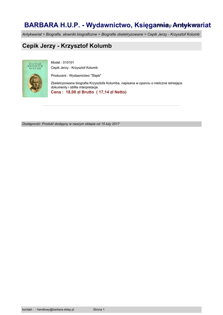 Utworzono Antykwariat : 08 marzec 2017 BARBARA H.U.P. - Wydawnictwo, Księgarnia, Antykwariat > Biografie, słowniki biograficzne > Biografie zbeletryzowane > Cepik Jerzy - Krzysztof Kolumb Cepik Jerzy - Krzysztof Kolumb Model : 010101 Cepik Jerzy - Krzysztof Kolumb Producent : Wydawnictwo "Śląsk" Zbeletryzowana biografia Krzysztofa Kolumba, napisana w oparciu o nieliczne istniejące dokumenty i obfite interpretacje. Cena : 18,00 zł Brutto ( 17,14 zł Netto) Dostępność: Produkt dostępny w naszym sklepie od 15 luty 2017 kontakt : - [email protected] Strona 1